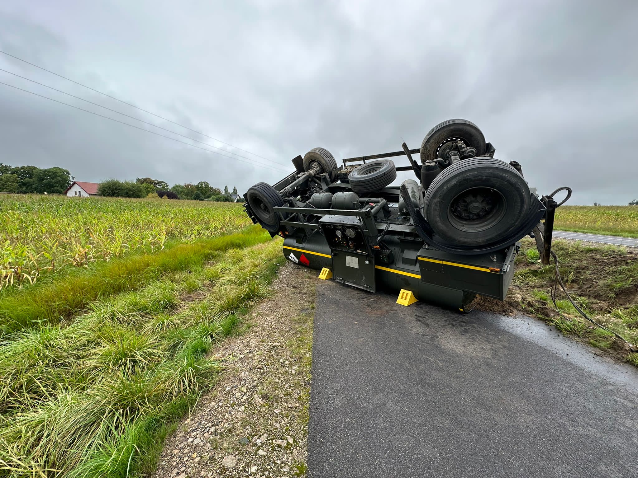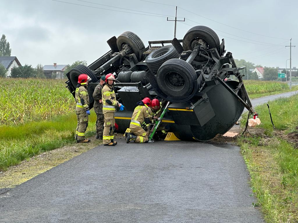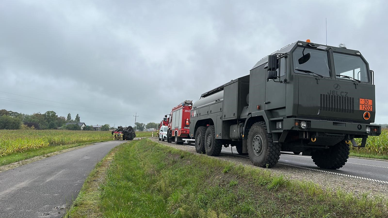 Przyczepa wpadła do rowu i doszło do niewielkiego wycieku paliwa, który szybko udało się opanować. Olej napędowy został przepompowany do podstawionej autocysterny, a uszkodzony pojazd odholowany przez pomoc drogową.