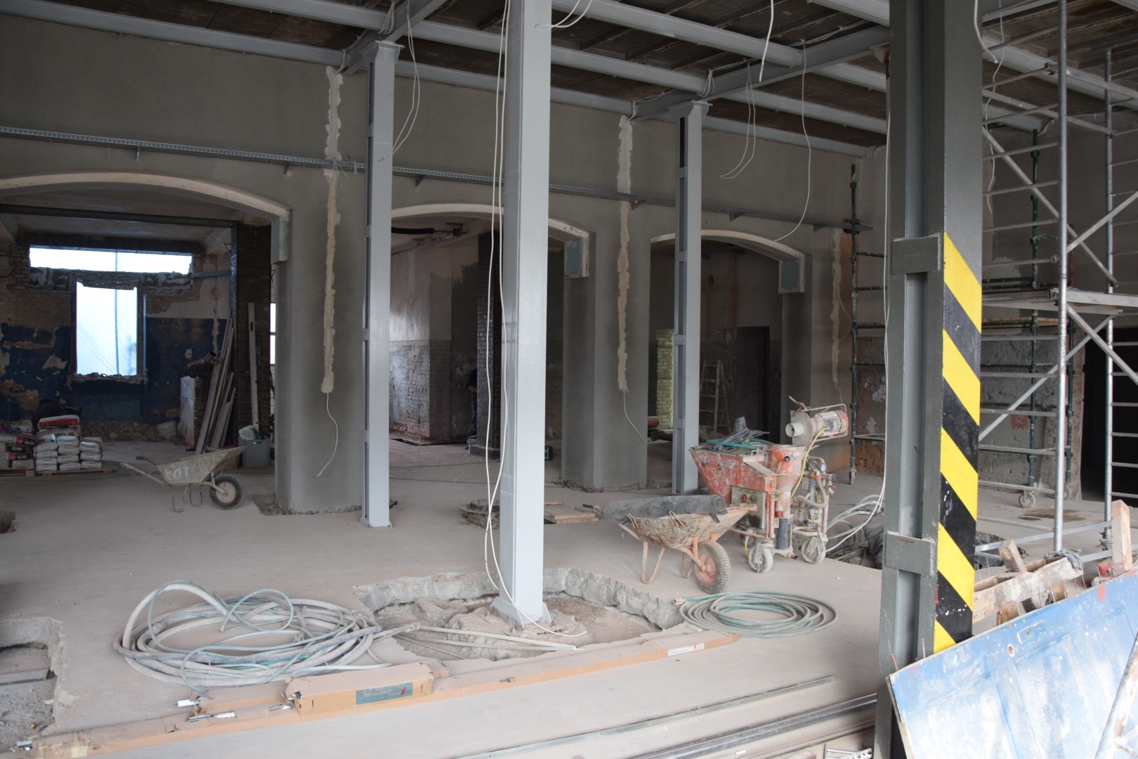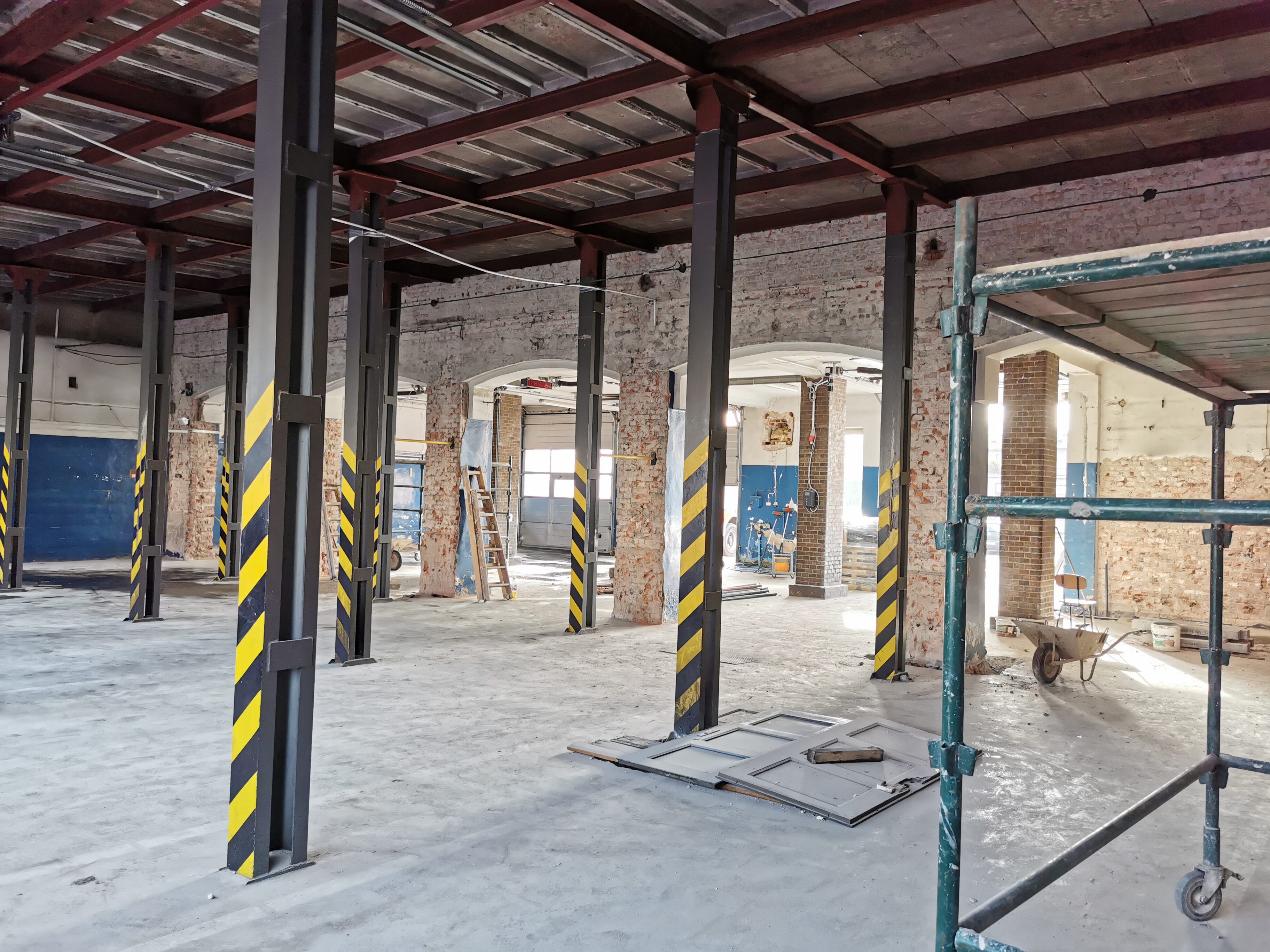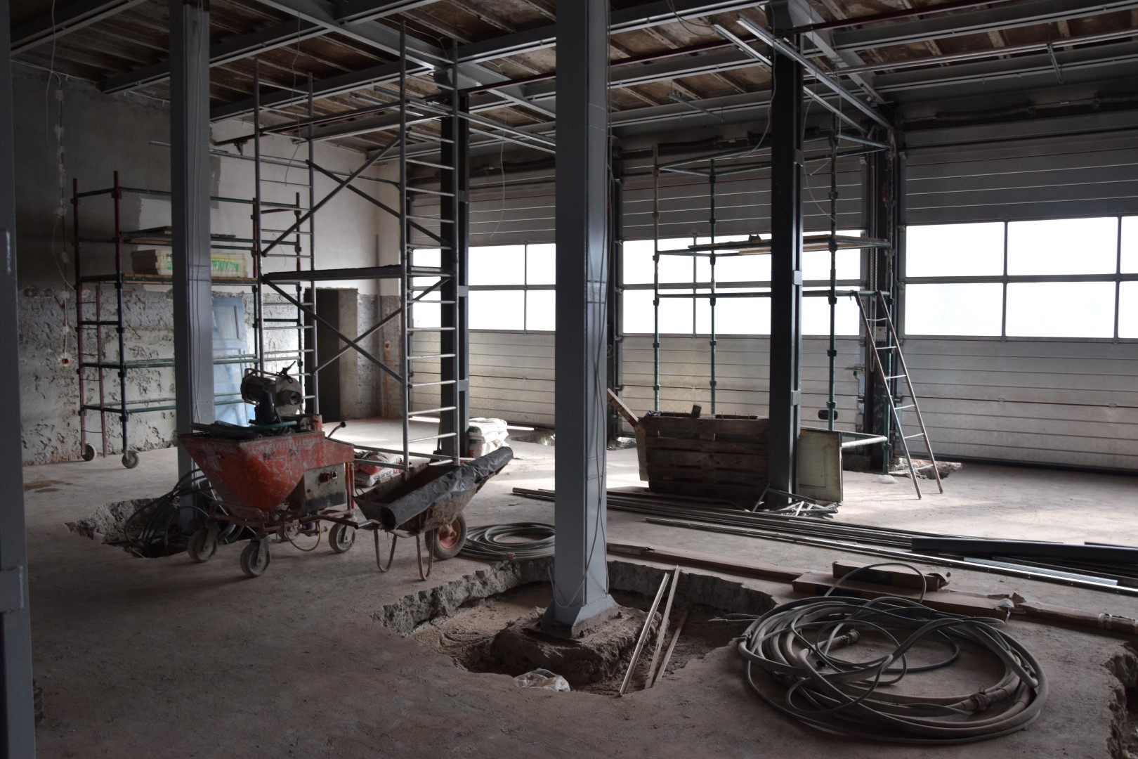 Umowę na wykonanie prac podpisano w lutym. Prace remontowe mają bardzo duży zakres. Do tej pory ze ścian skuto tynki, trwa montaż instalacji elektrycznej. Zdemontowano podwieszany sufit. Wymontowano okno, w którego miejscu zostanie zamontowana nowa brama. Otynkowano fragmenty ścian garażu głównego i ściany w pomieszczeniach, w których będą szatnie. Wzmocniono stalowe słupy, które podtrzymują strop.