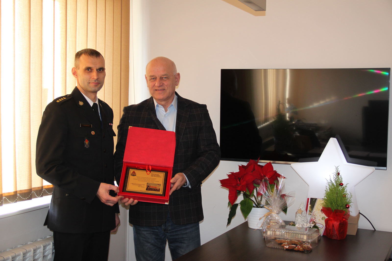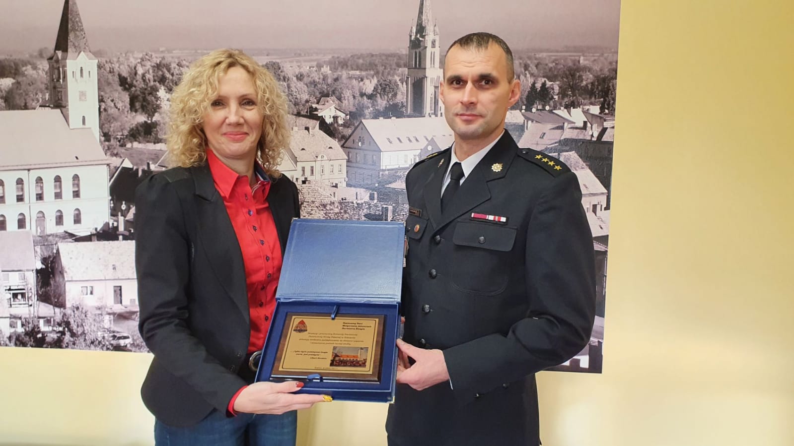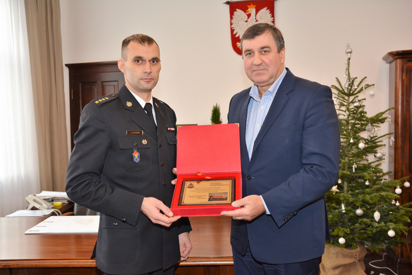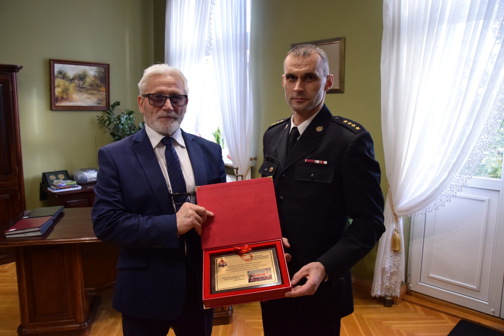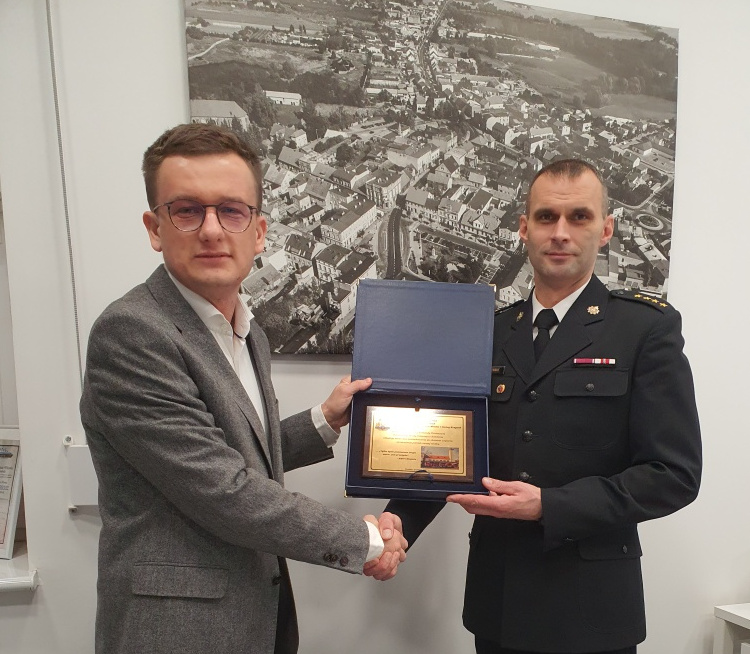 W ramach podziękowania za wspólną pracę na rzecz poprawy bezpieczeństwa w powiecie kościańskim, za okazane wsparcie i zrozumienie potrzeb strażackiej służby st. kpt. Szymon Klemenski - Komendant Powiatowy PSP w Kościanie złożył na ręce włodarzy jednostek samorządowych powiatu kościańskiego okolicznościowe grawertony.