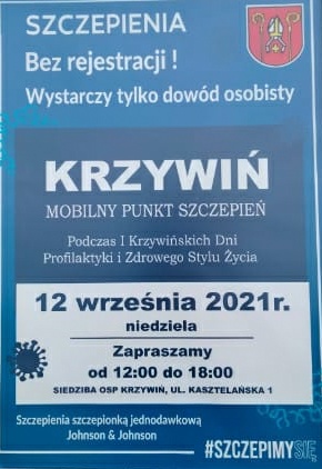W niedziele 12 września w siedzibie jednostka OSP Krzywiń zorganizowała mobilny punkt szczepień. Z możliwości zaszczepienia się jednodawkową szczepionką Johnson & Johnson skorzystało 55 osób.