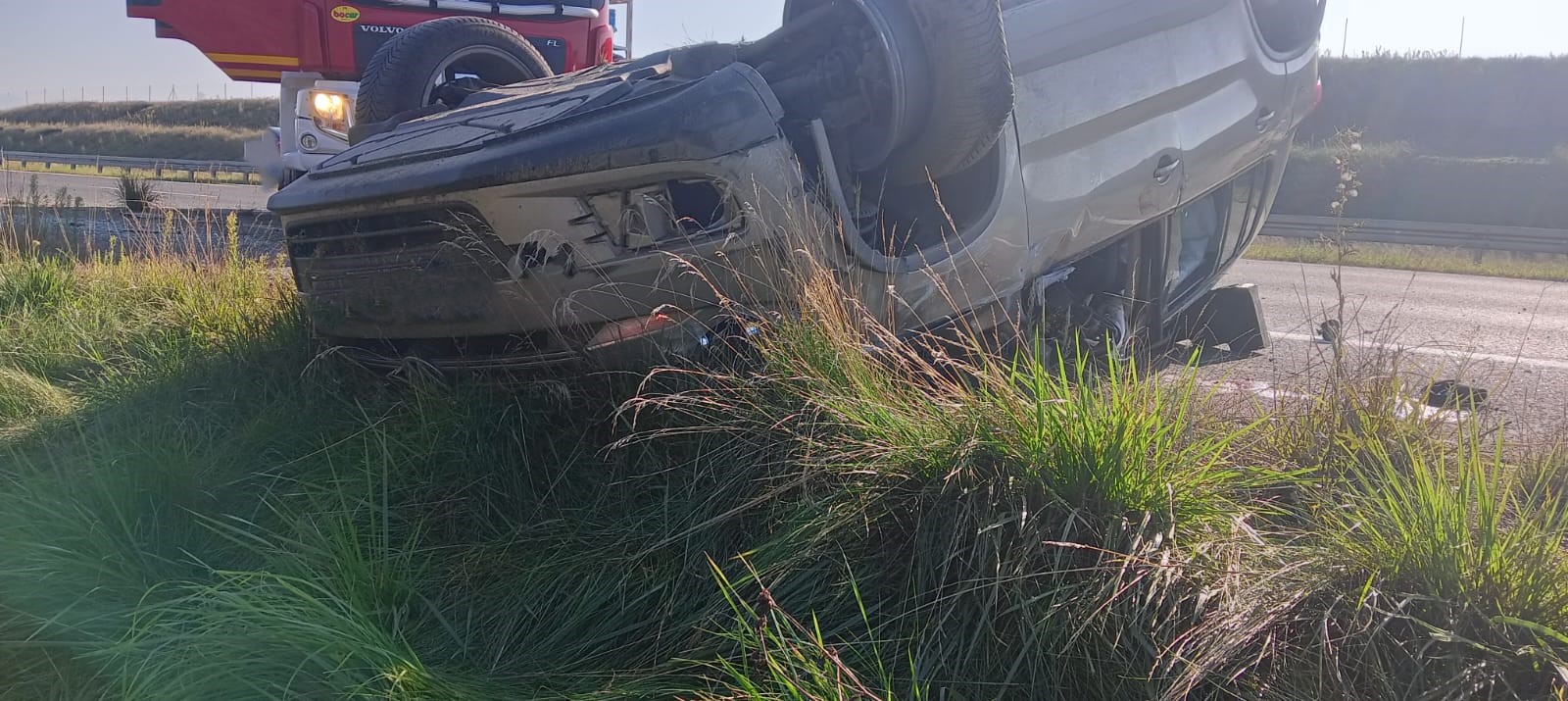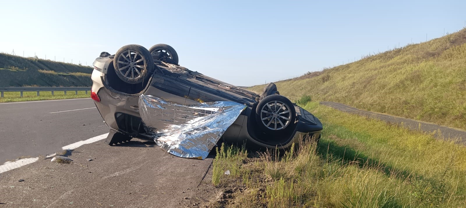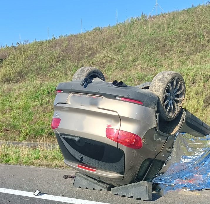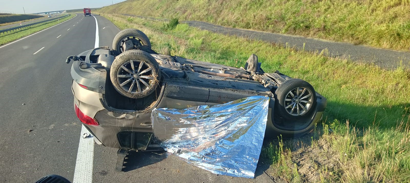 Samochód osobowy wypadł z drogi i dachował. Pojazdem podróżowały trzy osoby. Kierowca, który nieprzytomny znajdował się w pojeździe oraz dwie osoby, które przed przybyciem służb opuściły auto. Pierwszej pomocy poszkodowanym udzielił przejeżdżający ratownik medyczny. Następnie strażacy wsparli te działania. Na miejsce przybył śmigłowiec Lotniczego Pogotowia Ratunkowego oraz Zespół Ratownictwa Medycznego. Po przebadaniu przez lekarza kierowcy pojazdu stwierdzono zgon, natomiast pozostali dwaj poszkodowani zostali zabrani do szpitala.