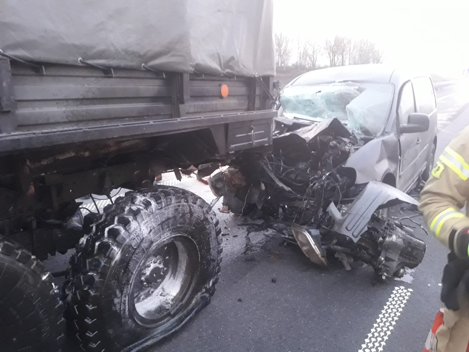 Informację o wypadku otrzymaliśmy 8 lutego o godz. 5.31. Kierujący osobówką 56-latek wjechał w tył wojskowej ciężarówki, prowadzonej przez 36-letniego mężczyznę. Obaj kierowcy opuścili auta o własnych siłach, przed przybyciem służb ratowniczych. Strażacy udzielili pomocy poszkodowanym. Przybyły na miejsce Zespół Ratownictwa Medycznego zdecydował o przewiezieniu kierowcy samochodu osobowego na dalsze badania do kościańskiego szpitala. Po wykonaniu czynności dochodzeniowych przez Policję, strażacy wspólnie z załogą pomocy drogowej usunęli wrak oraz oczyścili jezdnię z pozostałości powypadkowych.