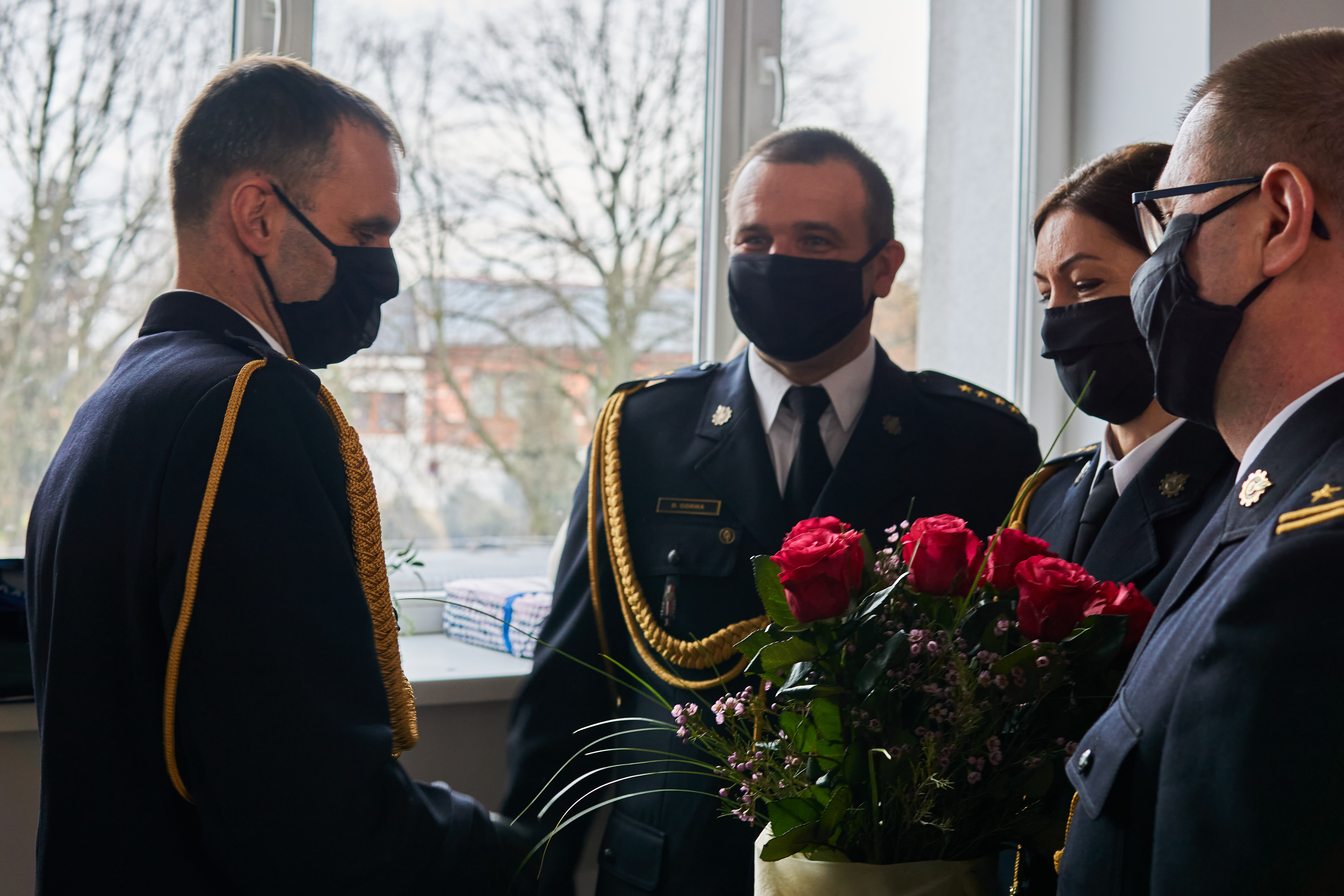 Zebrani Goście oraz załoga Komendy dziękowali zdającemu obowiązki st. bryg. Andrzejowi Zieglerowi za lata służby, dobra współpracę i wkład w bezpieczeństwo mieszkańców Ziemi Kościańskiej. Z kolei kpt. Szymon Klemenski odbierał gratulacje z okazji awansu oraz życzenia realizacji zamierzonych celów.