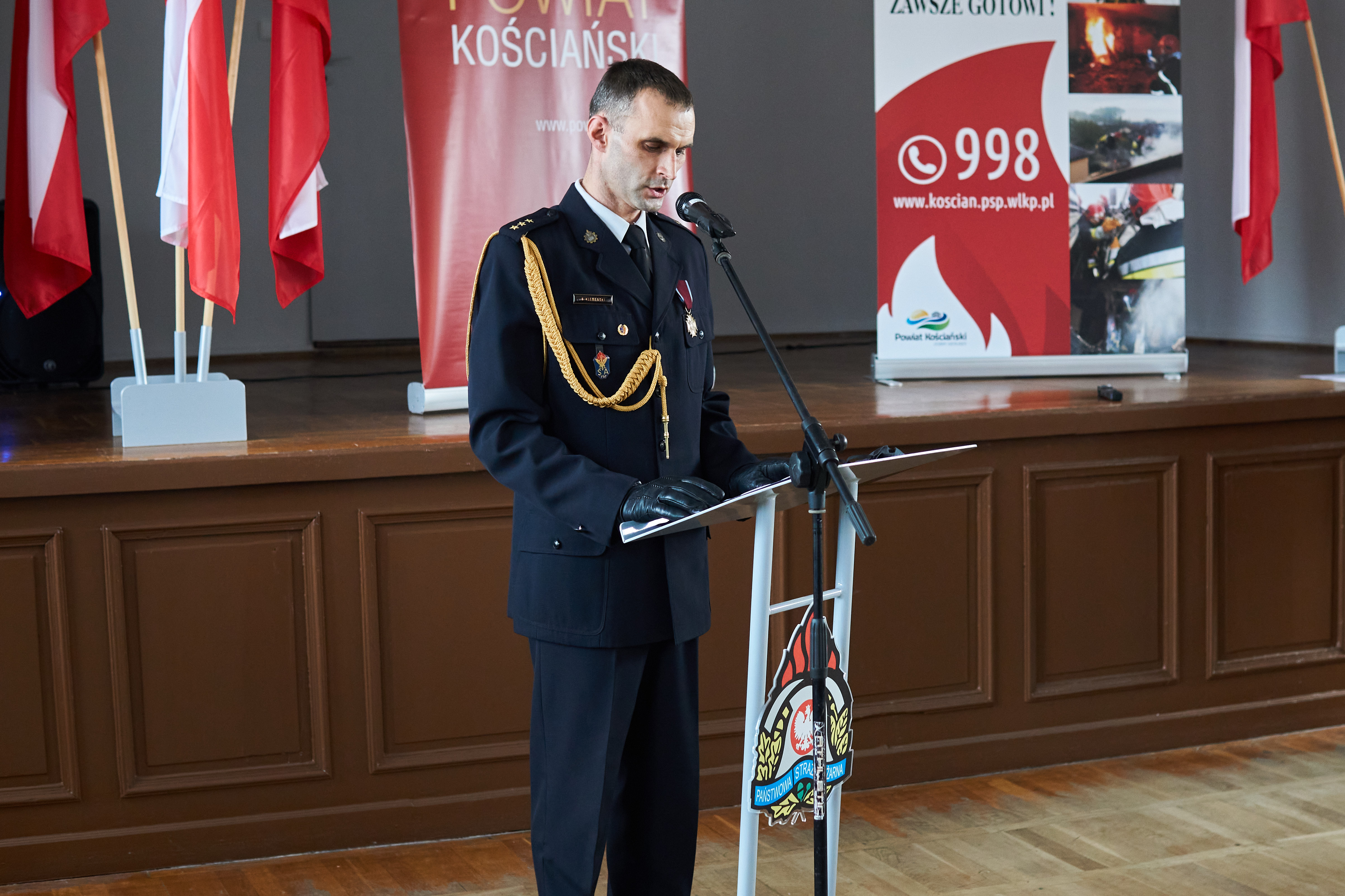 Uroczystość rozpoczęła się od złożenia meldunku Z-cy Wielkopolskiego Komendanta Wojewódzkiego PSP bryg. Jarosławowi Zamelczykowi. Po odegraniu hymnu nastąpiła główna część uroczystości. St. kpt. Damian Gorwa przedstawił przebieg 35 – letniej służby st. bryg. Andrzeja Zieglera, dotychczasowego Komendanta Powiatowego PSP w Kościanie. Następnie po odczytaniu aktów odwołania i powierzenia obowiązków Komendanci złożyli Z-cy Wielkopolskiego Komendanta Wojewódzkiego PSP bryg. Jarosławowi Zamelczykowi meldunki o zdaniu i przyjęciu obowiązków. Pełnienie obowiązków Komendanta Powiatowego PSP w Kościanie powierzono kpt. Szymonowi Klemenskiemu, dotychczas pełniącemu służbę jako Dowódca Jednostki Ratowniczo-Gaśniczej w Kościanie. W swym przemówieniu st. bryg. Andrzej Ziegler podziękował wszystkim za lata służby, pomoc i współpracę. Kpt. Szymon Klemenski zabierając głos podziękował za awans i zadeklarował, że zrobi wszystko aby nie zawieść przełożonych a także załogi Komendy.