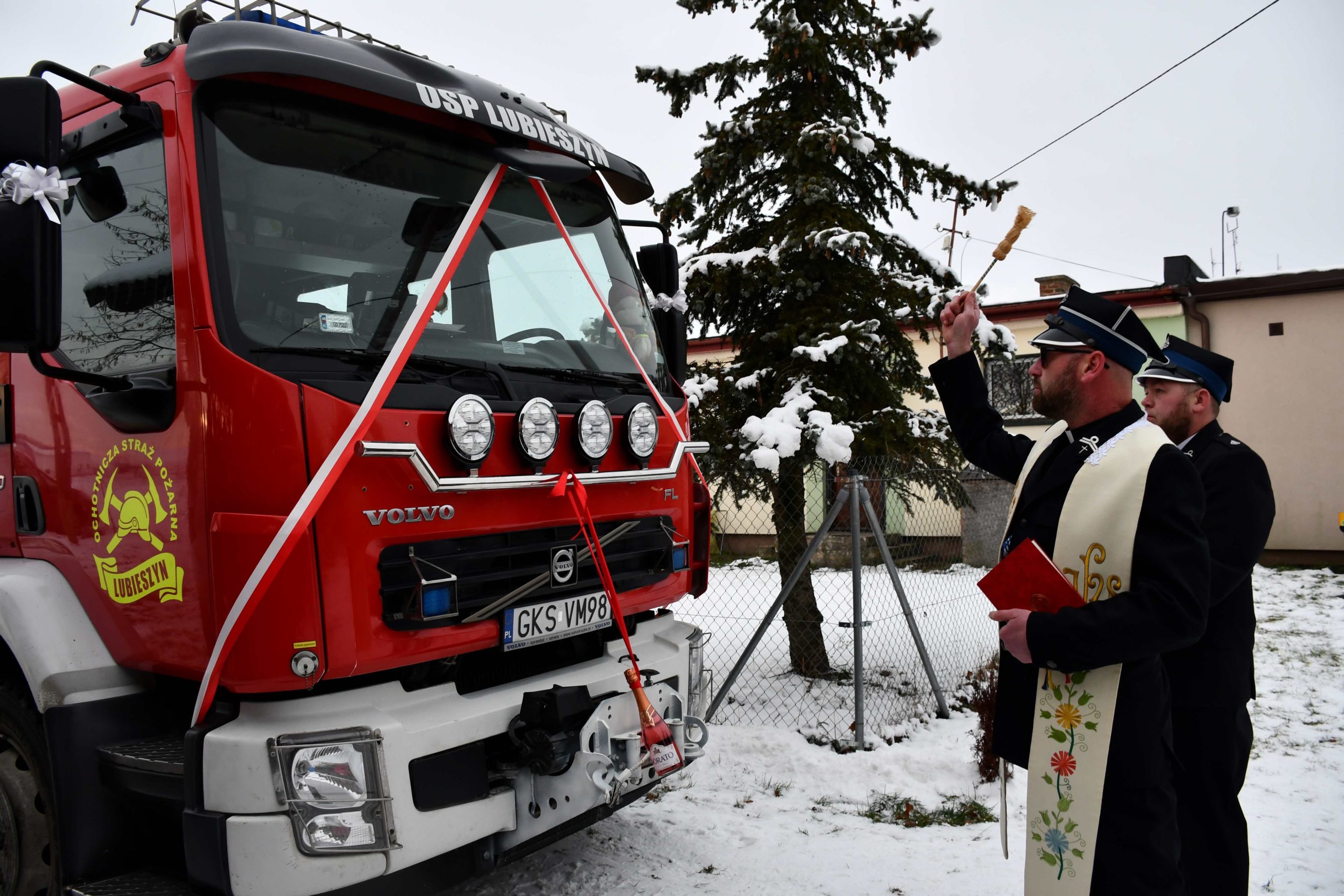 Pierwsza część uroczystości odbyła się przy remizie OSP, gdzie dokonano oficjalnego przekazania pojazdu przez Pomorskiego Komendanta Wojewódzkiego nadbryg. Piotra Sochę, Starostę Kościerskiego Alicję Żurawską oraz Wójta Gminy Liniewo Mirosława Warczaka. Po oficjalnym przekazaniu pojazdu nastąpiło jego poświęcenie przez Księdza kustosza Mateusza Draszanowskiego.