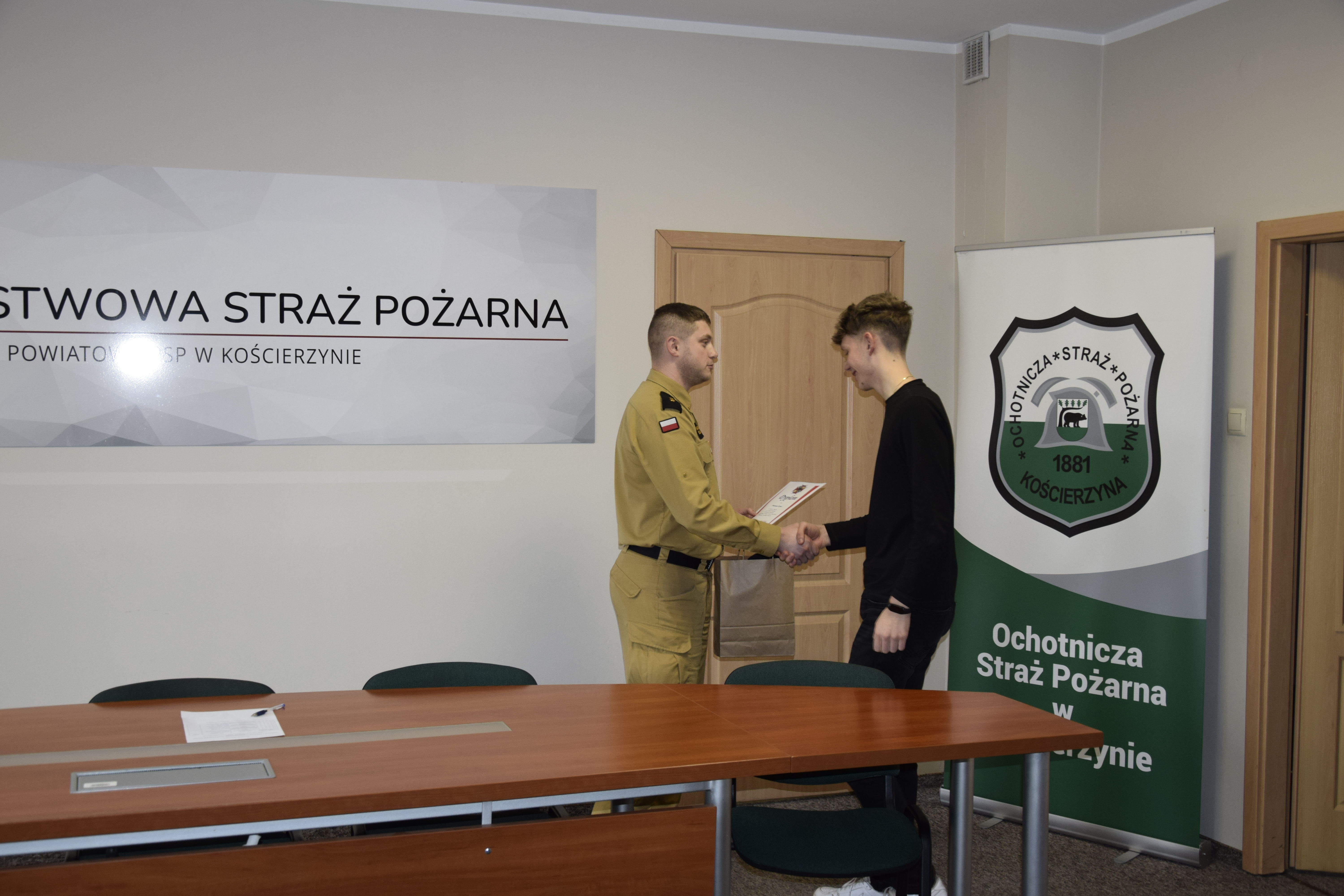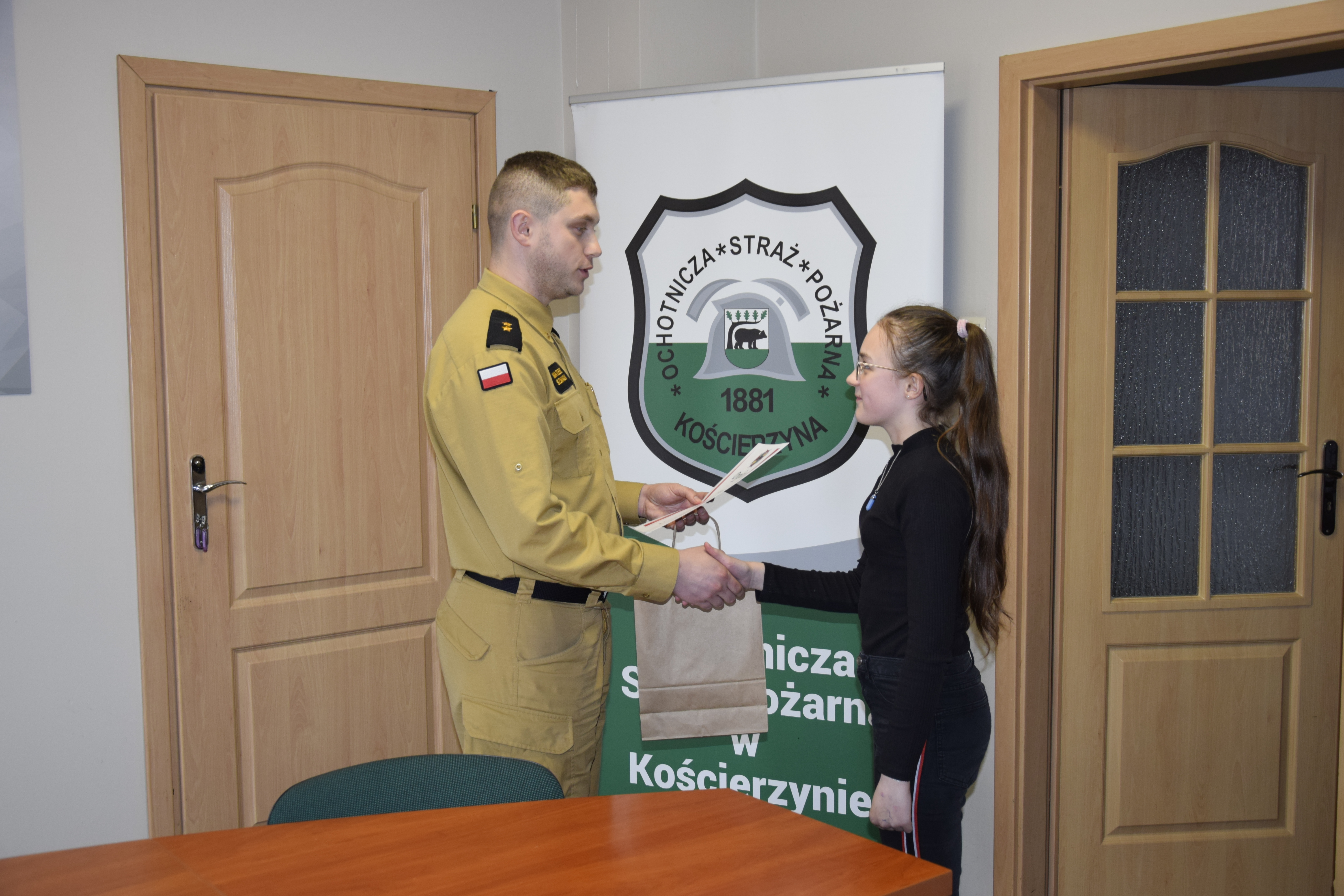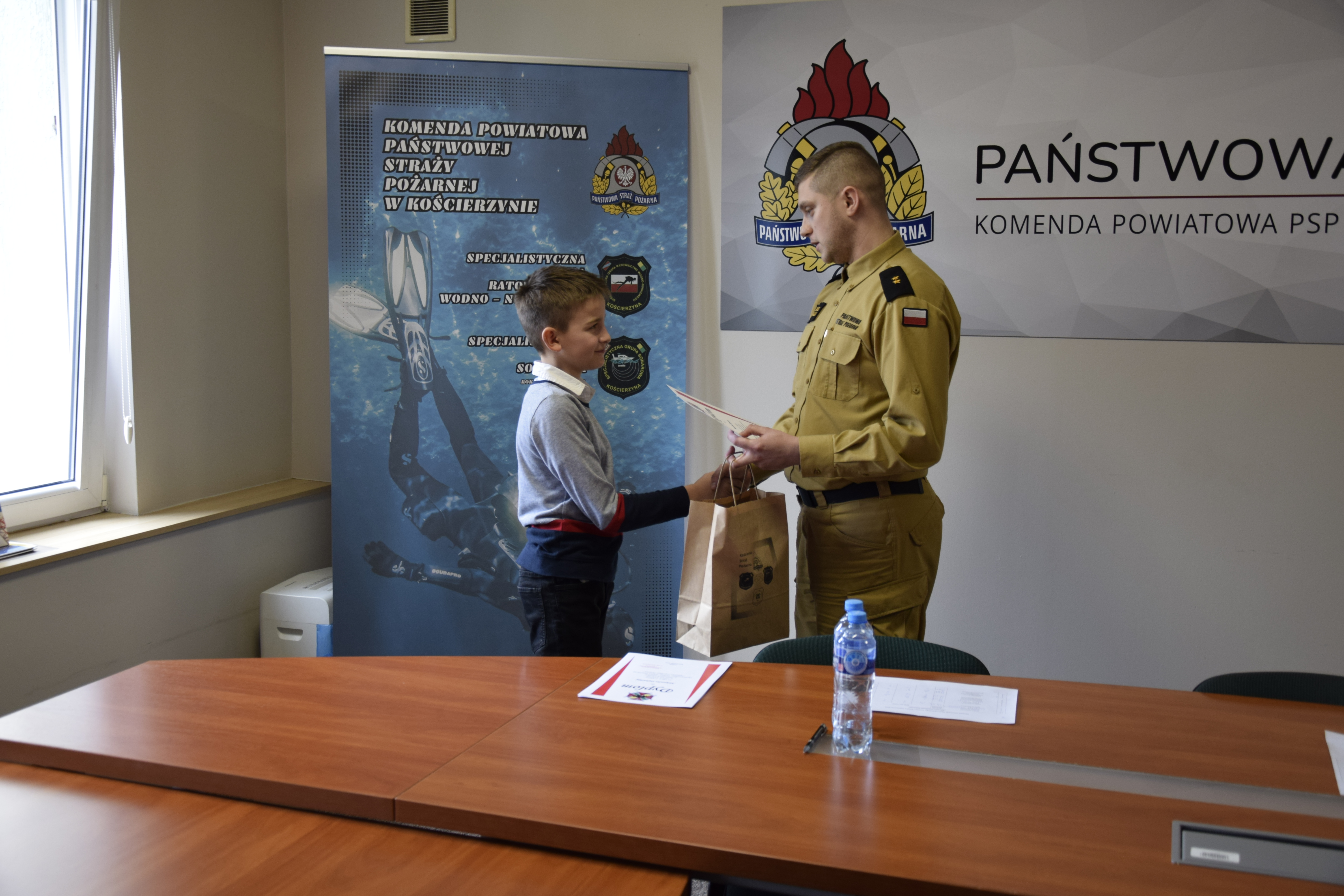 Nagrody dla laureatów oraz startujących, w imieniu Komendanta Powiatowego Państwowej Straży Pożarnej w Kościerzynie mł. bryg. Rafała Duzowskiego, wręczył mł. kpt. Mateusz Szmaglik - przewodniczący komisji turnieju. Nagrody dla uczestników ufundowała Gmina Miejska Kościerzyna oraz Nadleśnictwo Kościerzyna.