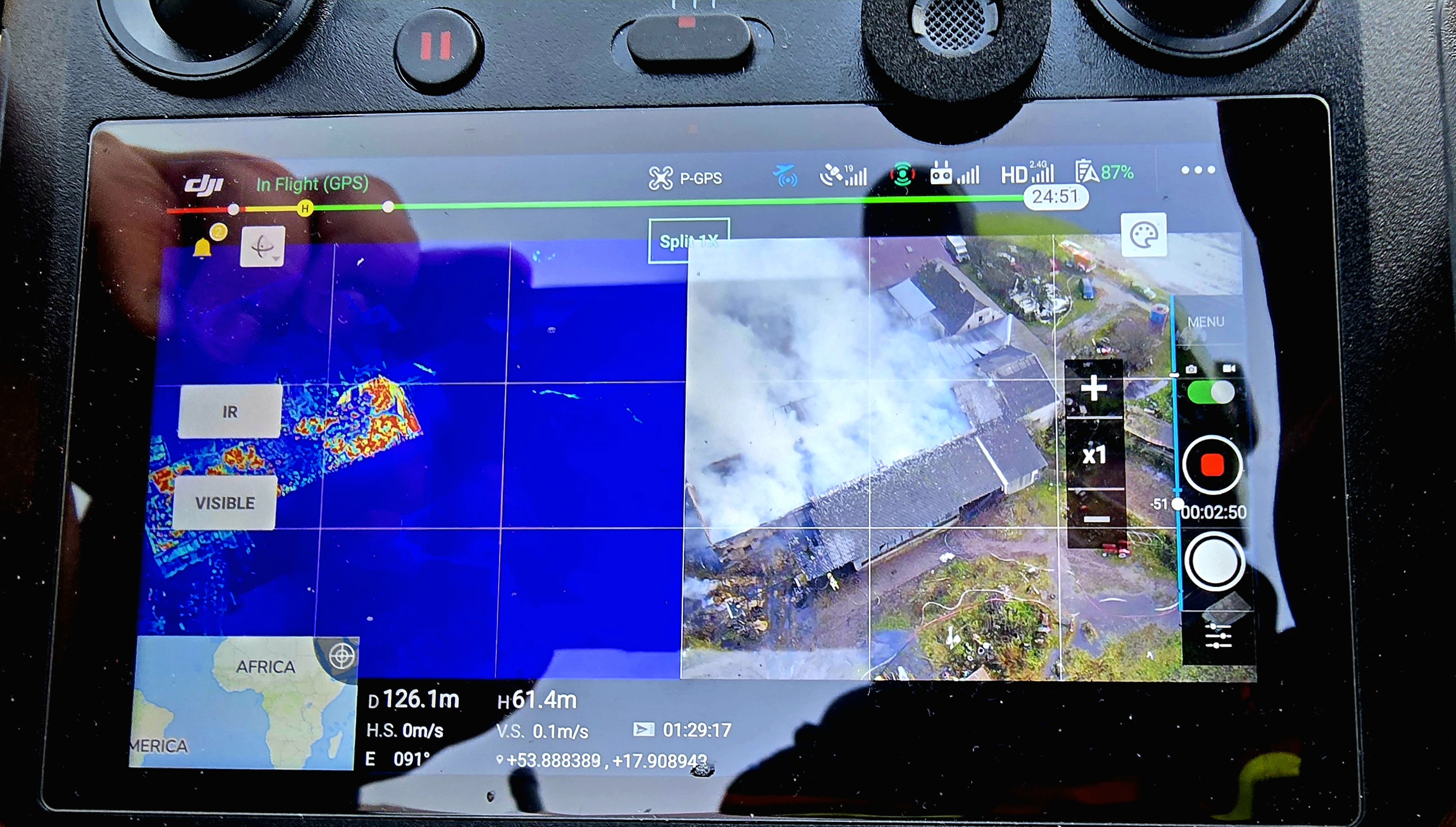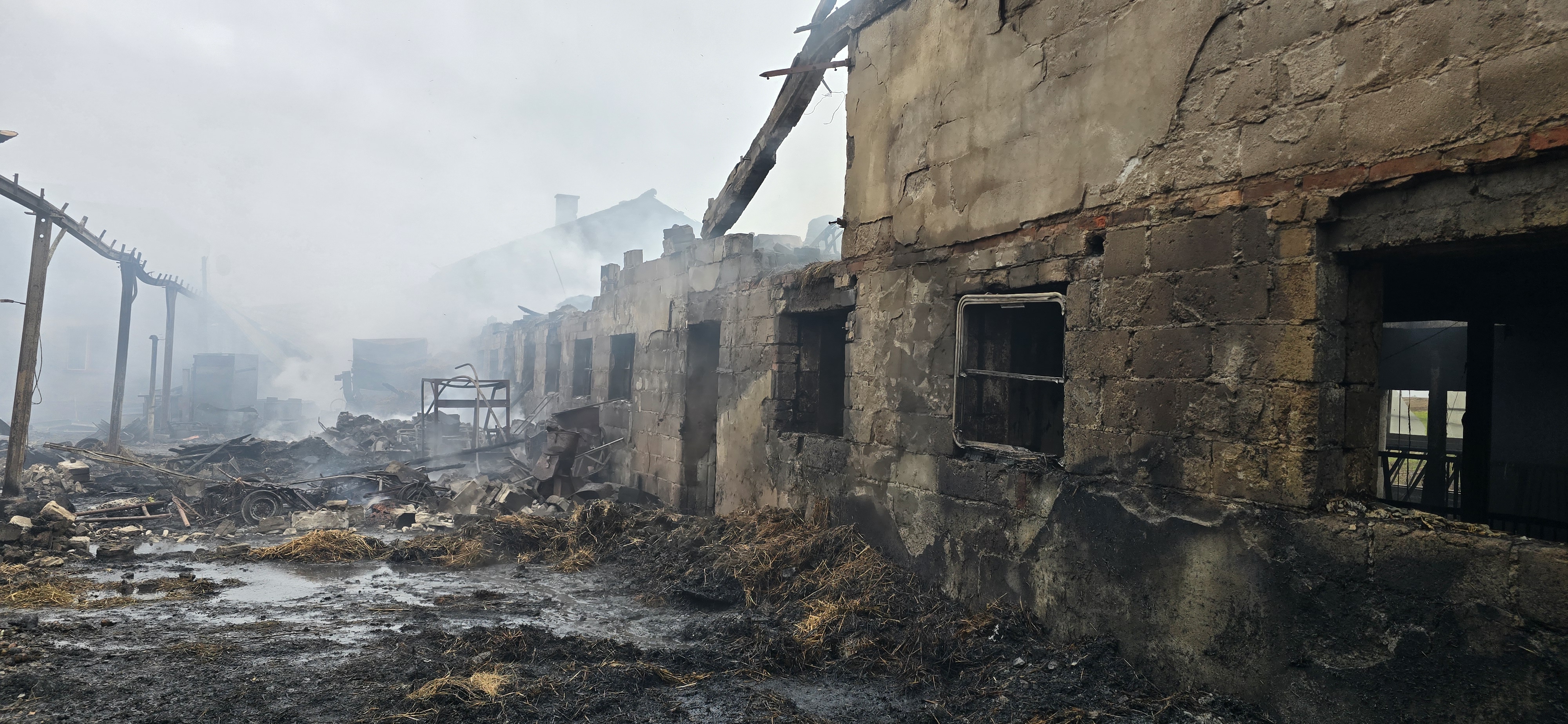 Palące się baloty w górnej części chlewni, strażacy musieli wyrzucać z budynku i poddawać dogaszaniu. Działania realizowano w aparatach ochrony układu oddechowego ze względu na silne zadymienie.