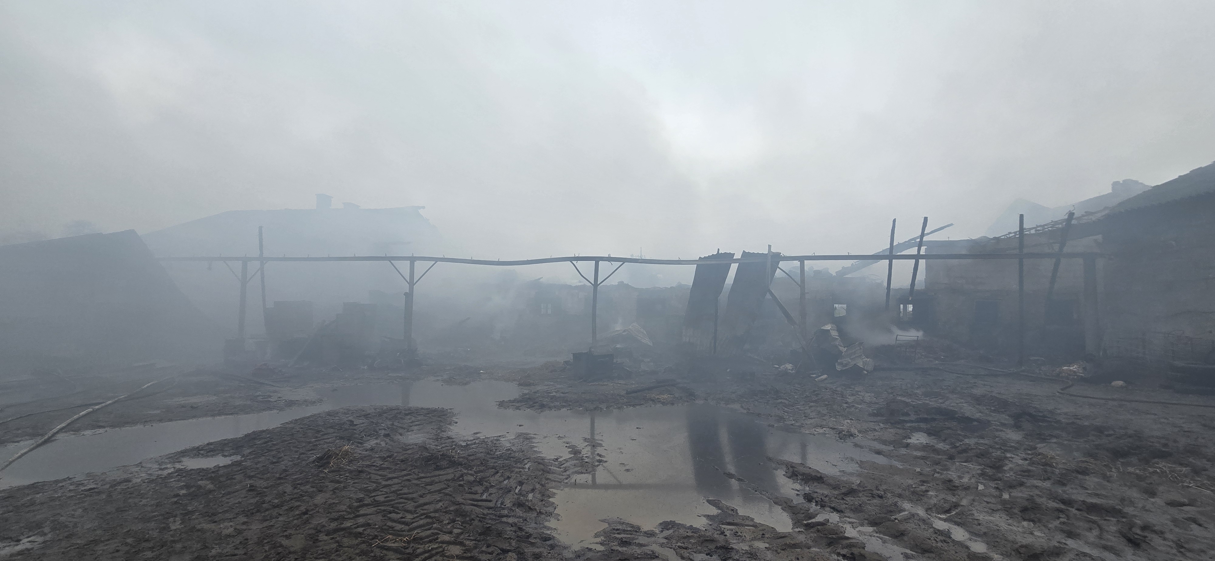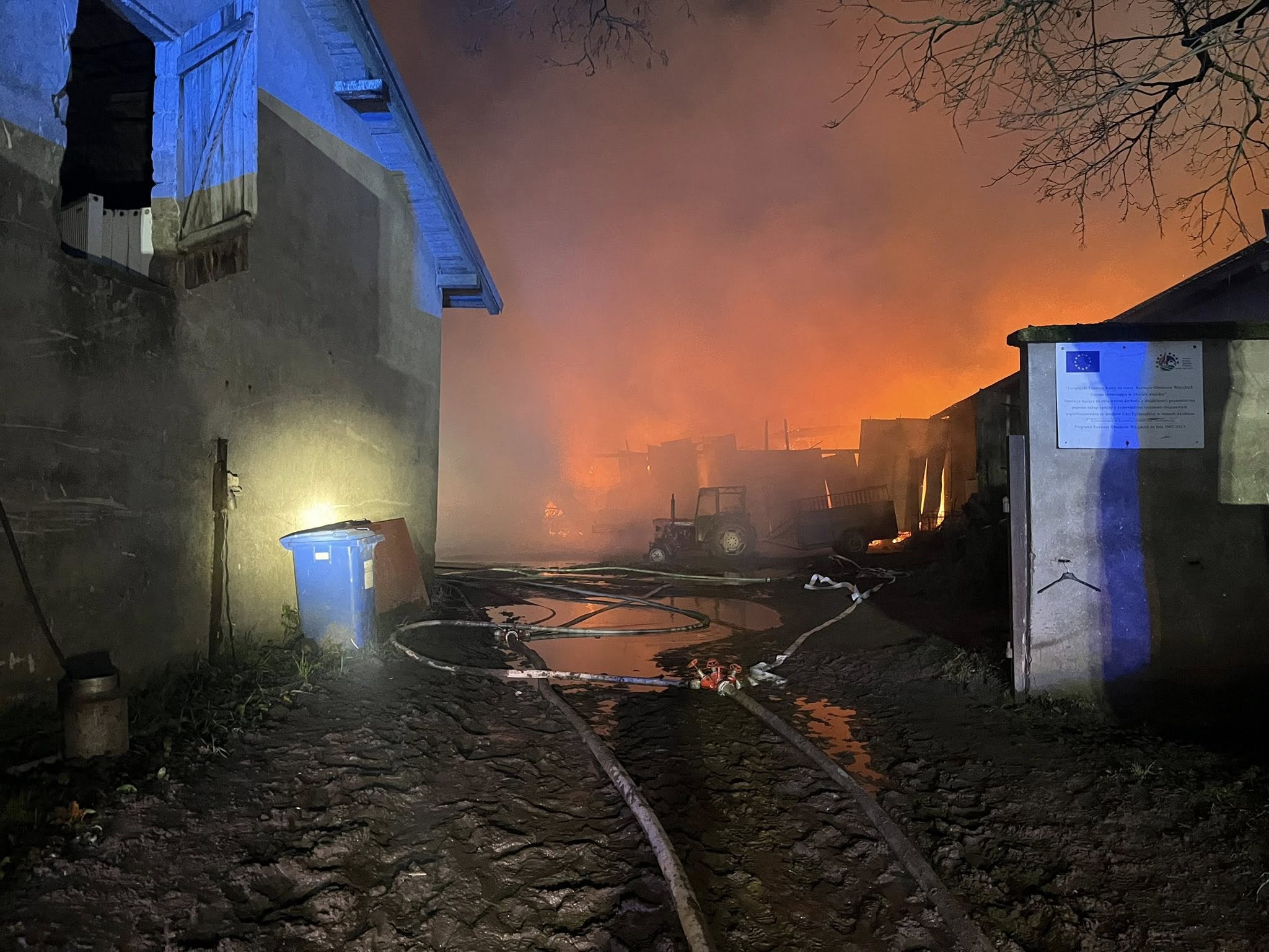 Po dojeździe pierwszych zastępów stwierdzono, że pożarem objęty jest cały obiekt chlewni, w którym znajdowały się zwierzęta oraz dodatkowo ogień objął górną część budynku, gdzie znajdowało się około 200 balotów. Pożar rozprzestrzenił się również na samochody osobowe, maszyny rolnicze oraz traktory znajdujące się w pobliżu.