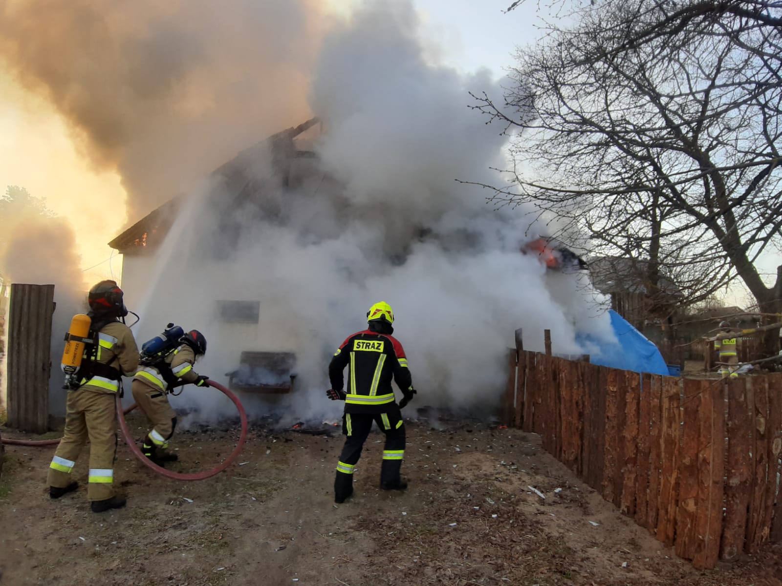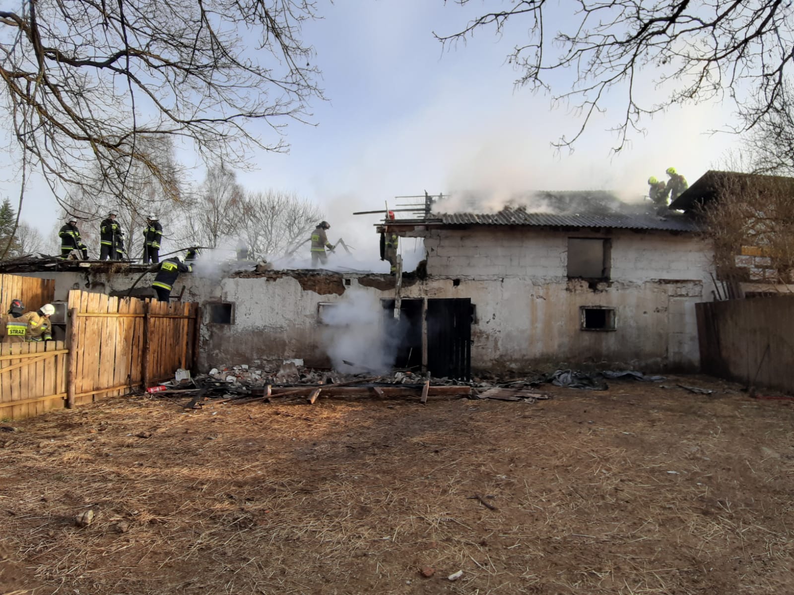 Do zdarzenia natychmiast zostały zadysponowane zastępy OSP gminy Karsin oraz zastęp JRG w Kościerzynie. Łącznie 8 zastępów. Po przybyciu na miejsce zdarzenia kierujący działaniem ratowniczym stwierdził palącą się szopę, a także zadymienie w chlewni w której znajdowało się stado kóz.