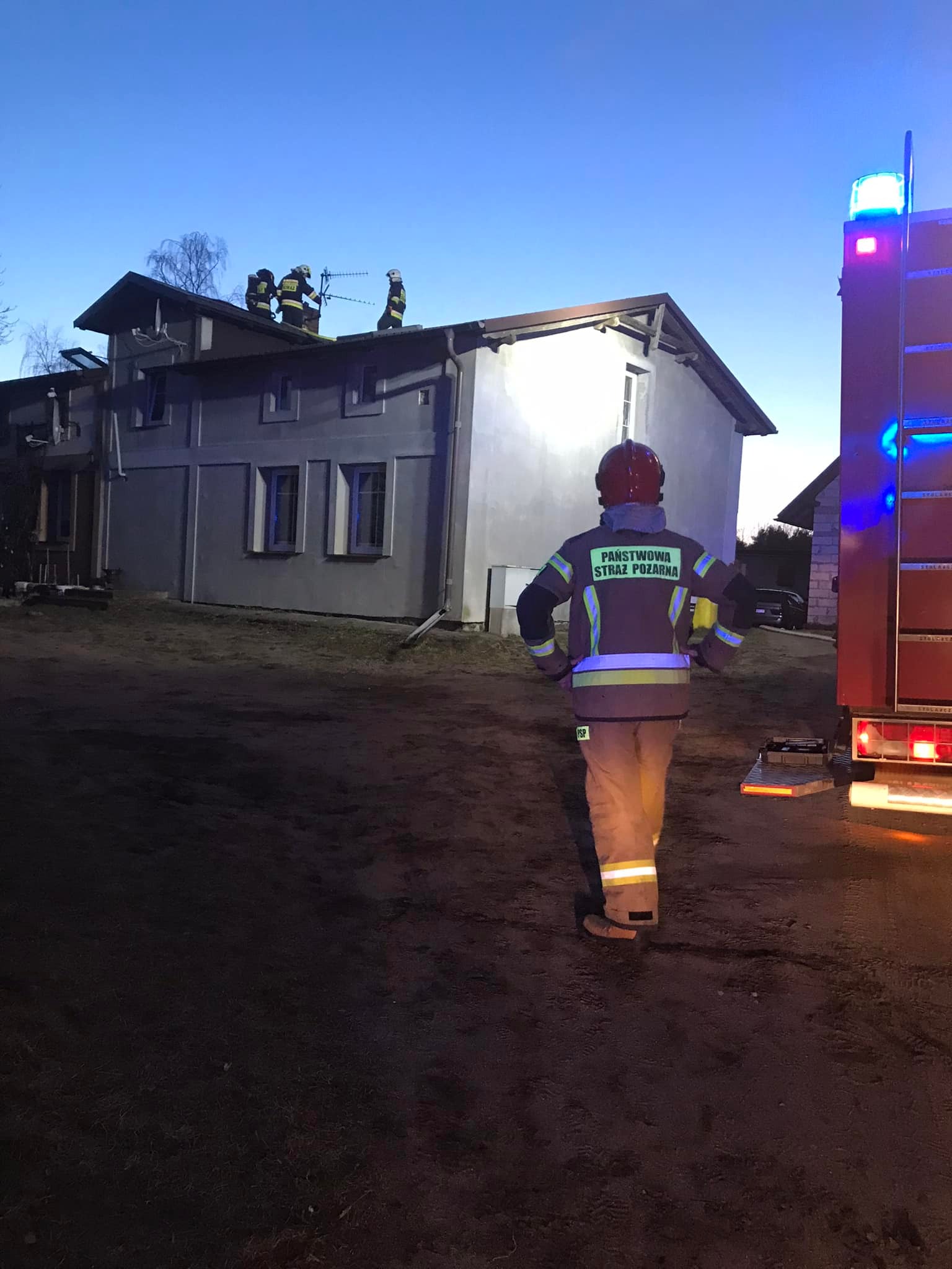 Po przybyciu na miejsce zdarzenia pierwszych zastępów straży pożarnej zastano pożar dachu od strony komina.