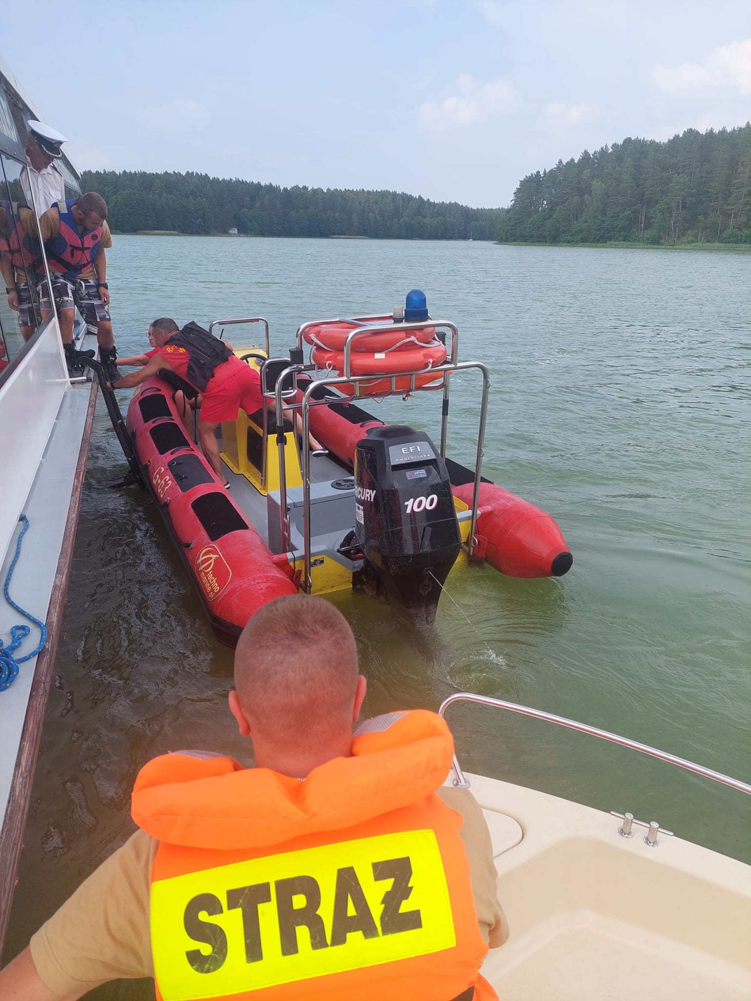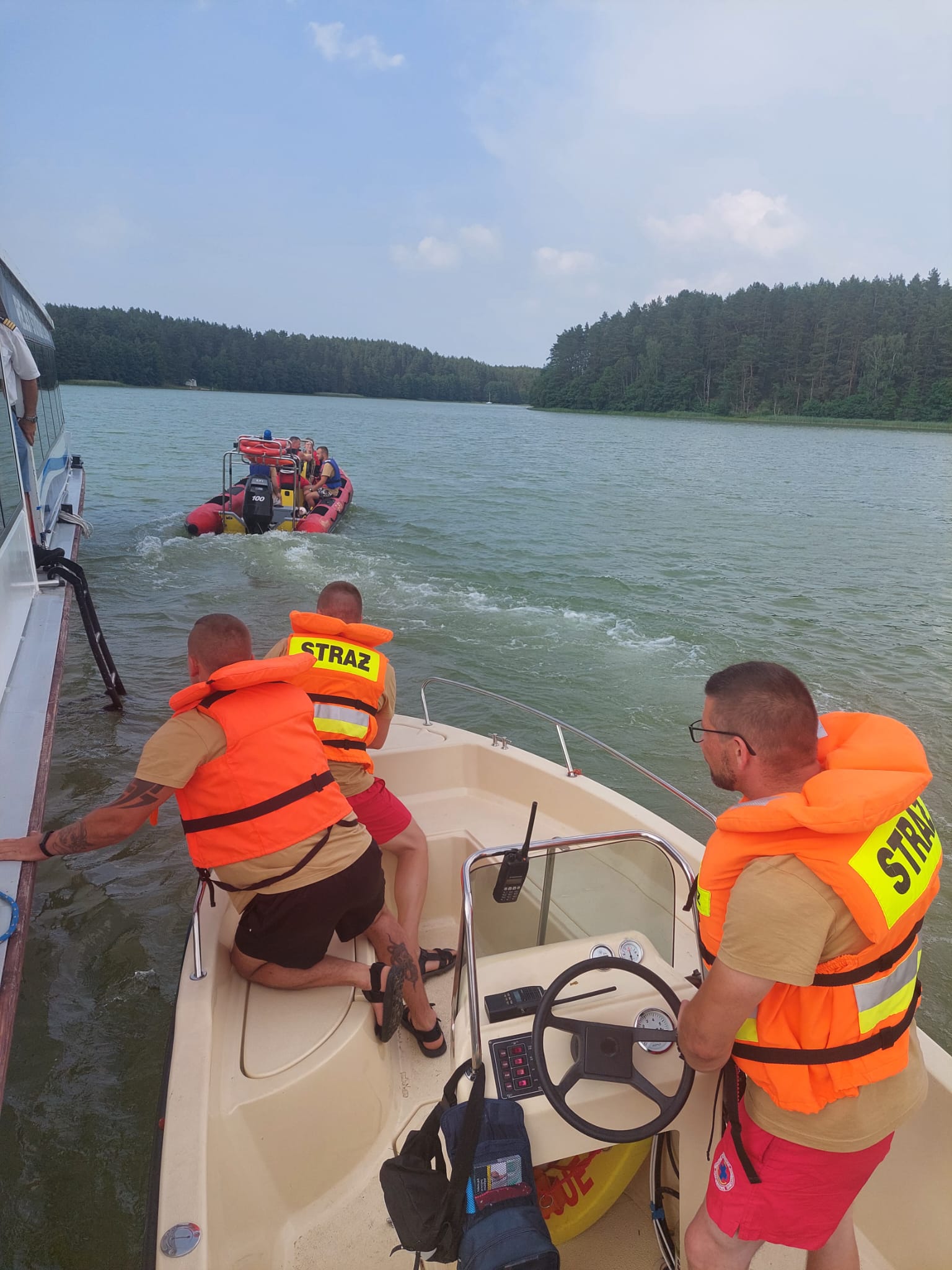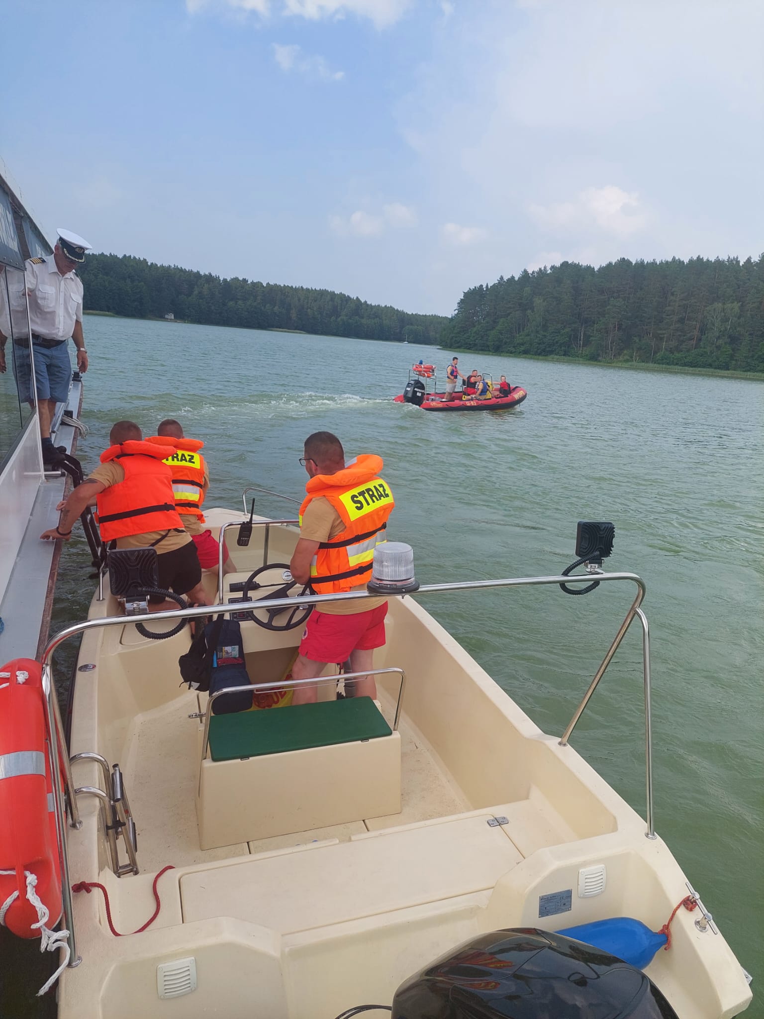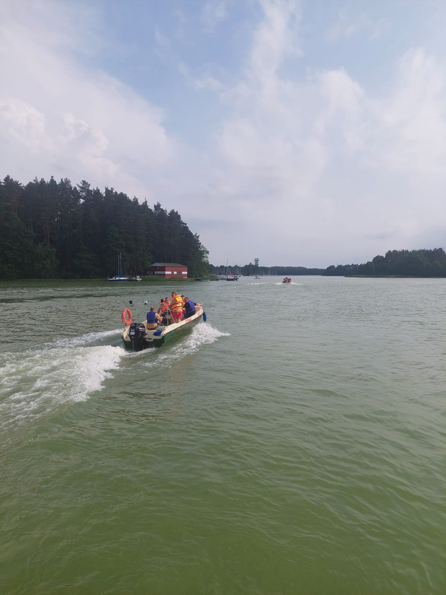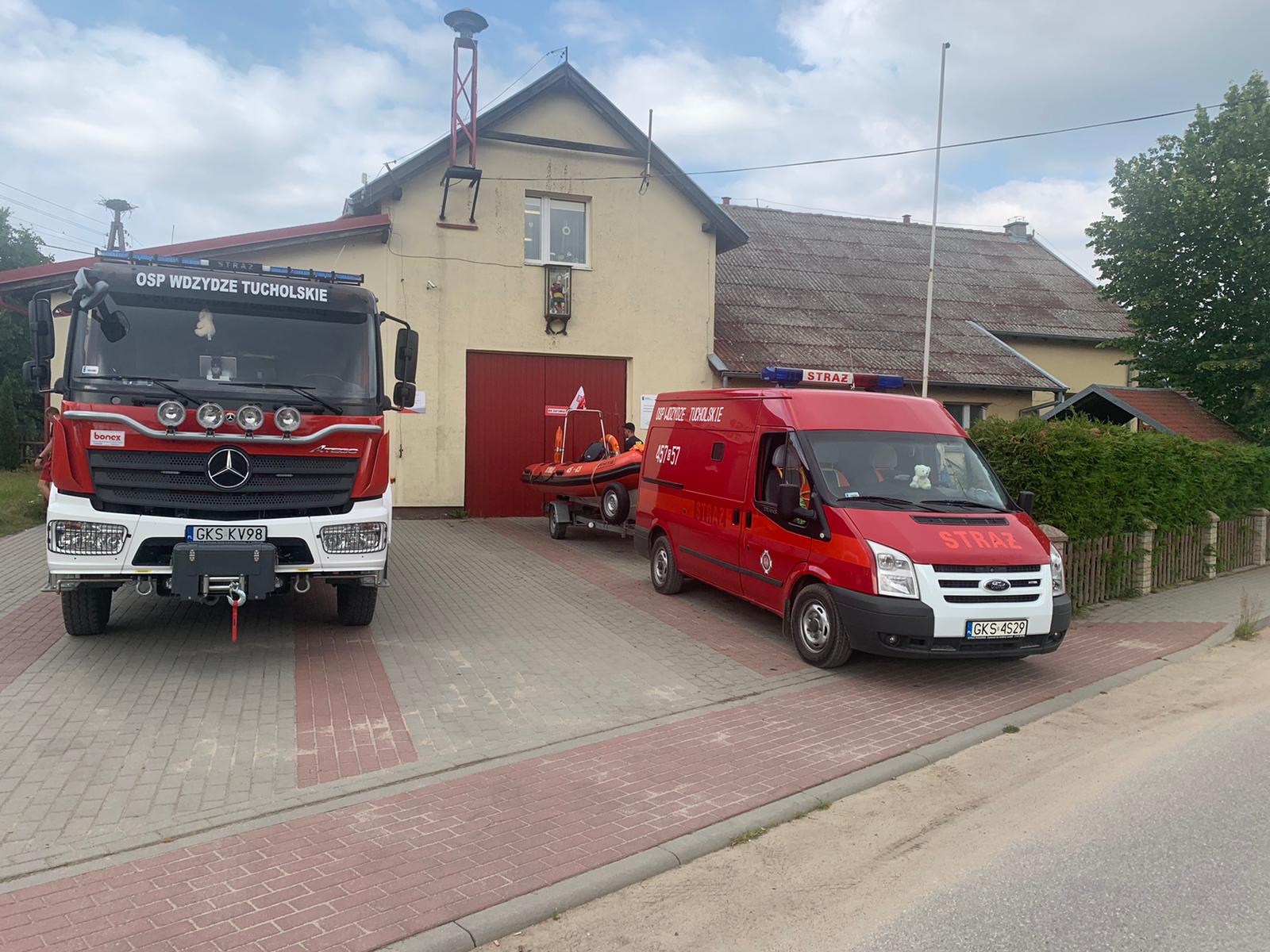 Dyżurny Stanowiska Kierowania Komendanta Powiatowego PSP w Kościerzynie na miejsce zadysponował Jednostkę Ratowniczo- Gaśniczą w Kościerzynie, Ochotniczą Straż Pożarną we Wdzydzach Tucholskich z pontonem ratowniczym oraz Ochotniczą Straż Pożarną we Wielu wraz z łodzią oraz Wodne Ochotnicze Pogotowie Ratunkowe (WOPR).