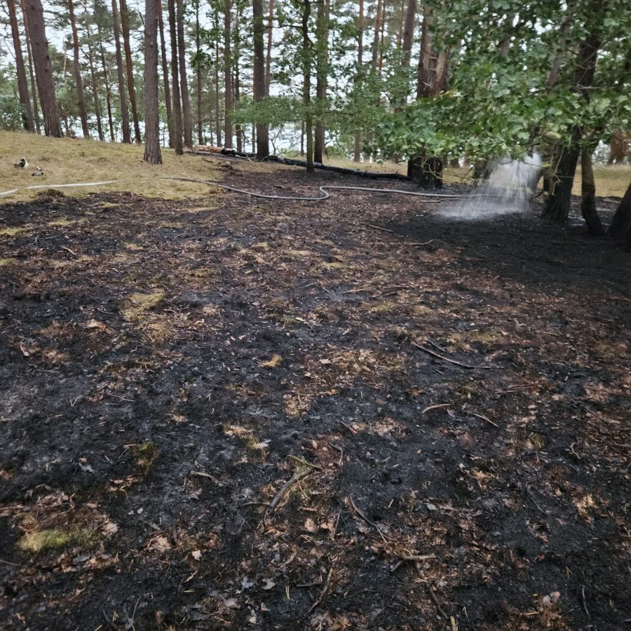 Po przybyciu na miejsce zdarzenia zastano pożar około 6 arów poszycia leśnego. Działania zastępów polegały na zabezpieczeniu miejsca zdarzenia, podaniu 4 prądów wody z wykonanego zasilania wodnego z jeziora Wdzydze. Po ugaszeniu pożaru teren dokładnie sprawdzono za pomocą kamery termowizyjnej oraz przelano wodą.