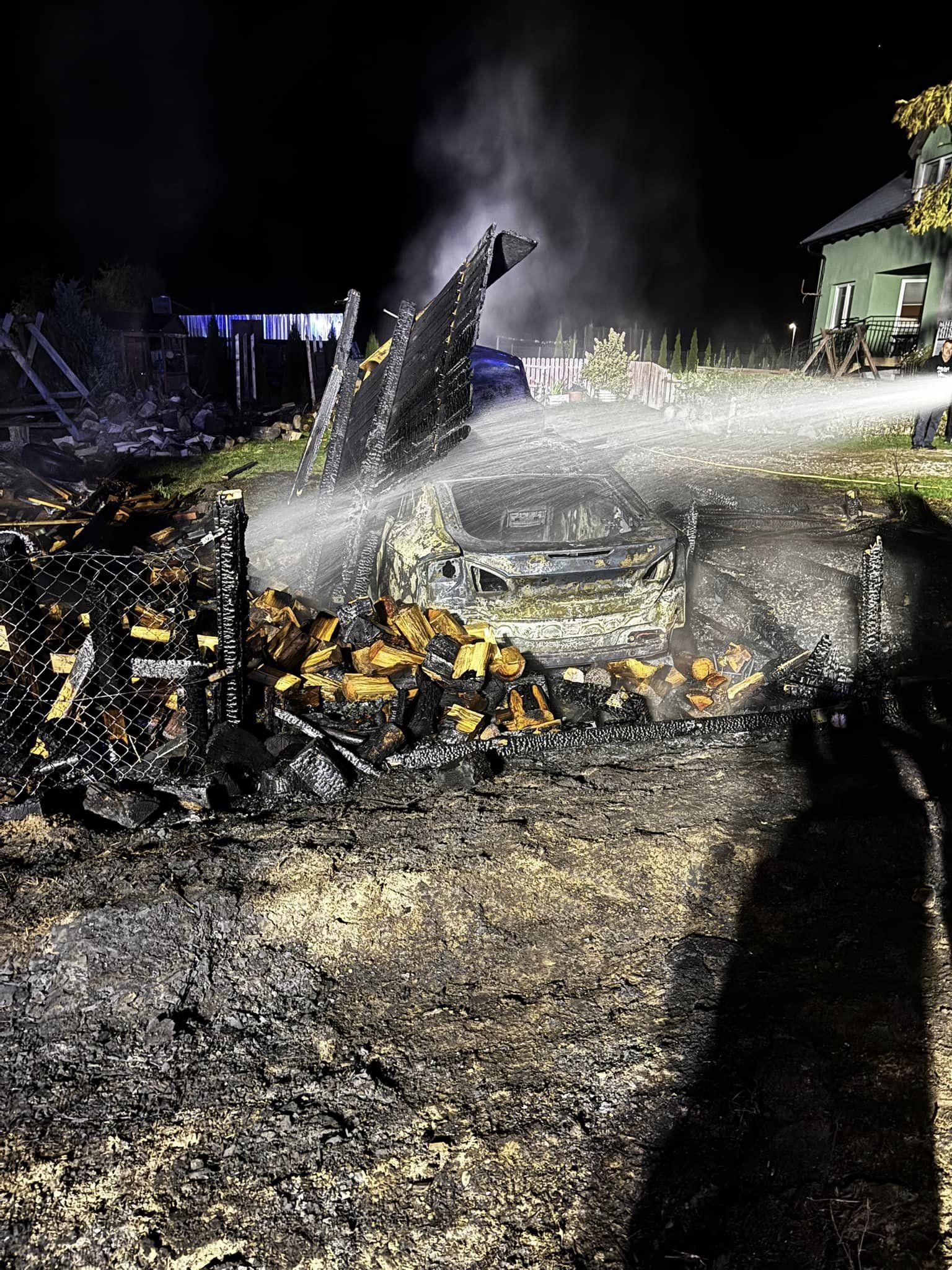 Po przybyciu na miejsce zdarzenia zastano wiatę całkowicie objętą pożarem, w środku obiektu znajdował się samochód osobowy również całkowicie objęty pożarem.