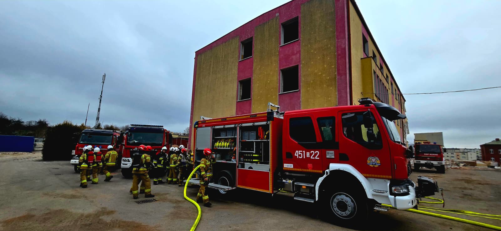 Strażacy Jednostki Ratowniczo-Gaśniczej w Kościerzynie oraz druhowie OSP z terenu powiatu kościerskiego wzięli udział w cyklu szkoleń i ćwiczeń na terenie obiektu biurowego dawnych zakładów mięsnych w Kościerzynie.