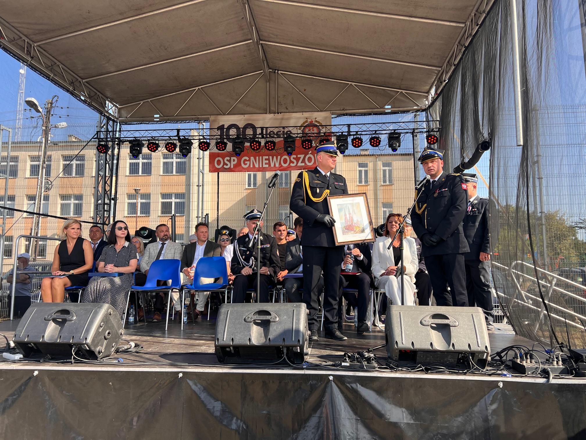 100-lecia powstania jednostki wręczył Prezesowi OSP w Gniewoszowie pamiątkowy obraz przedstawiający Katedrę św. Michała Archanioła i św. Floriana w Warszawie. Podczas swojego wystąpienia podziękował jednostce za codzienną pełną zaangażowania i często niebezpieczną służbę na rzecz społeczeństwa.