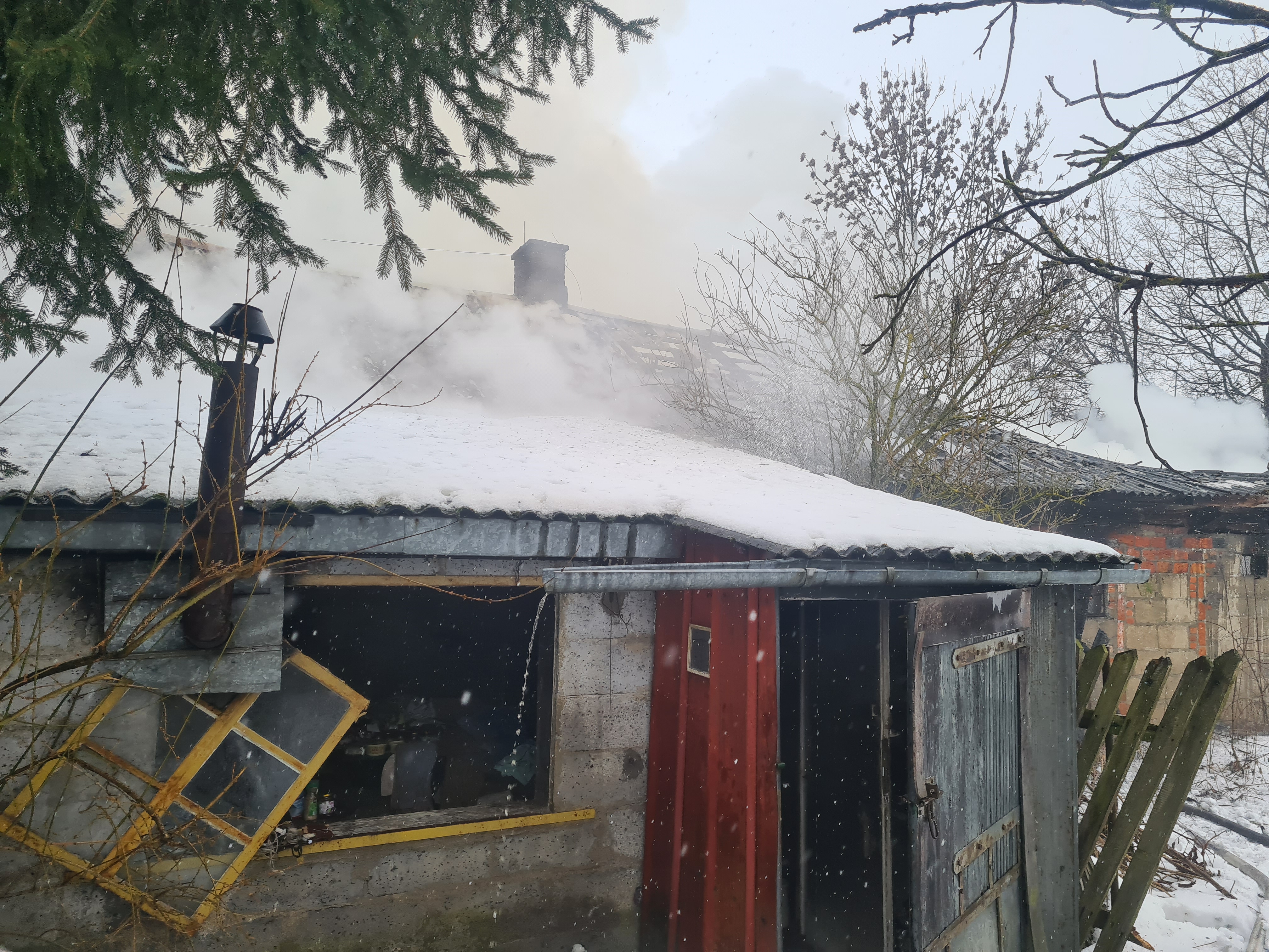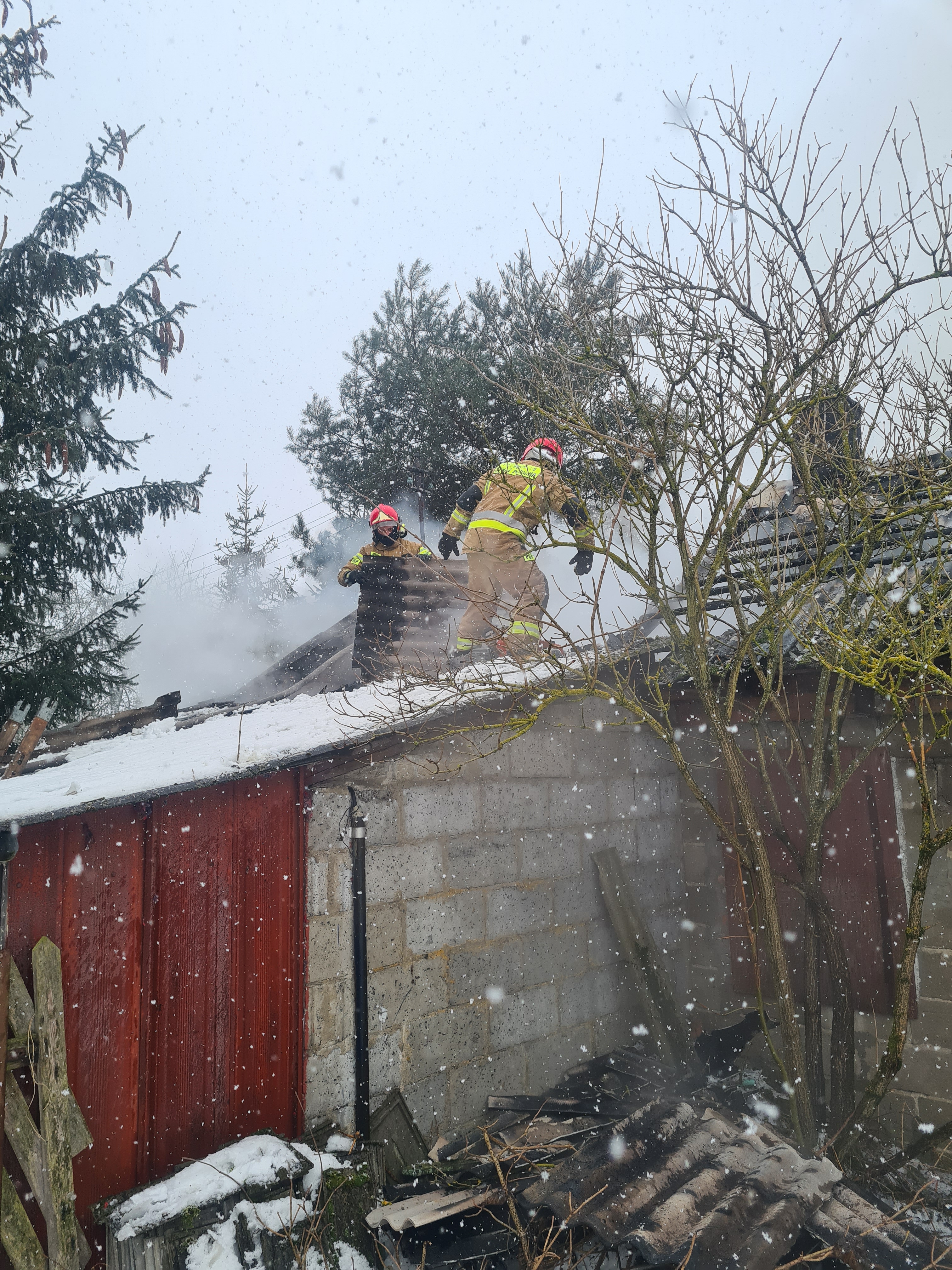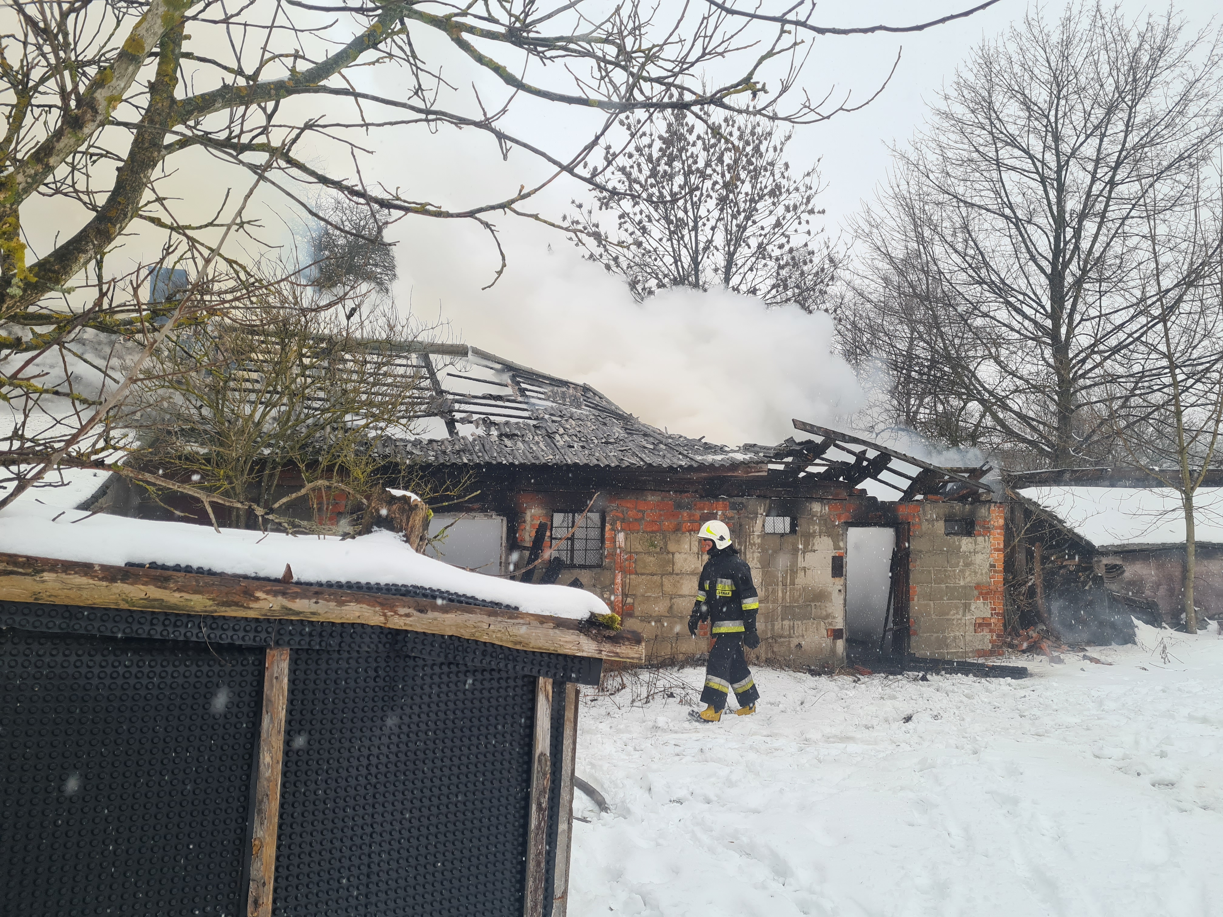 Po przyjeździe Straży Pożarnej na miejsce zdarzenia stwierdzono pożar murowanego, opuszczonego budynku mieszkalnego z częścią inwentarską. Ogniem objęta była w całości część inwentarska, zaś dach w części mieszkalnej. Działania jednostek ochrony przeciwpożarowej polegały na zabezpieczeniu miejsca zdarzenia oraz podaniu trzech prądów gaśniczych wody w natarciu na płonące budynki. Jednocześnie ratownicy przeszukiwali pomieszczenia w obiekcie - nie stwierdzono osób poszkodowanych w powyższym pożarze. Po lokalizacji pożaru przystąpiono do rozbiórki drewnianej więźby dachowej (wraz z pokryciem).
