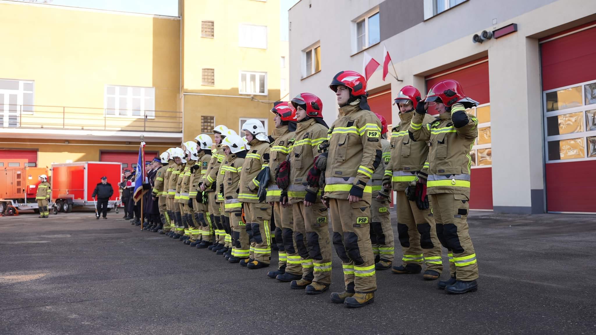 Uroczystość rozpoczęła się złożeniem meldunku Mazowieckiemu Komendantowi Wojewódzkiemu PSP st. bryg. Jarosławowi Piotrowskiemu przez dowódcę uroczystości - mł. asp. Michała Woźniaka. Następnie odegrano i odśpiewano hymn państwowy.