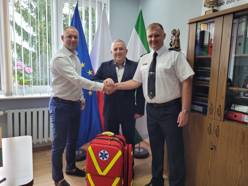 Na zakończenie spotkania nastąpiło uroczyste przekazanie przez Wójta Gminy Głowaczów- Huberta Czubaja i wiceprzewodniczącego Rady Powiatu Kozienickiego- Mirosława Górkę na ręce Komendanta Powiatowego Państwowej Straży Pożarnej w Kozienicach- mł. bryg. Kamila Bieńkowskiego medycznej torby plecakowej R1 na wyposażenie KP PSP w Kozienicach.
