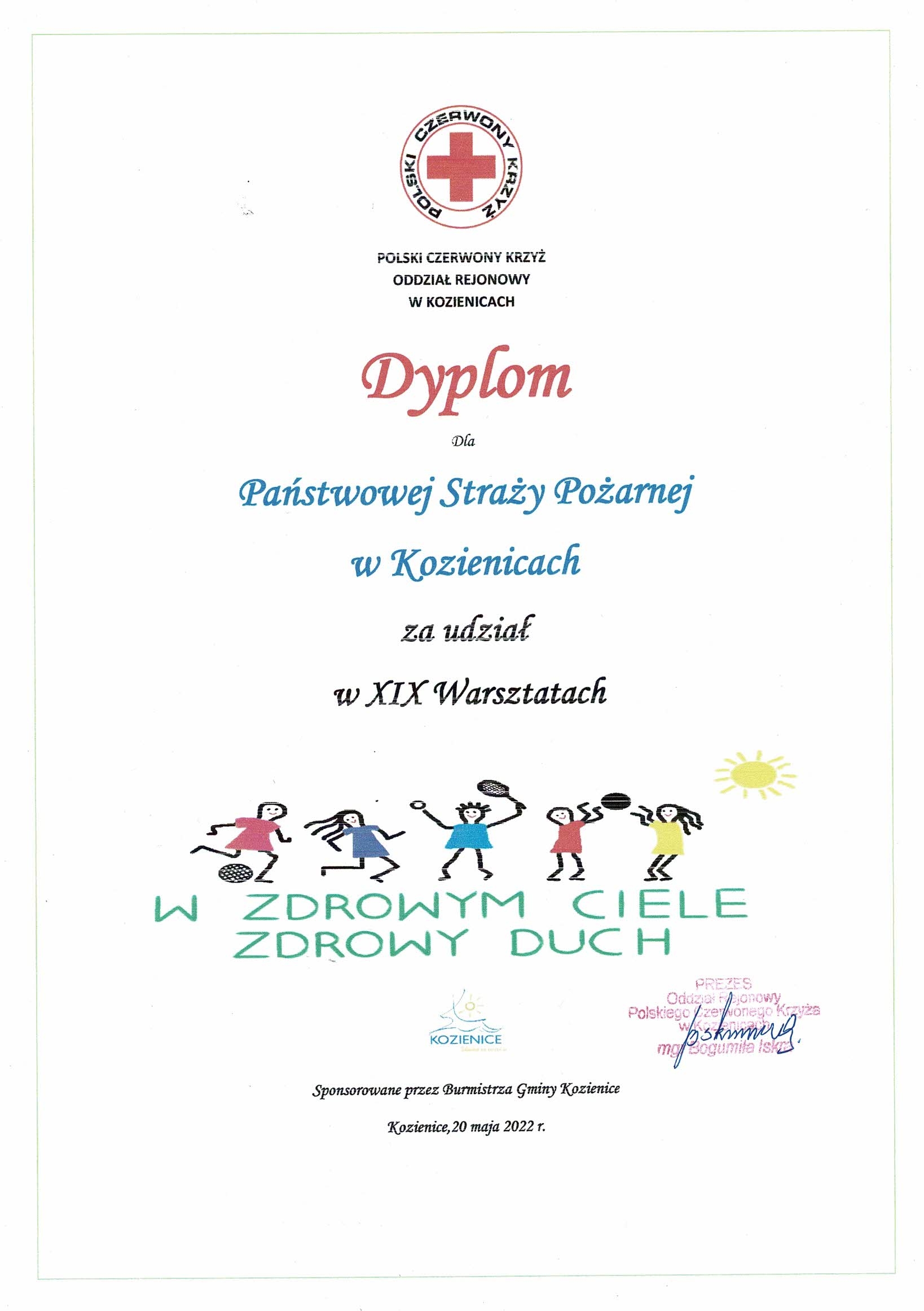 20 maja 2022 r. funkcjonariusze Komendy Powiatowej Państwowej Straży Pożarnej w Kozienicach wzięli udział w XIX warsztatach „W zdrowym ciele zdrowy duch” organizowanych przez Oddział Rejonowy Polskiego czerwonego Krzyża w Kozienicach, podczas których przeprowadzili szkolenie z zasad udzielania pierwszej pomocy.