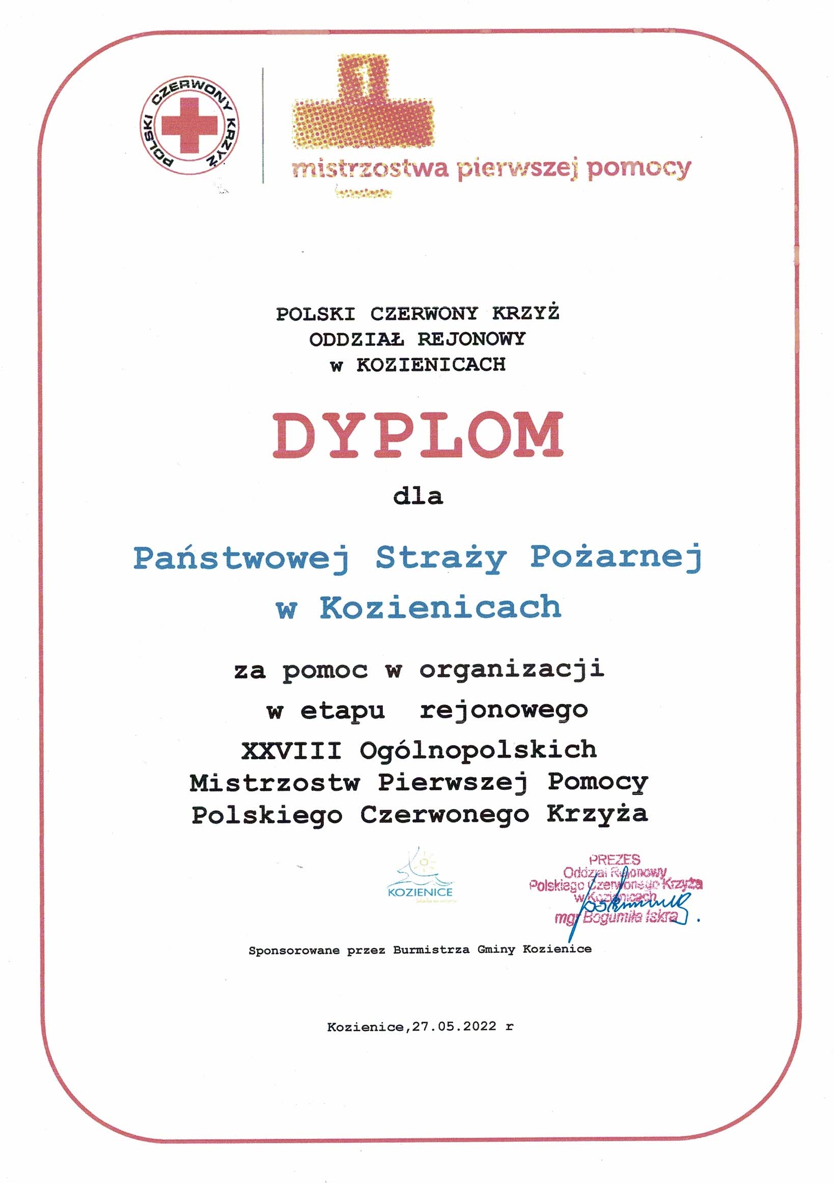W dniu 27 maja 2022 r. funkcjonariusze Komendy Powiatowej Państwowej Straży Pożarnej w Kozienicach brali udział w charakterze sędziów w XXVIII Rejonowych Mistrzostwach Pierwszej Pomocy Polskiego Czerwonego Krzyża, zorganizowane przez Oddział Rejonowy PCK w Kozienicach.
