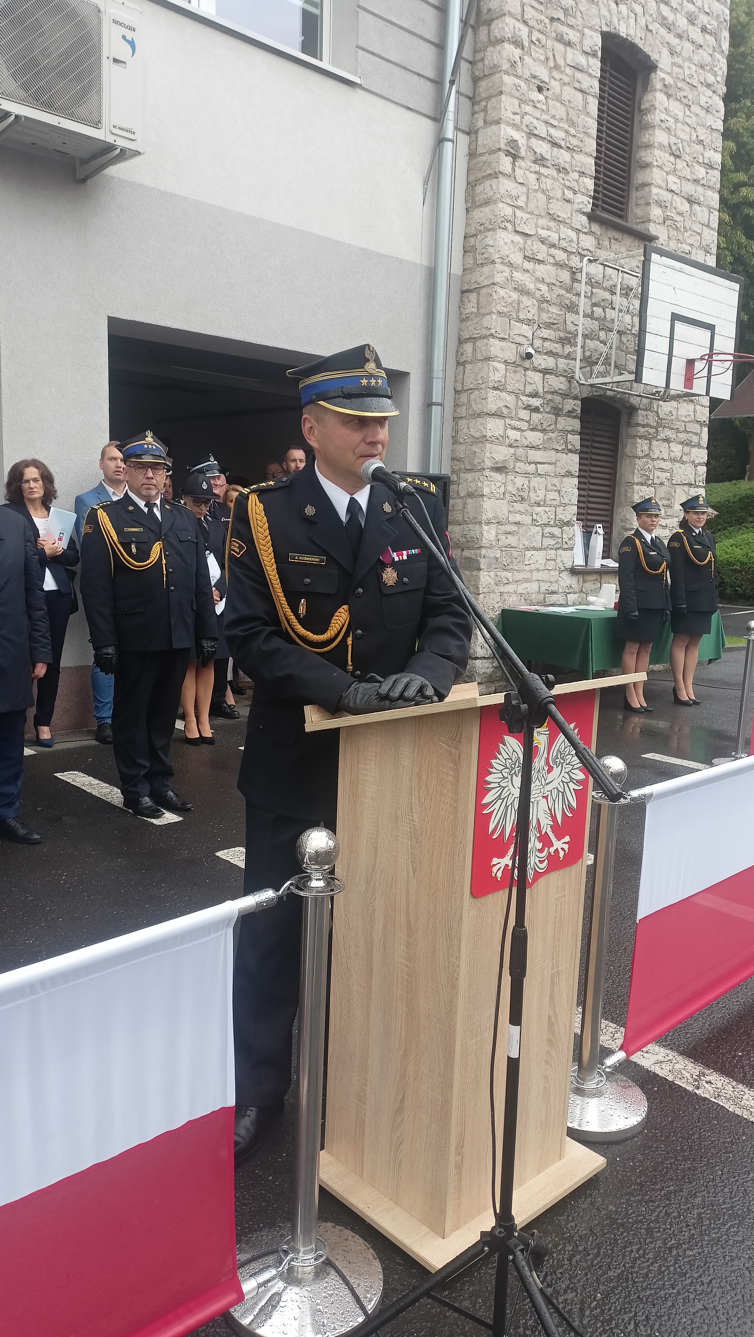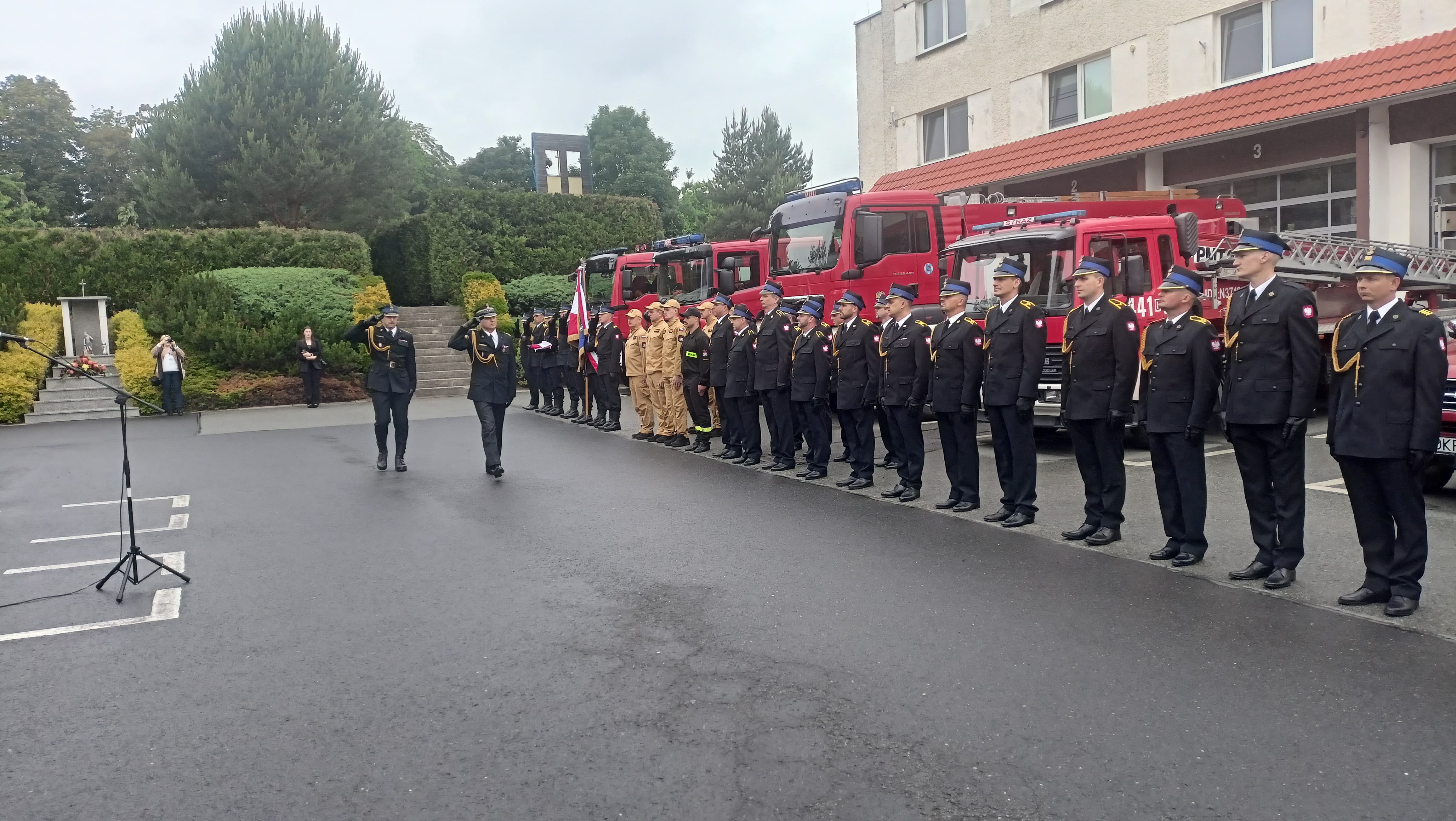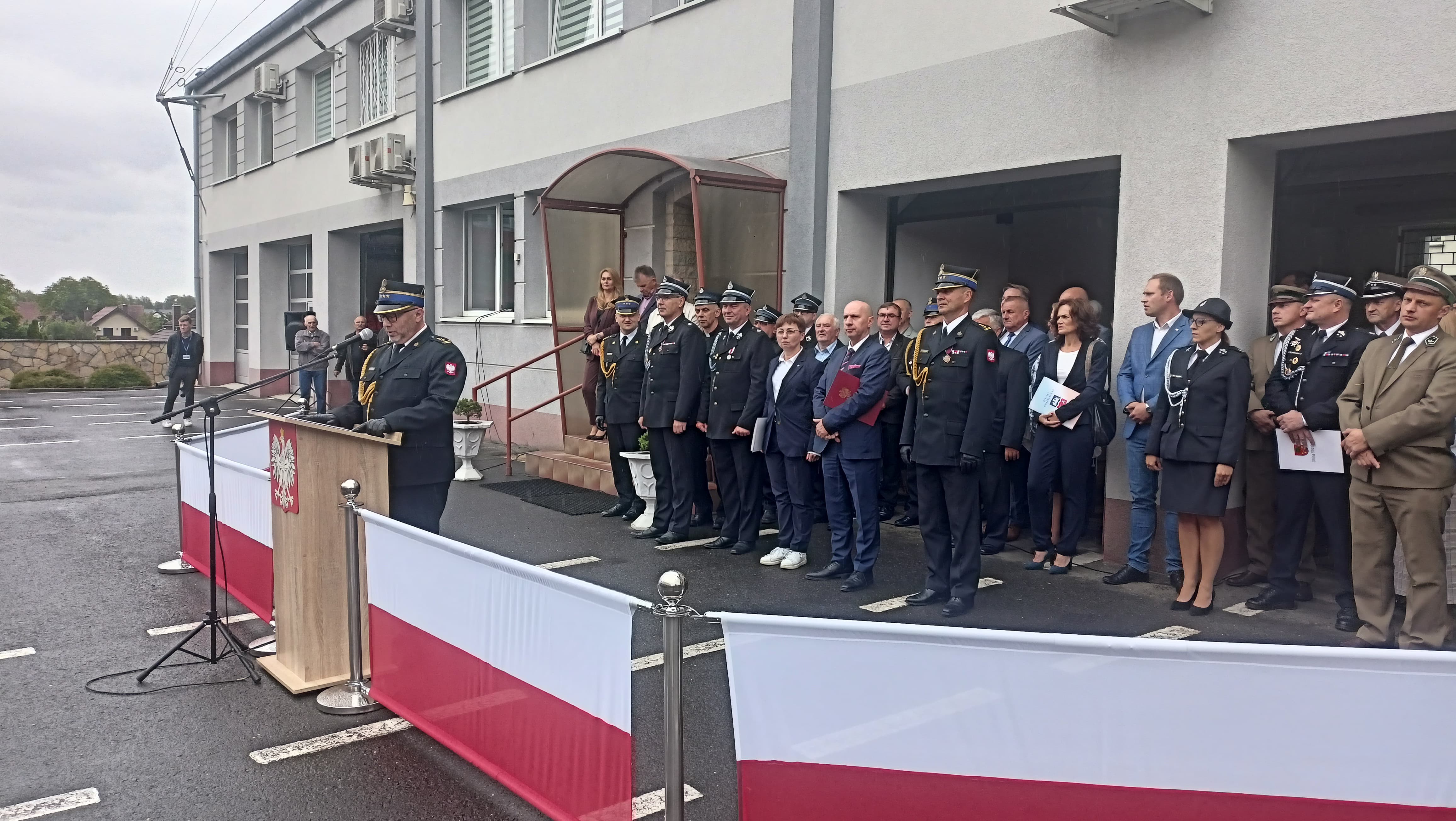 Następnie Komendant Powiatowy Państwowej Straży Pożarnej w Krapkowicach st. bryg. Rafał Bisowski przywitał zgromadzonych gości, funkcjonariuszy i pracowników cywilnych. W swoim przemówieniu wyraził wdzięczność wszystkim funkcjonariuszom i druhom za gotowość, profesjonalizm i solidarność ze wszystkimi służbami ratowniczymi podczas działań w czasie powodzi we wrześniu 2024 r.