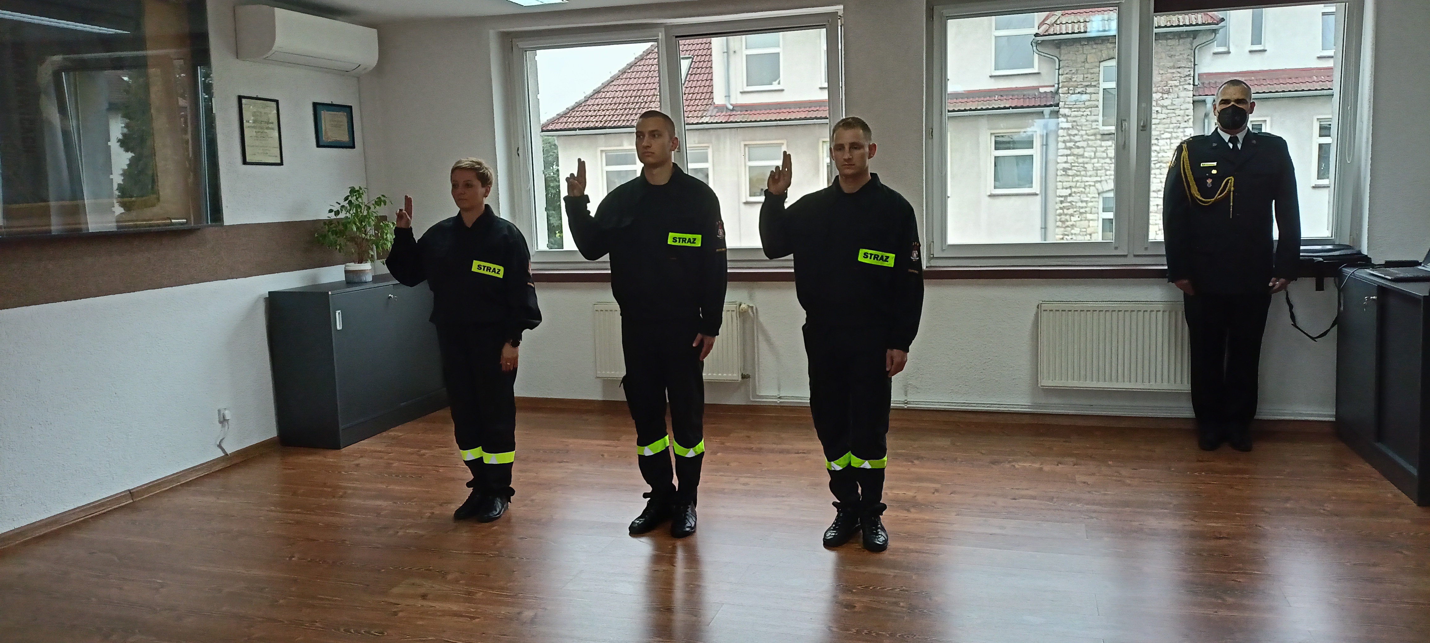 W trakcie uroczystej zbiórki Komendant Powiatowy PSP w Krapkowicach bryg. Rafał Bisowski przyjął ślubowanie od nowo przyjętych strażaków: Joanny Cieśla, Denisa Ćwikła oraz Grzegorza Kozak. Uroczystość odbyła się w obecności Zastępcy Komendanta Powiatowego PSP, Dowódcy JRG, funkcjonariuszy systemu codziennego oraz zmiany służbowej.