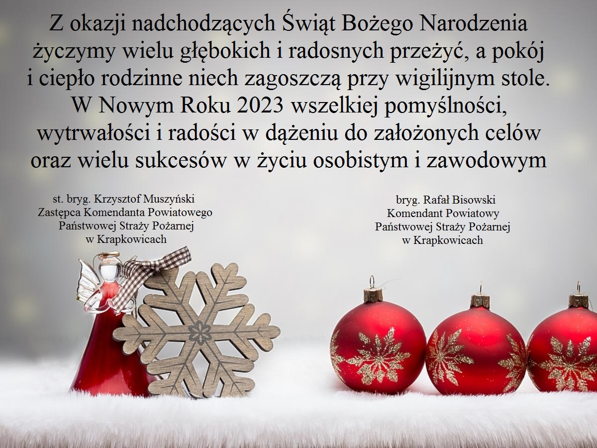 Życzenia bożonarodzeniowe kierownictwa Komendy Powiatowej PSP w Krapkowicach 23.12.2022 Zdjęcia (1) Pokaż zdjęcie 1 z galerii.