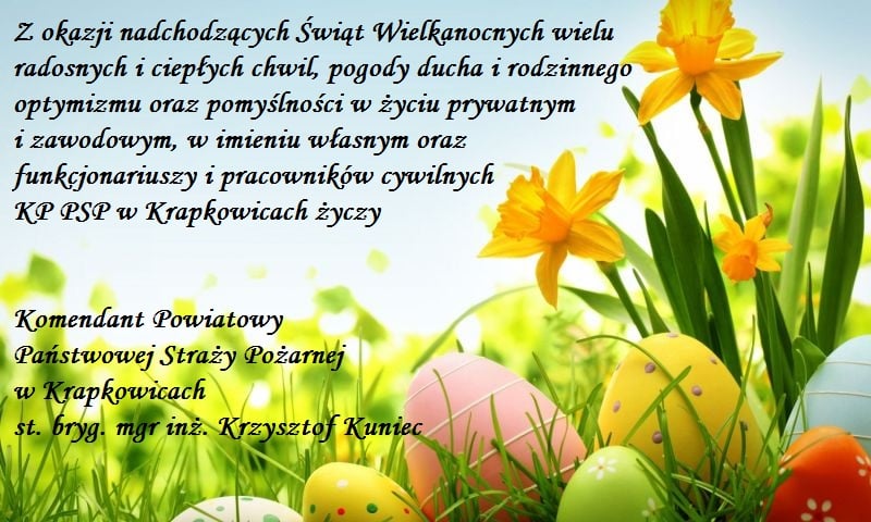 Życzenia świąteczne 02.04.2021 Życzenia Komendanta Powiatowego PSP w Krapkowicach z okazji Wielkanocy. Zdjęcia (1) Pokaż zdjęcie 1 z galerii.