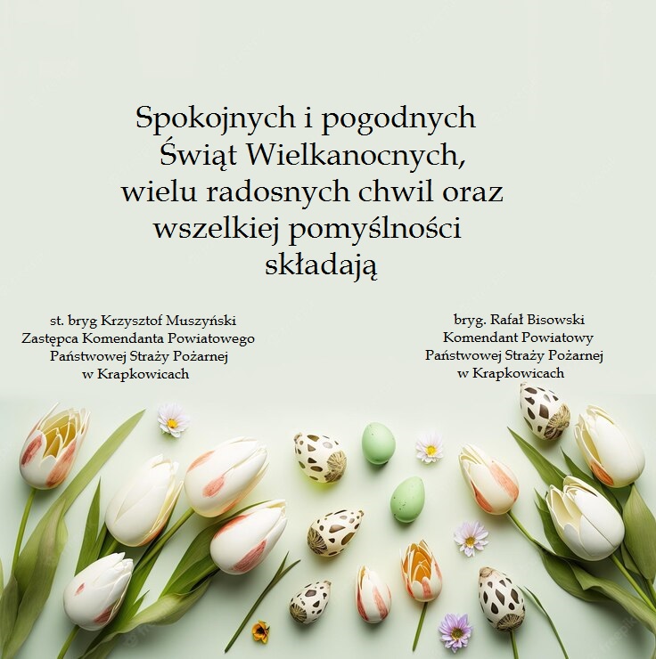 Życzenia z okazji Świąt Wielkanocnych 06.04.2023 Życzenia wielkanocne kierownictwa Komendy Powiatowej PSP w Krapkowicach. Zdjęcia (1) Pokaż zdjęcie 1 z galerii.