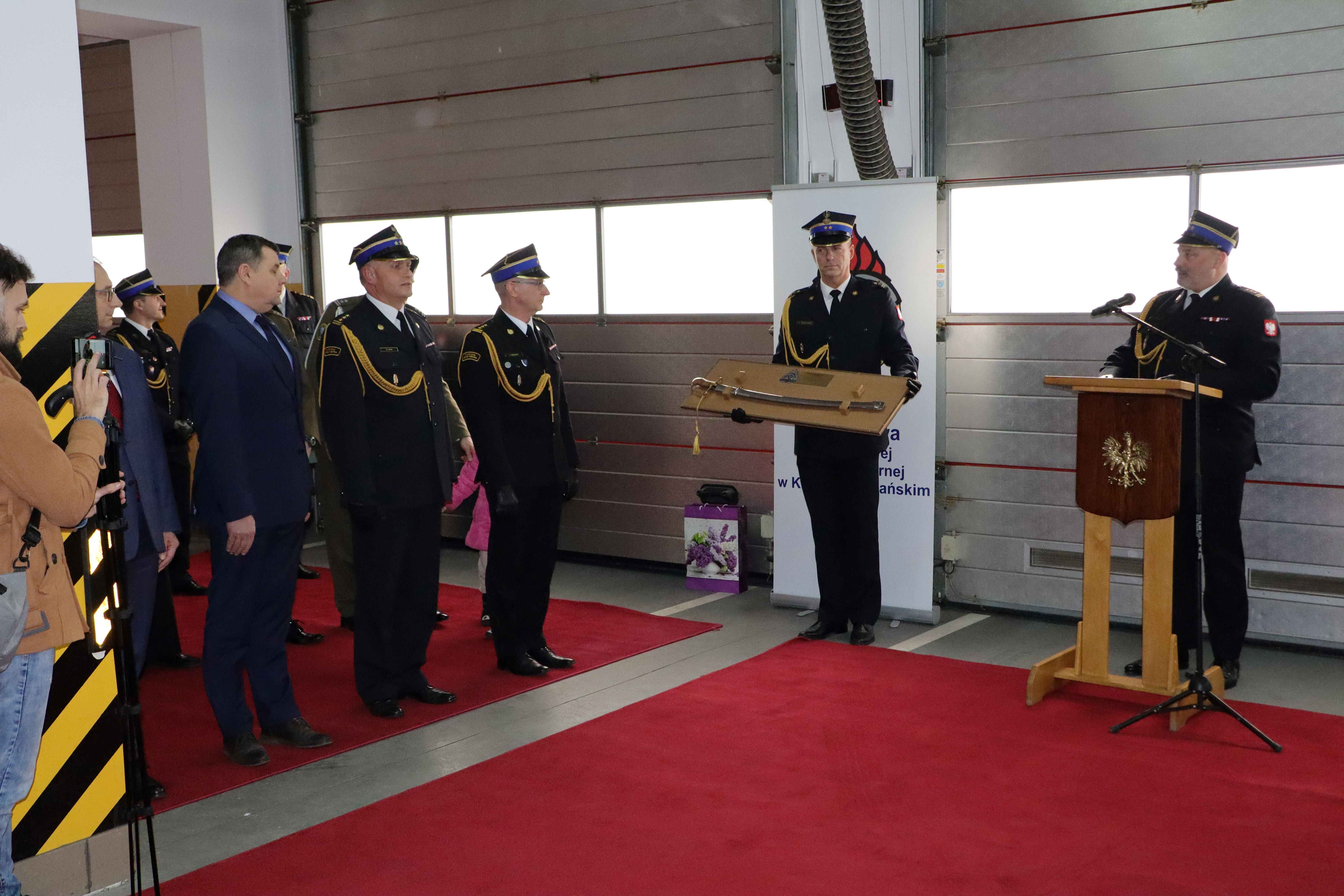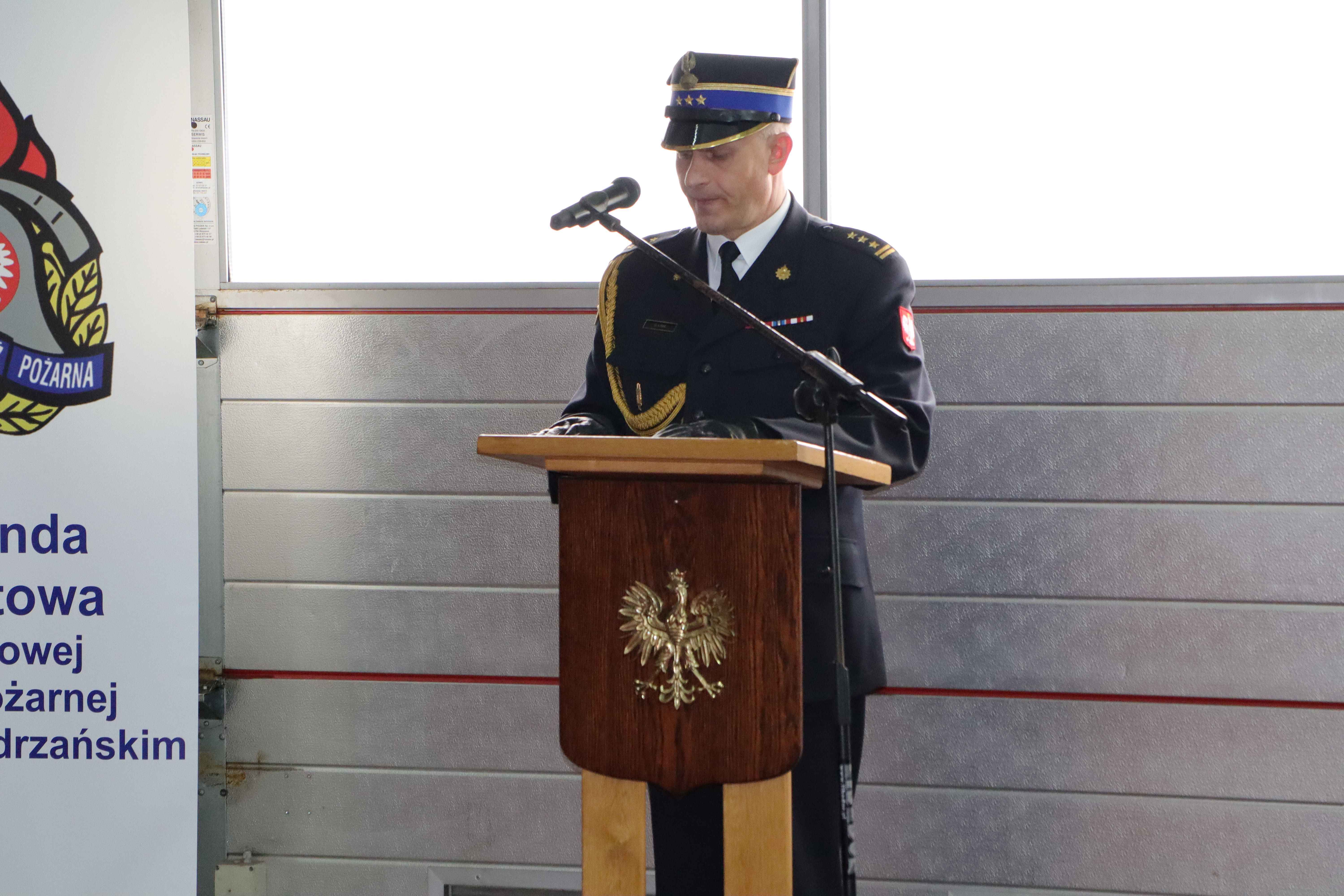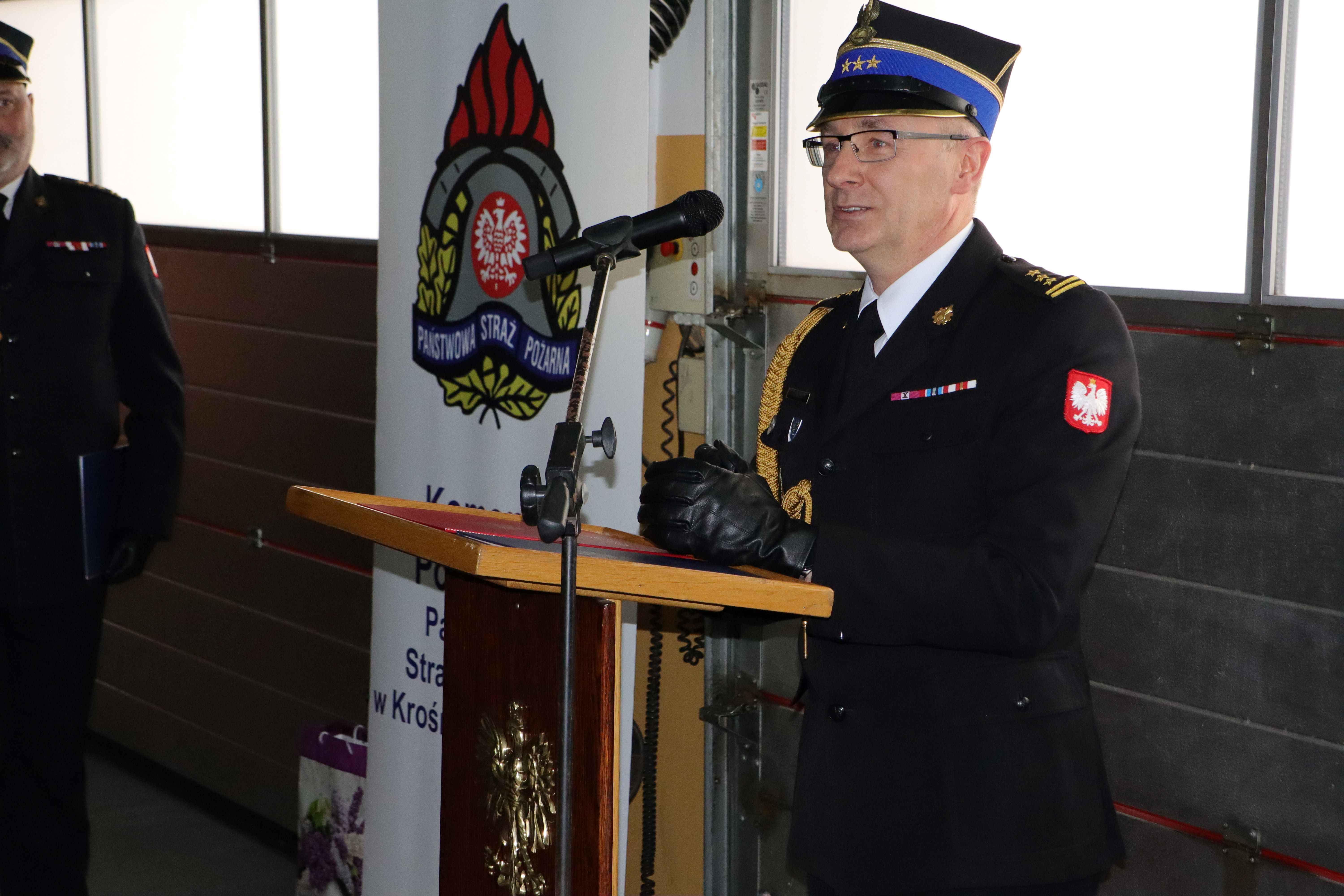 Następnie głos zabrał gospodarz uroczystości st. bryg. Andrzej Kaźmierak - Komendant Powiatowy Państwowej Straży Pożarnej w Krośnie Odrzańskim, który serdecznie przywitał gości a także przedstawił przebieg służby odchodzącego ze służby oficera. Została odczytana Decyzja Komendanta Głównego Państwowej Straży Pożarnej o zwolnieniu ze służby st. bryg. Grzegorza Lisika.