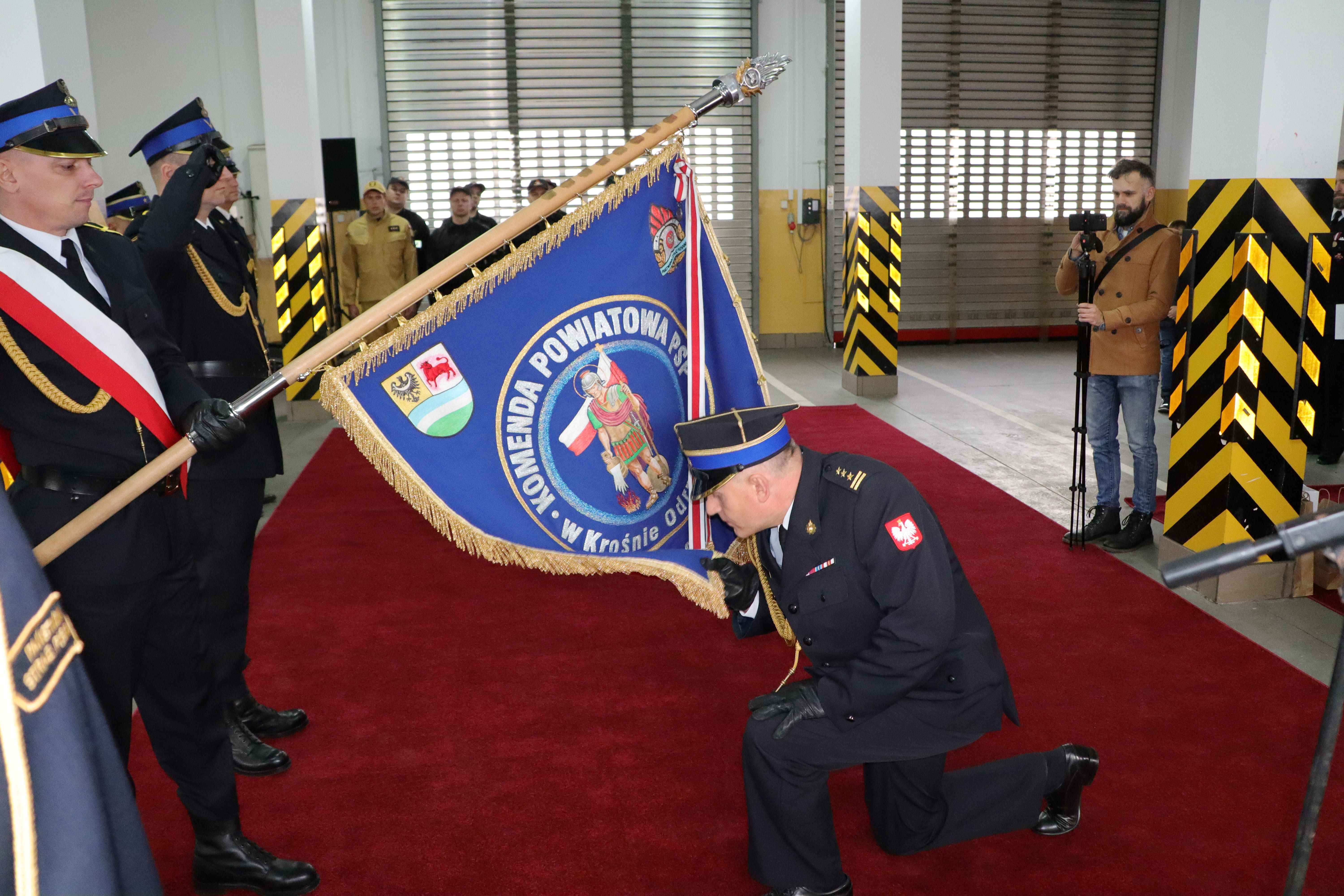 Następnie st. bryg. Grzegorz Lisik pożegnał się ze sztandarem Komendy Powiatowej PSP w Krośnie Odrzańskim.