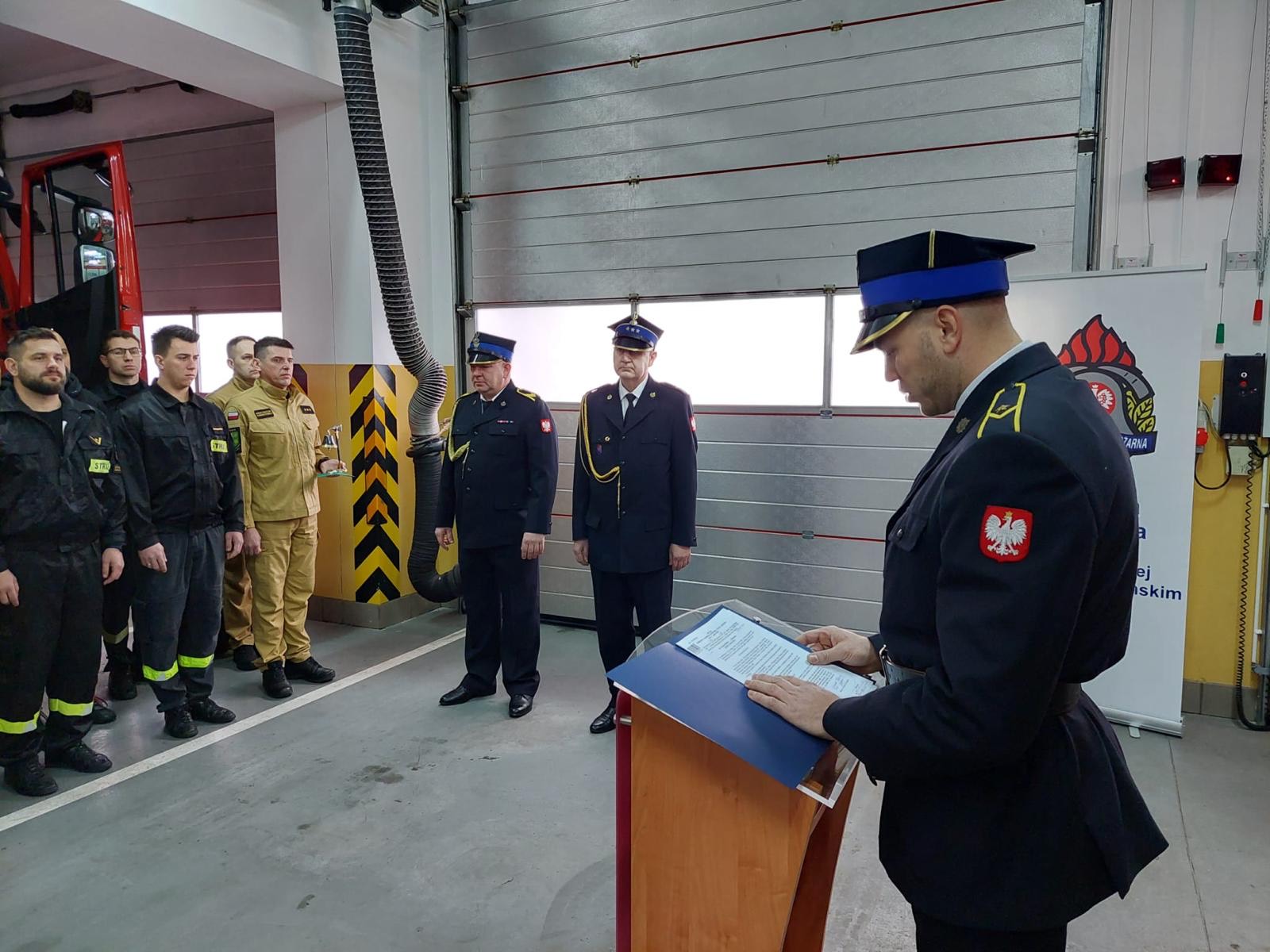 Uroczysta zbiórka rozpoczęła się złożeniem meldunku Komendantowi Powiatowemu Państwowej Straży Pożarnej w Krośnie Odrzańskim bryg. Dariuszowi Wojtuń przez dowódcę uroczystości mł. kpt. Tomasza Michalskiego. Następnie odczytano decyzje Komendanta Głównego oraz Komendanta Powiatowego o zwolnieniu ze służby dwóch funkcjonariuszy.