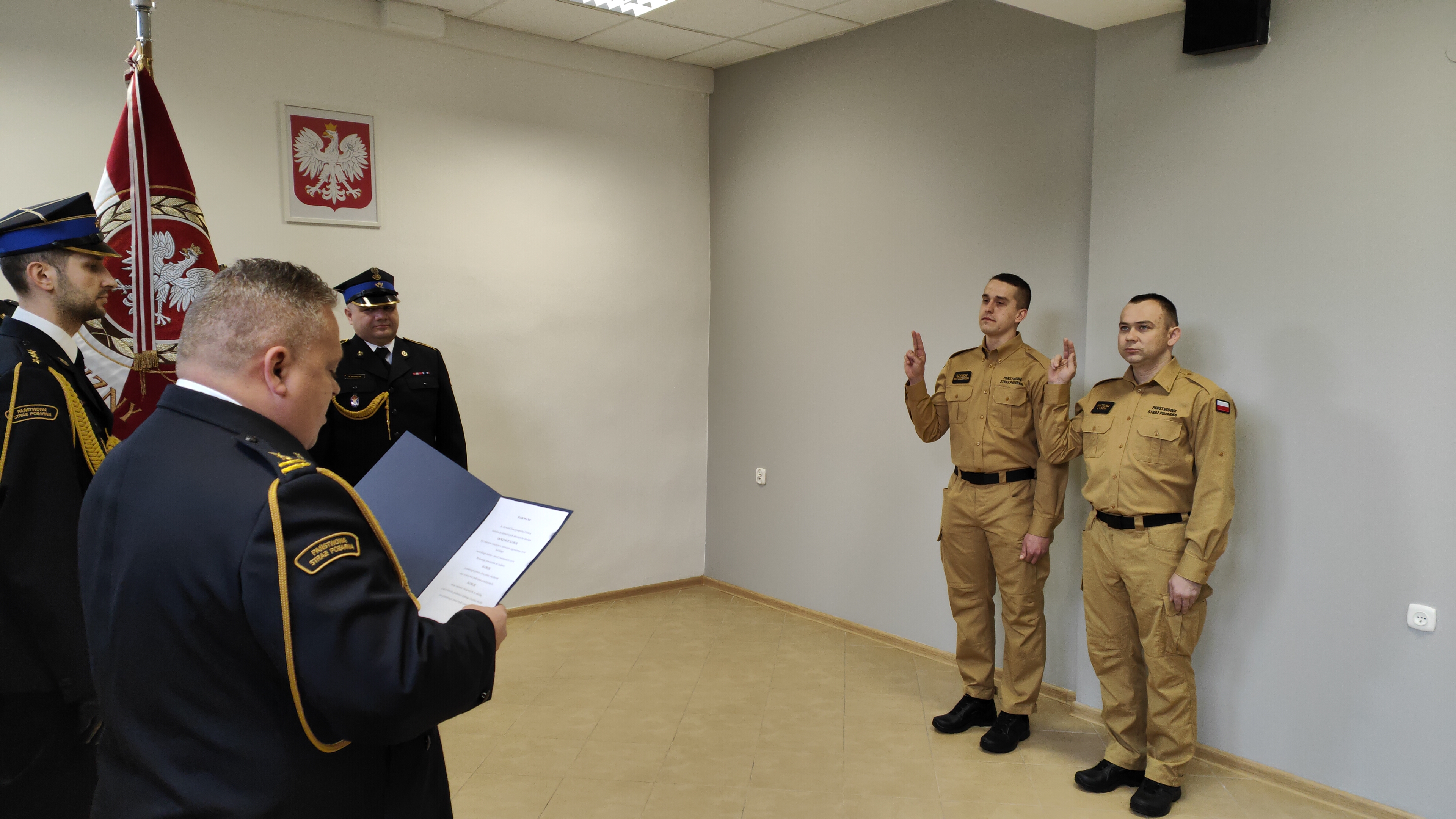 „Ja, obywatel Rzeczypospolitej Polskiej, świadom podejmowanych obowiązków strażaka, uroczyście ślubuję być ofiarnym i mężnym w ratowaniu zagrożonego życia ludzkiego i wszelkiego mienia - nawet z narażeniem życia. Wykonując powierzone mi zadania, ślubuję przestrzegać prawa, dyscypliny służbowej oraz wykonywać polecenia przełożonych. Ślubuję strzec tajemnic związanych ze służbą, a także honoru, godności i dobrego imienia służby oraz przestrzegać zasad etyki zawodowej.”
