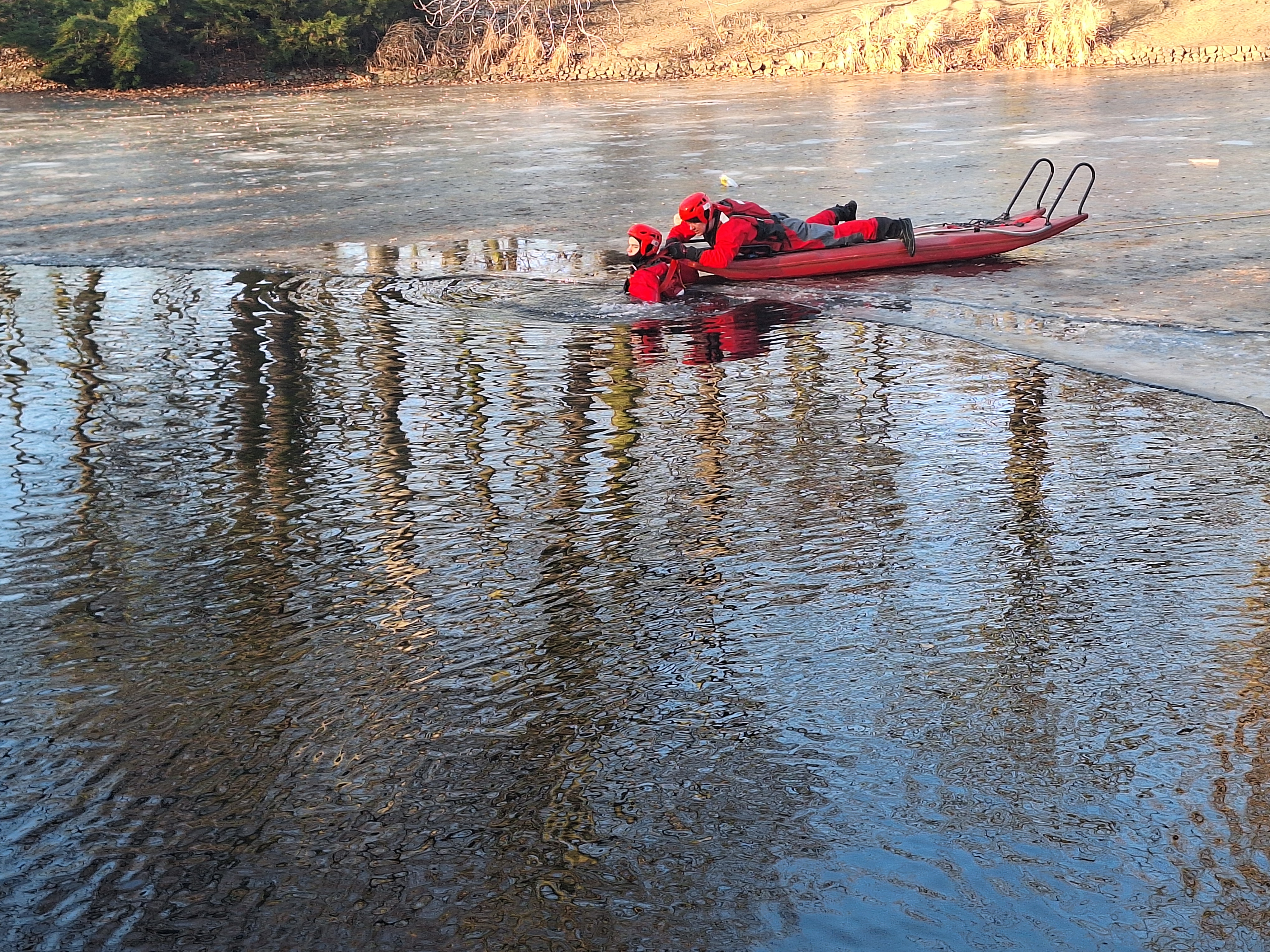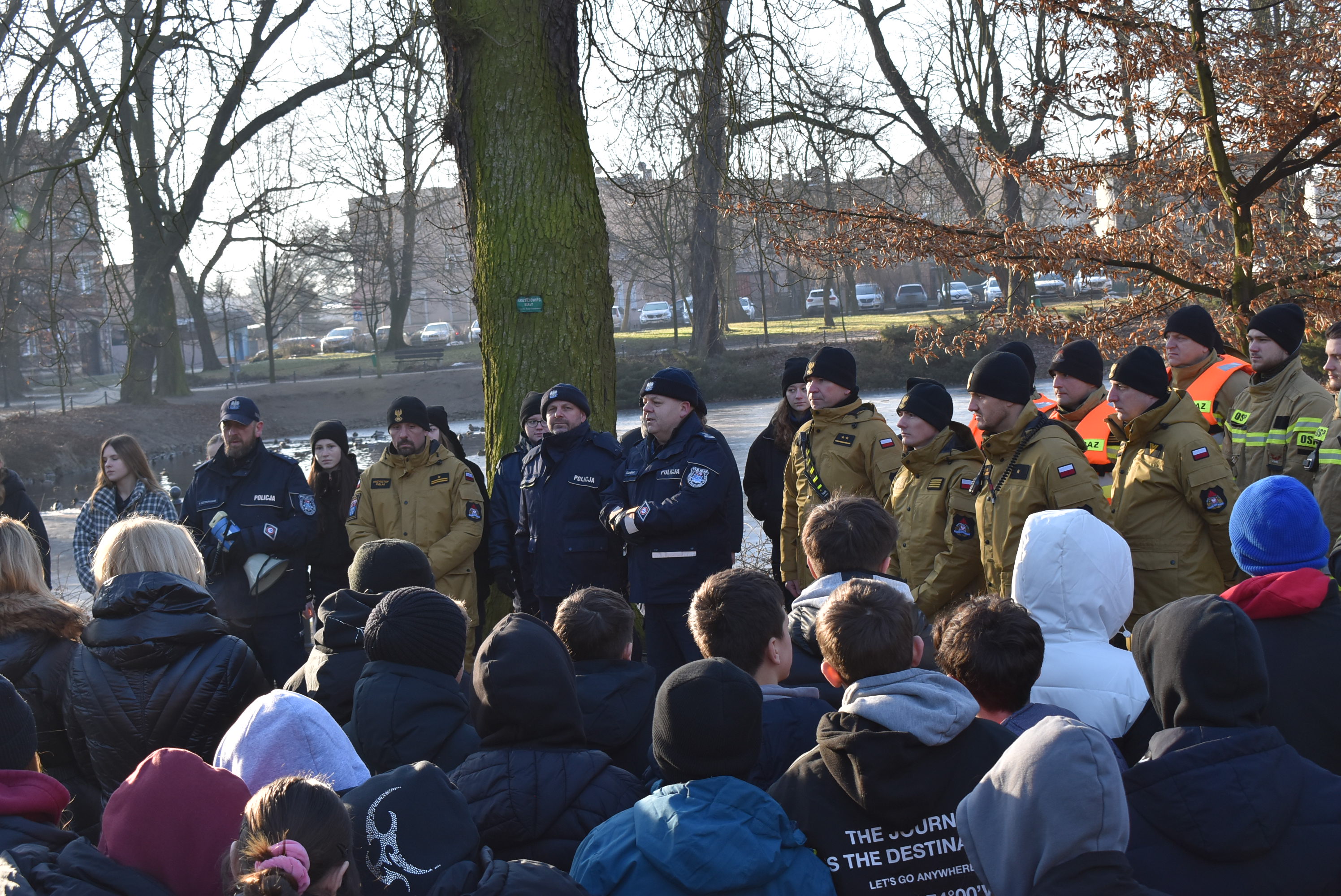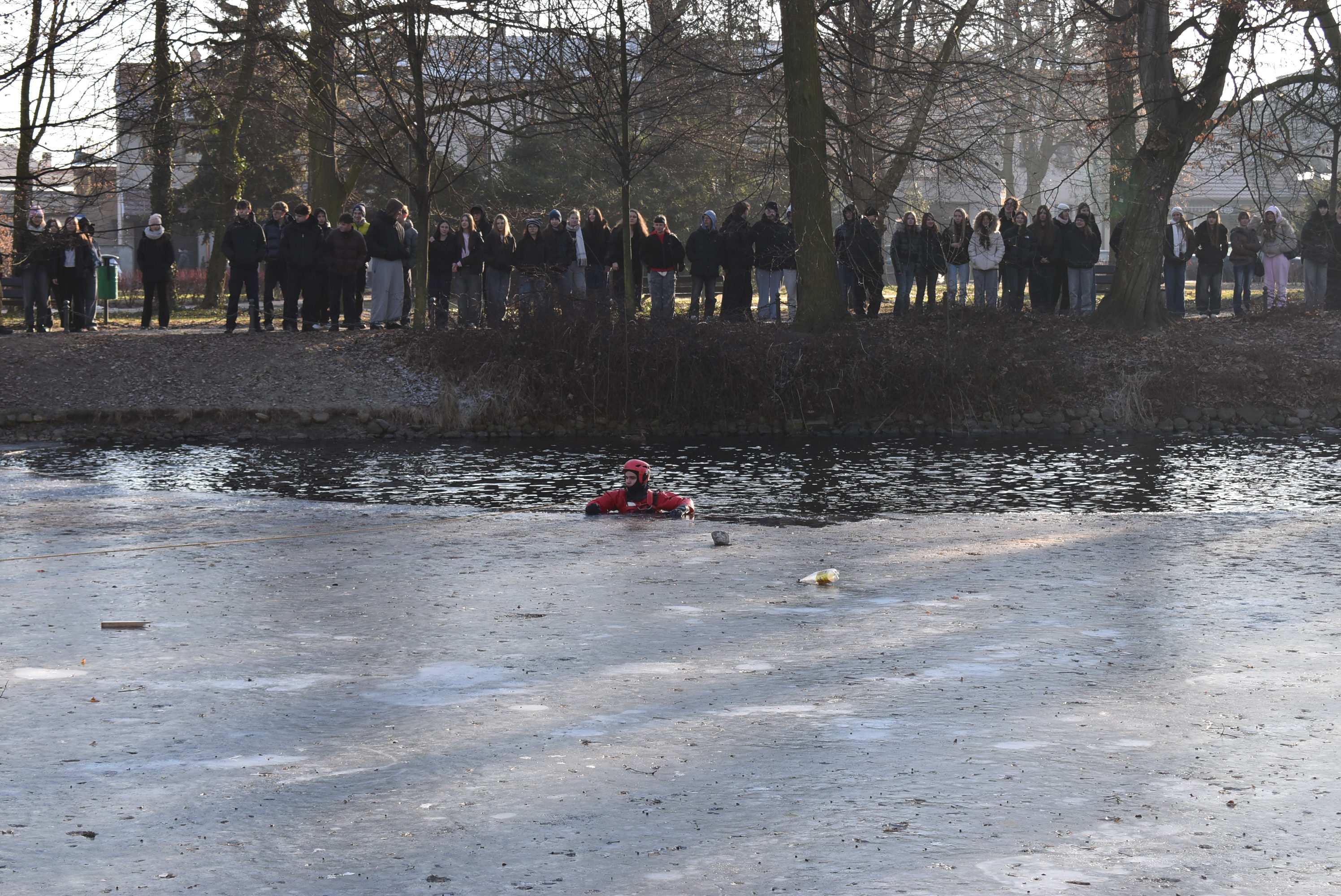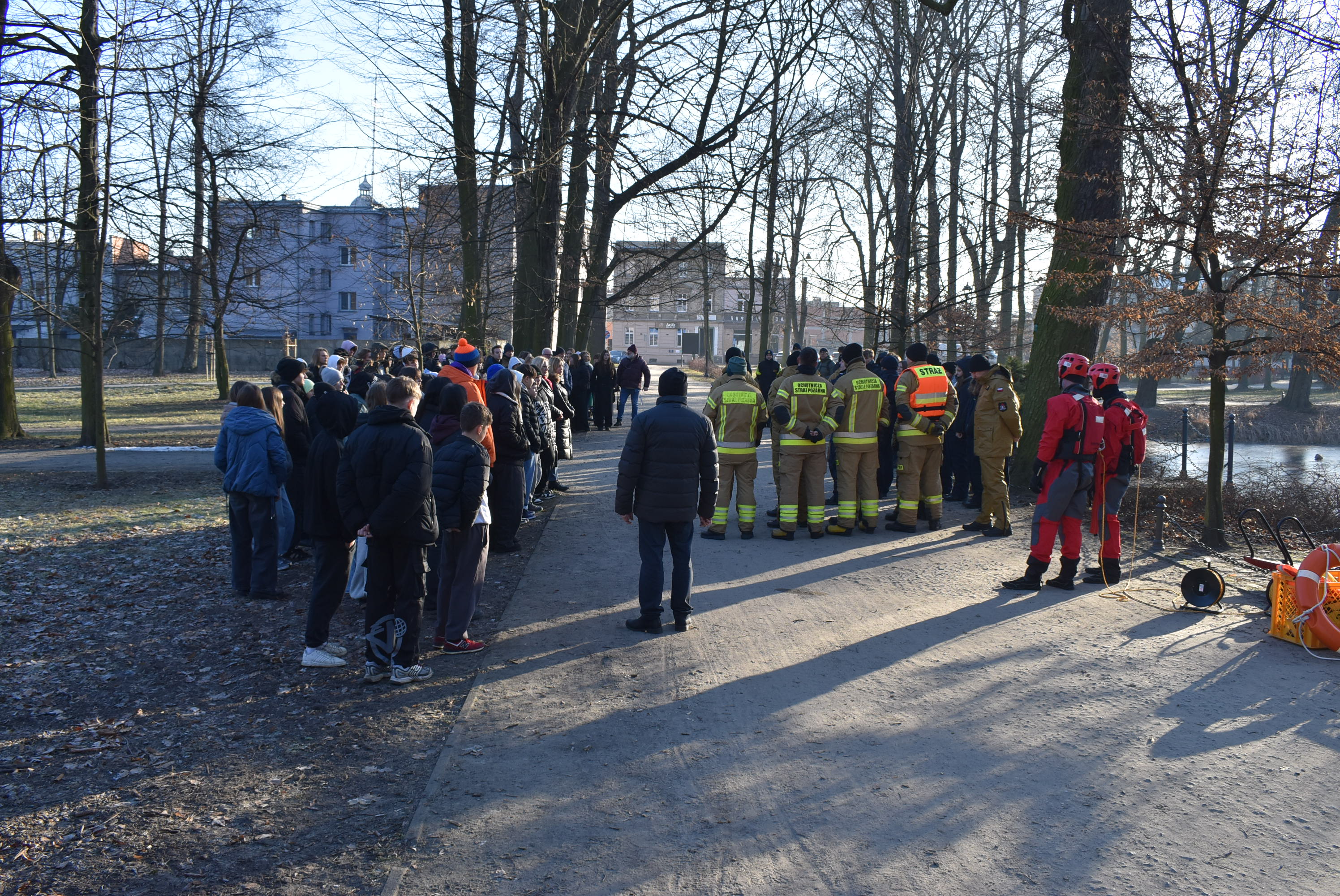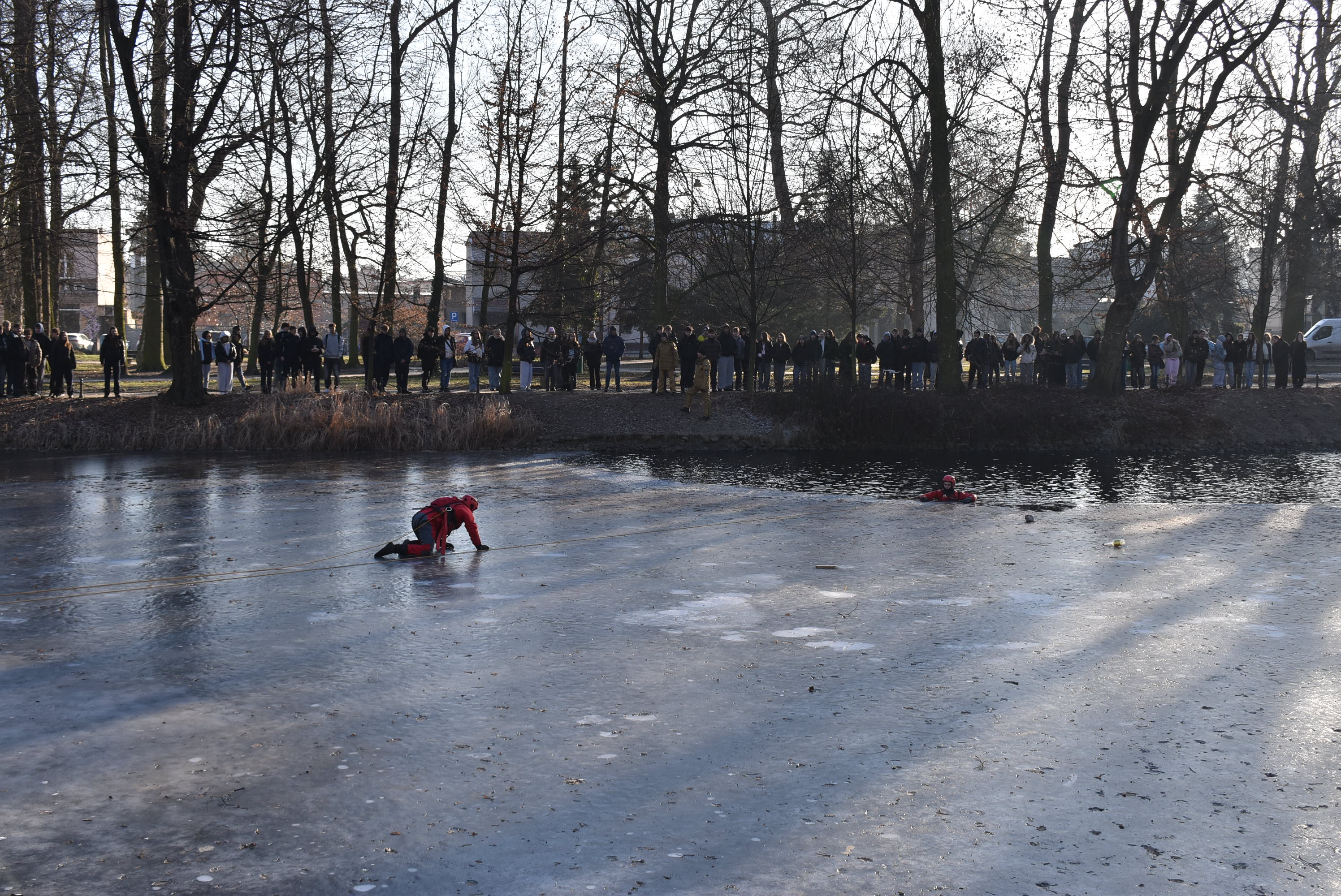 Jedna z takich inicjatyw odbyła się w poniedziałek, 19 stycznia 2026 roku, w parku im. Wojska Polskiego w Krotoszynie. Krotoszyńscy strażacy, policjanci oraz strażnicy miejscy przeprowadzili prelekcje oraz pokazowe działania ratownicze, których celem było uświadomienie – szczególnie młodym ludziom – jak niebezpieczne może być wchodzenie na zamarznięte zbiorniki wodne oraz lekceważenie zasad bezpieczeństwa w sezonie grzewczym.