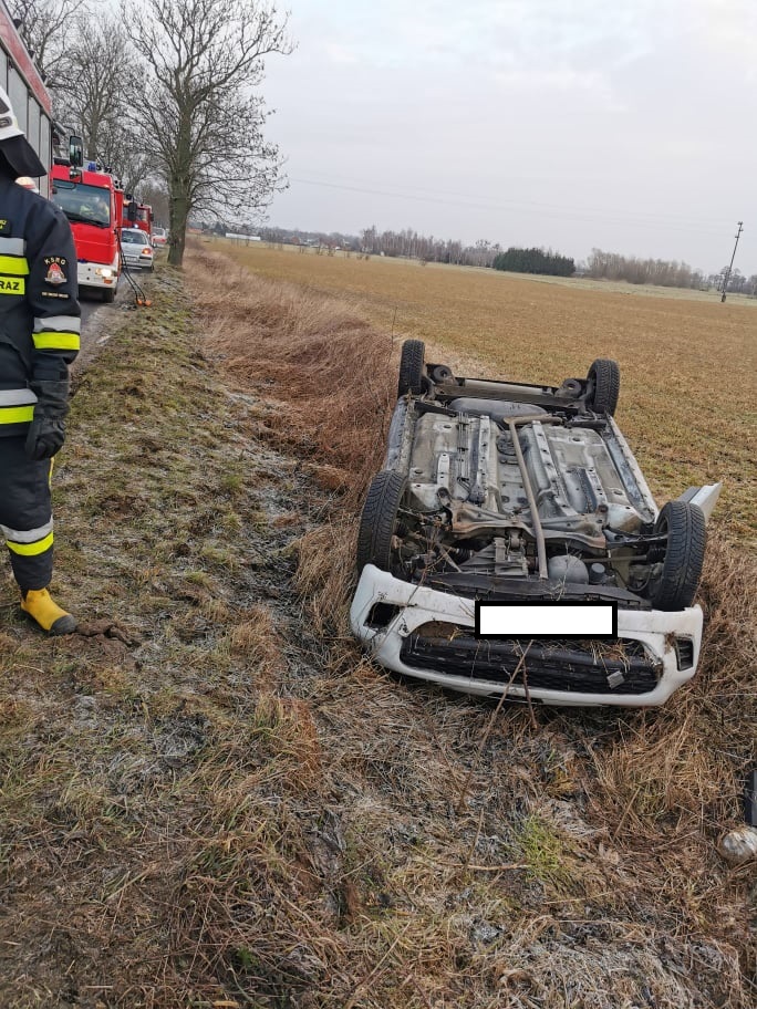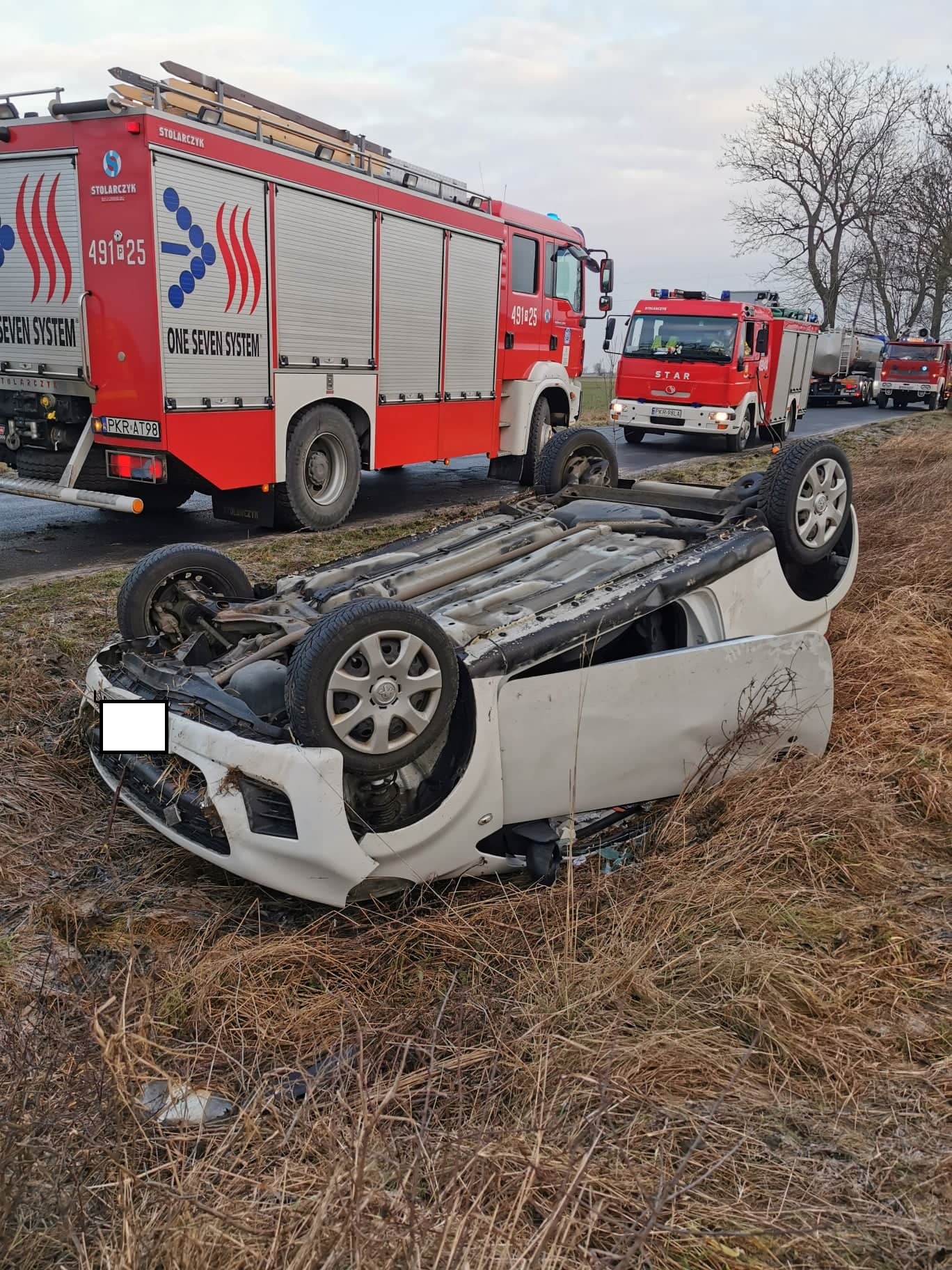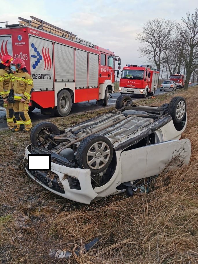 Podczas dojazdu we wskazaną lokalizację pierwszy zastęp pożarniczy ustalił, że do zdarzenia doszło na drodze pomiędzy Łagiewnikami a Starkówcem więc pozostałe zastępy po sprawdzeniu trasy wskazanej w zgłoszeniu dojechały do miejsca prowadzonych działań. Na miejscu w wyniku przeprowadzonego rozpoznania Kierujący Działaniem Ratowniczym ustalił, że samochód osobowy wypadł z drogi i znajdował się na dachu w rowie. Pojazdem podróżował jedna osoba i w momencie przybycia jednostek straży pożarnej znajdowała się poza pojazdem. Strażacy po zabezpieczeniu miejsca zdarzenia pomogli ratownikom medycznym w transporcie osoby poszkodowanej do karetki pogotowia, gdzie były prowadzone dalsze badania. Po przeprowadzeniu czynności dochodzeniowych przez Policję strażacy postawili pojazd na koła, zweryfikowali wycieki płynów technicznych oraz odłączyli akumulator. Ratownicy medyczni podjęli decyzje o zabraniu osoby poszkodowanej do szpitala.