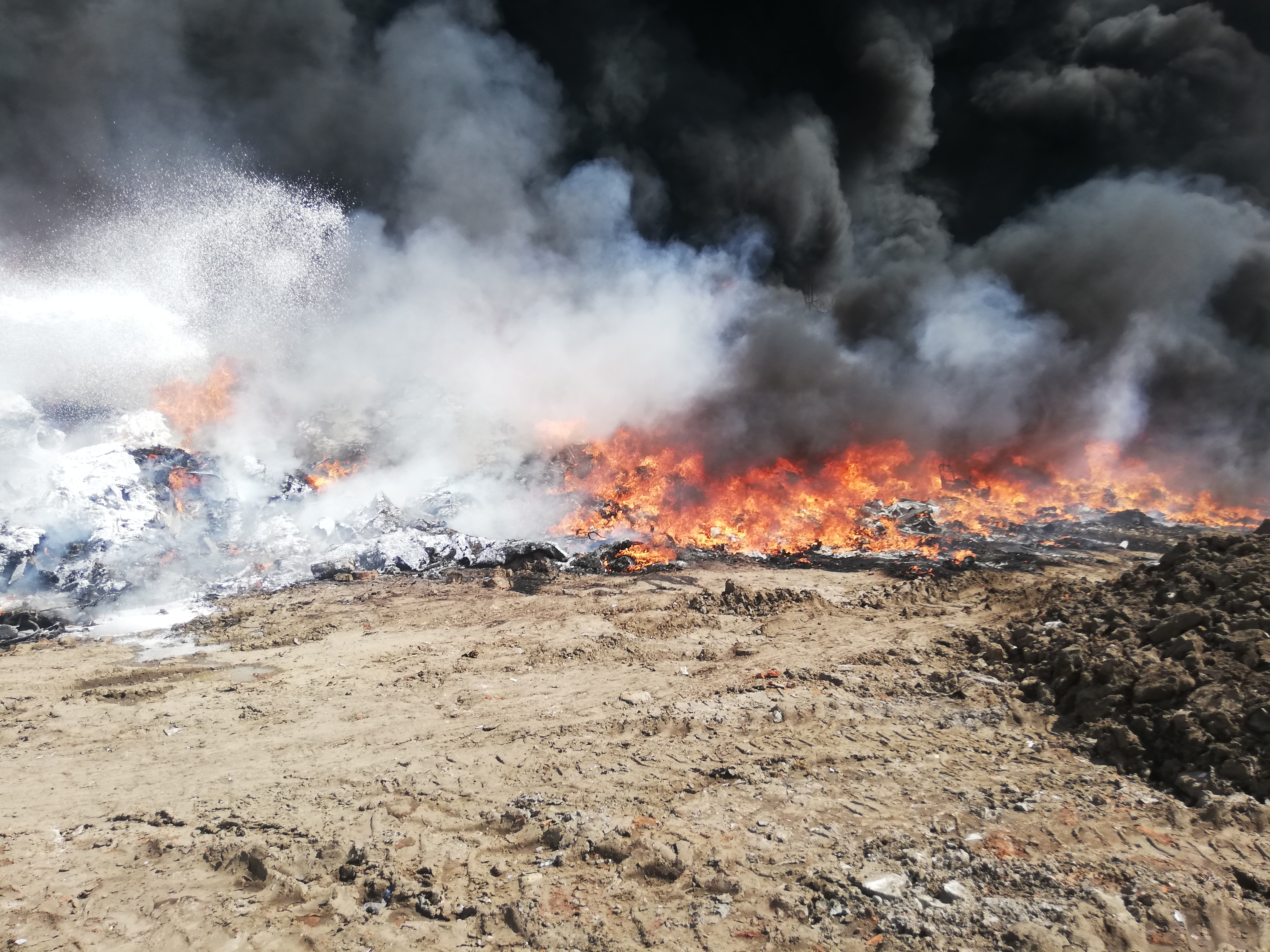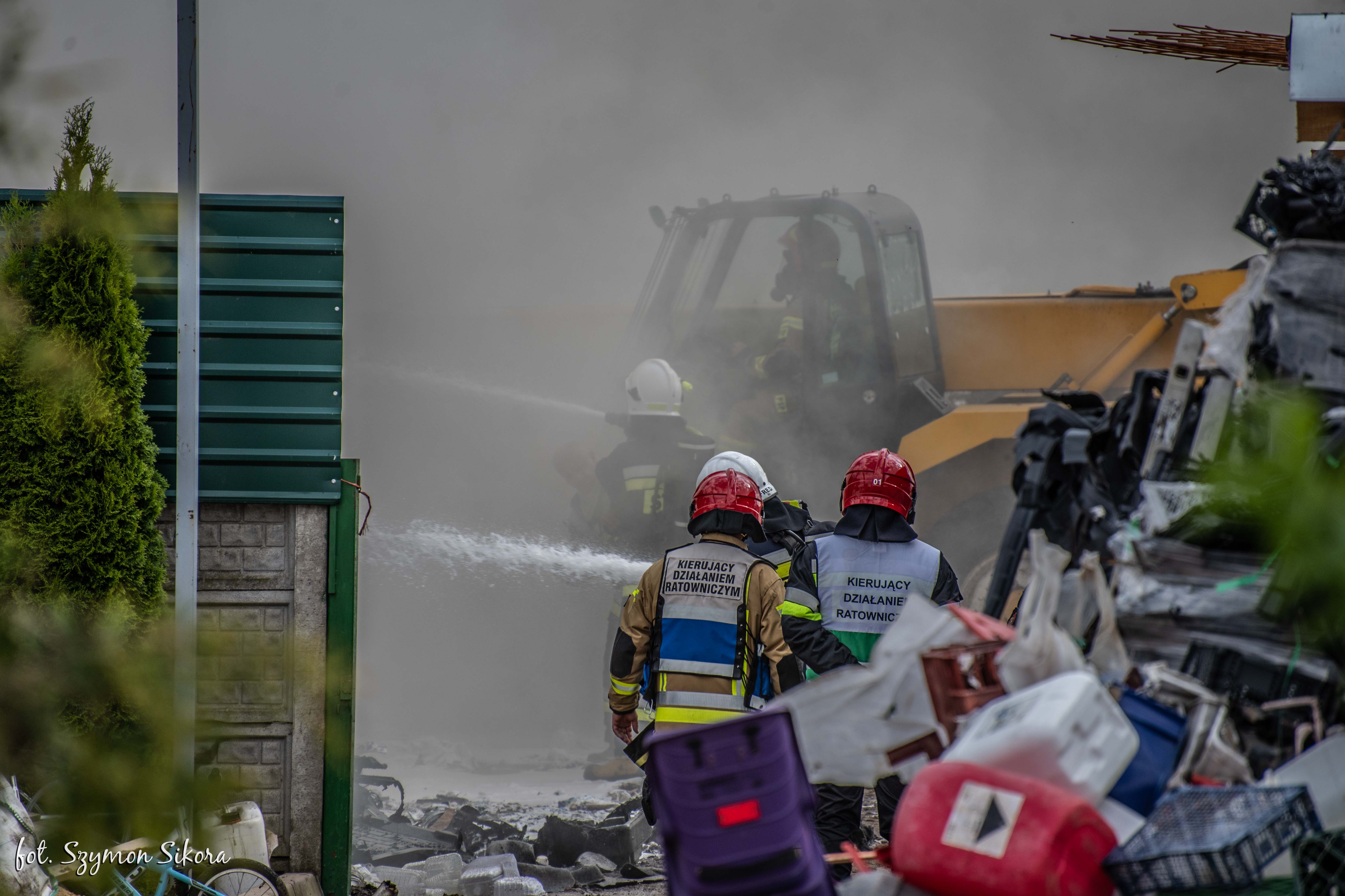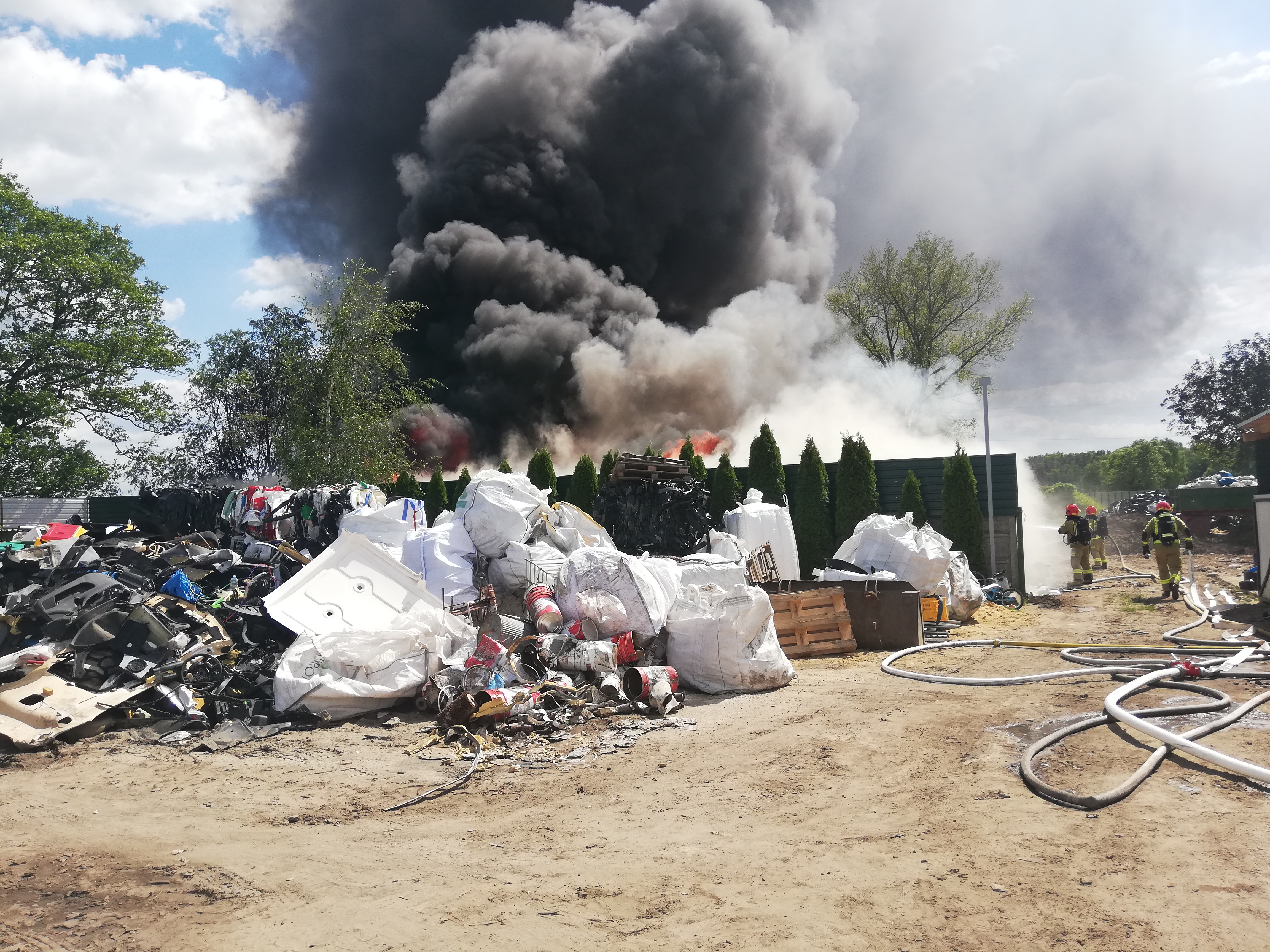 Kierujący Działaniem Ratowniczym w wyniku przeprowadzonego rozpoznania ustalił, że pali się w całej objętości sterta składowanych materiałów z tworzyw sztucznych. Pożar zagraża innym materiałom palnym składowanym na placu.