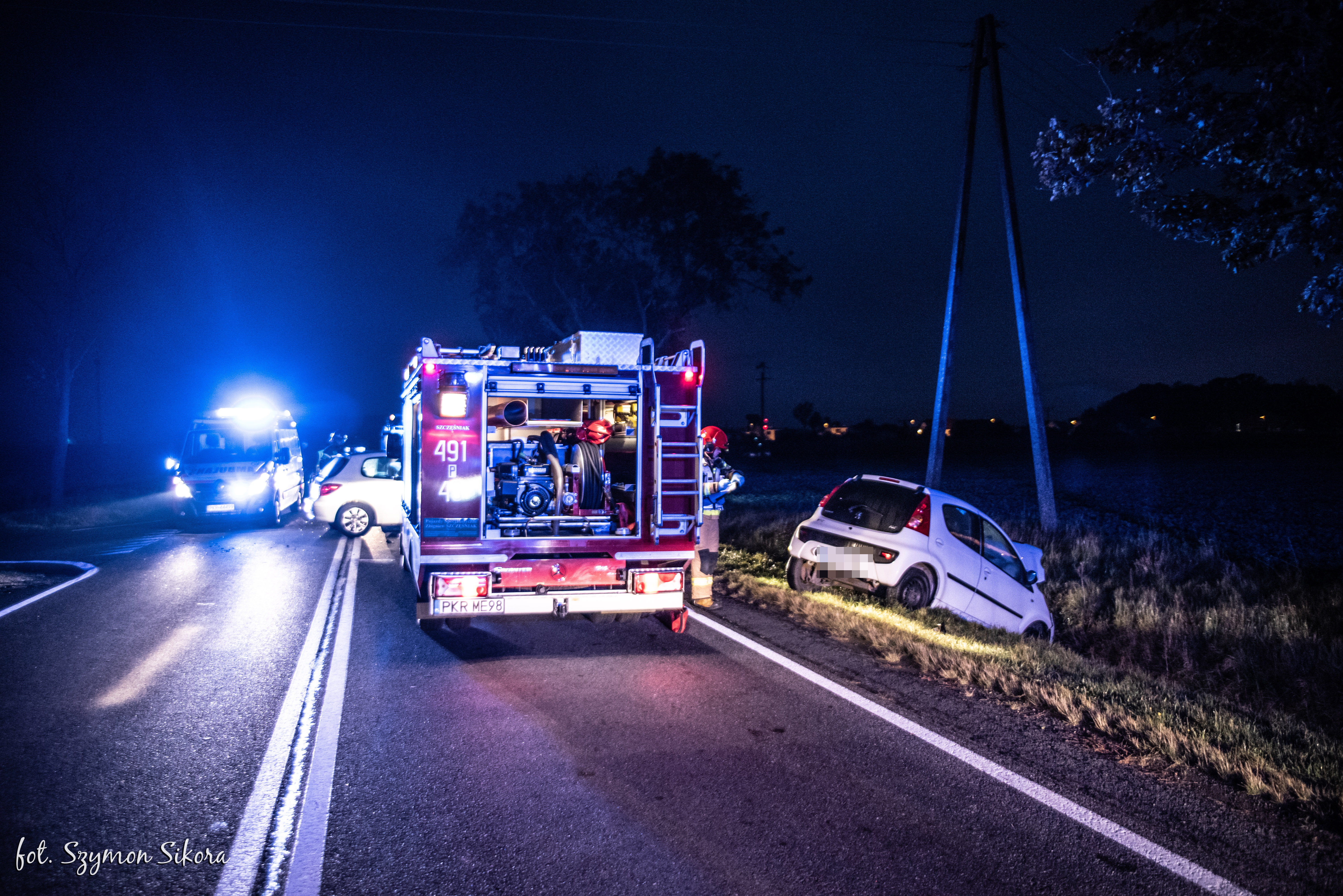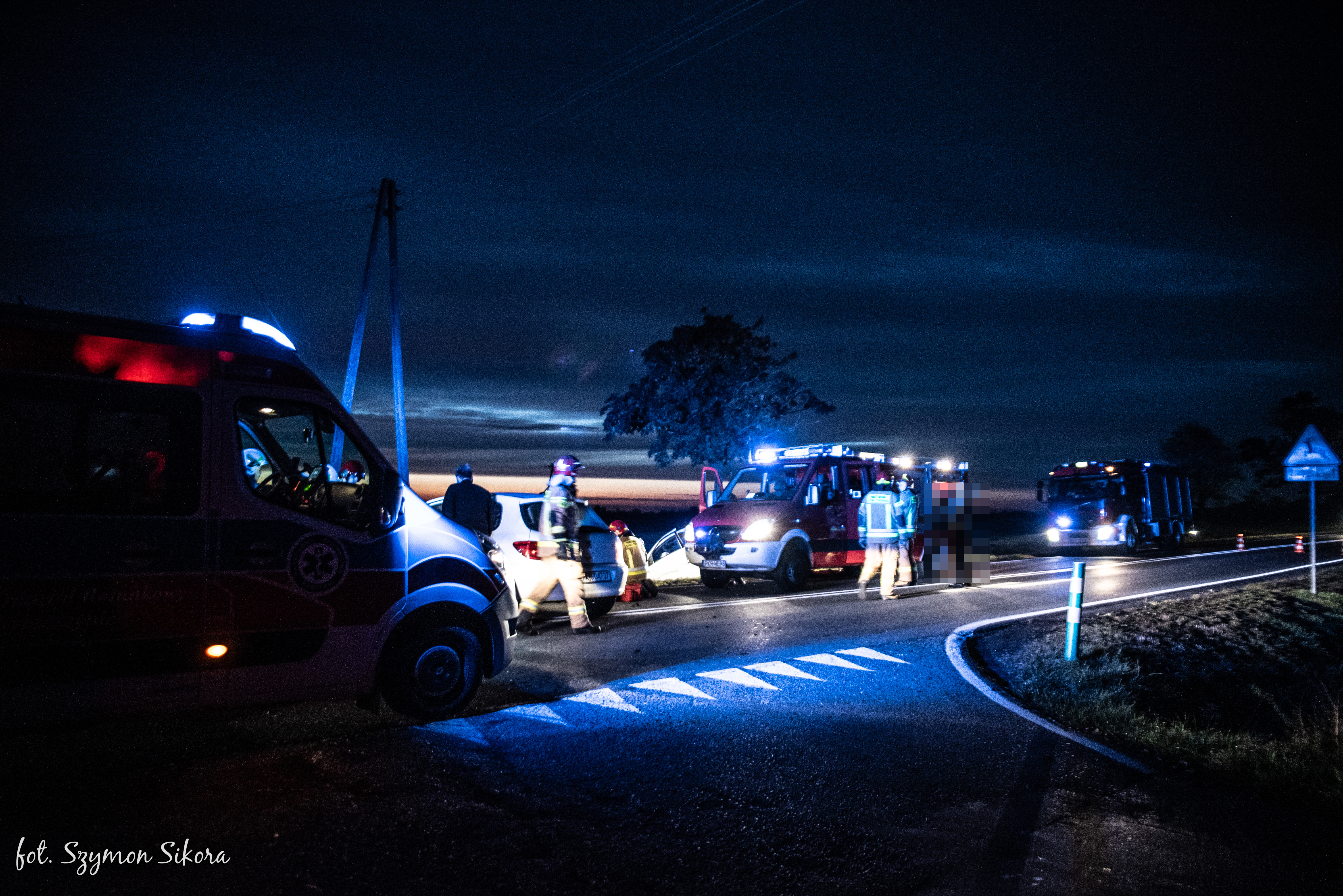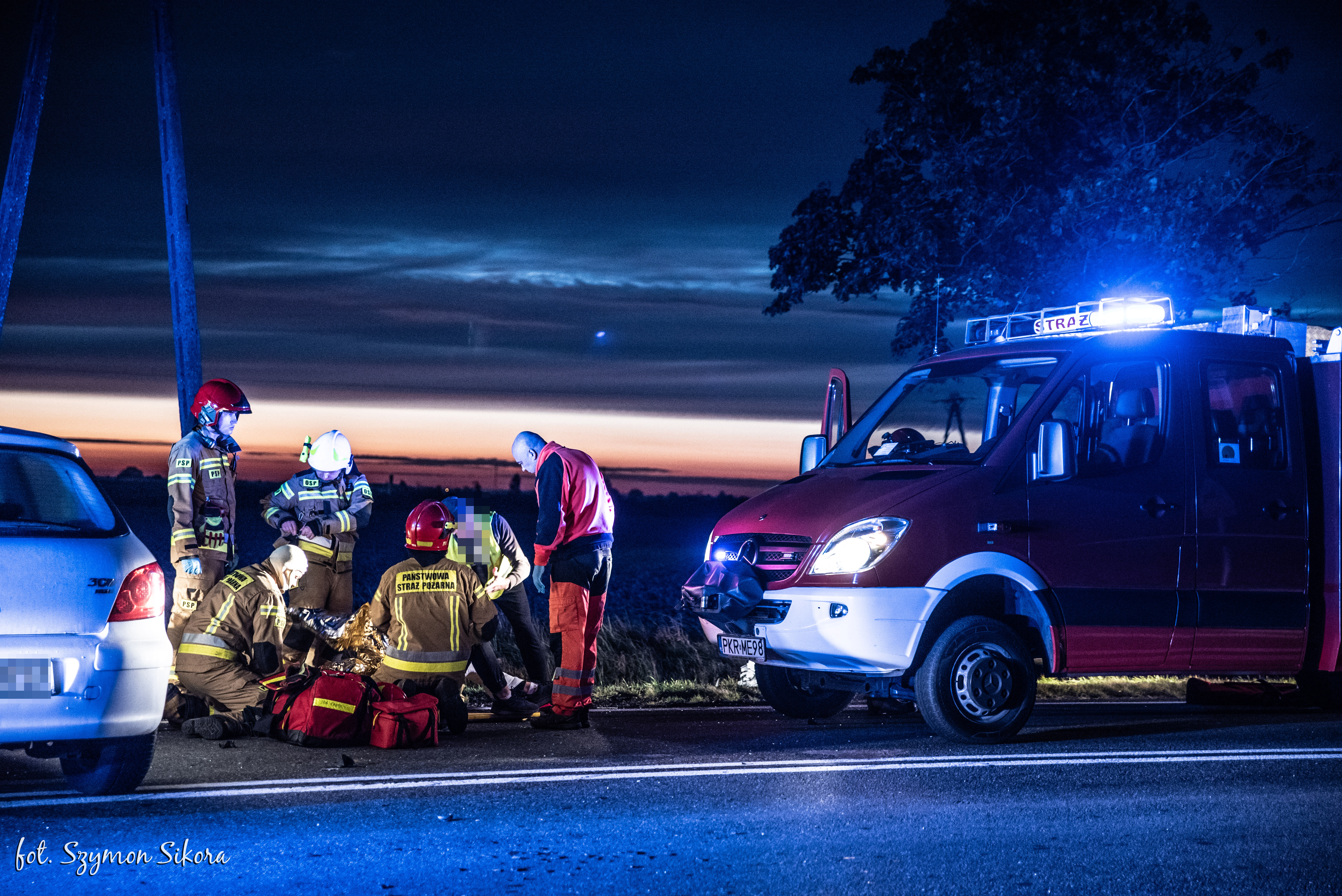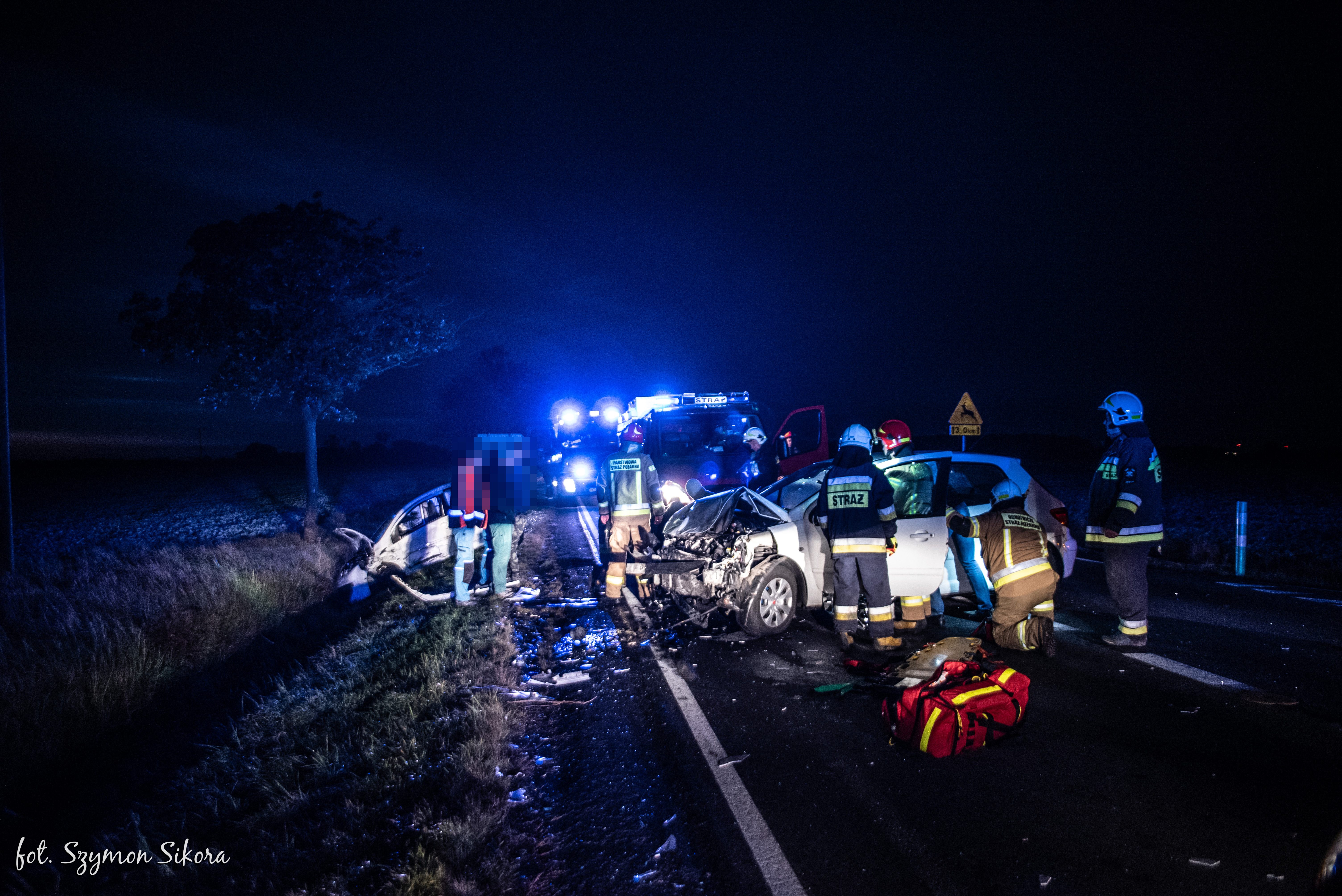 Działania straży pożarnej polegały na zabezpieczeniu miejsca zdarzenia, następnie wyznaczona rota medyczna wspólnie ze świadkiem zdarzenia, który jest jednocześnie ratownikiem medycznym, przystąpili do oceny stanu osób poszkodowanych pod kątem istniejących obrażeń. Po przybyciu na miejsce Zespołu Ratownictwa Medycznego jedną osobę poszkodowaną ewakuowano na noszach typu deska do karetki pogotowia. Druga z osób poszkodowanych ze względu na brak dodatkowych zagrożeń decyzją koordynatora medycznych działań ratowniczych pozostała wewnątrz pojazdu do czasu przybycia drugiego Zespołu Ratownictwa Medycznego, a następnie również w sposób bezpieczny ewakuowana do karetki pogotowia.