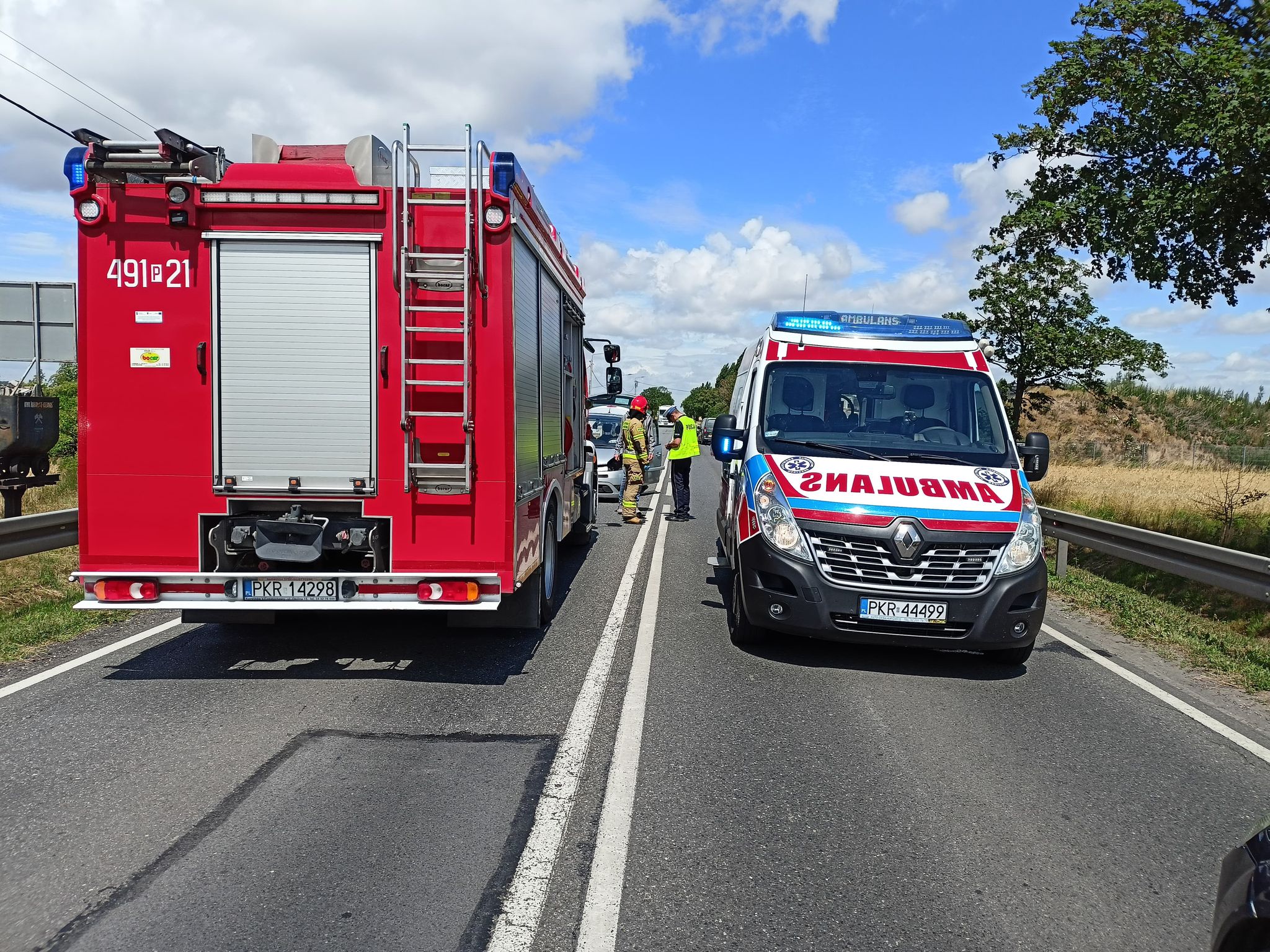 Działania straży pożarnej polegały na zabezpieczeniu miejsca zdarzenia. Strażacy przystąpili do udzielania kwalifikowanej pierwszej pomocy uczestnikom zdarzenia, dwójce małych dzieci strażacy w ramach wsparcia psychicznego podarowali maskotkę. Po dotarciu Zespołu Ratownictwa Medycznego osoby poszkodowane trafiły pod opiekę personelu medycznego. Kierownik zespołu po przeprowadzonym badaniu podjął decyzję o przewiezieniu dwójki uczestników w tym jednego dziecka do Szpitalnego Oddziału Ratunkowego. W rozbitych pojazdach odłączono zasilanie oraz zabezpieczono wycieki płynów technicznych. Po wykonaniu czynności realizowanych przez funkcjonariuszy policji pomoc drogowa zabrała rozbite pojazdy, a następnie ruch na drodze został przywrócony w obu kierunkach. Na czas prowadzonych działań Policja wyznaczyła objazdy.