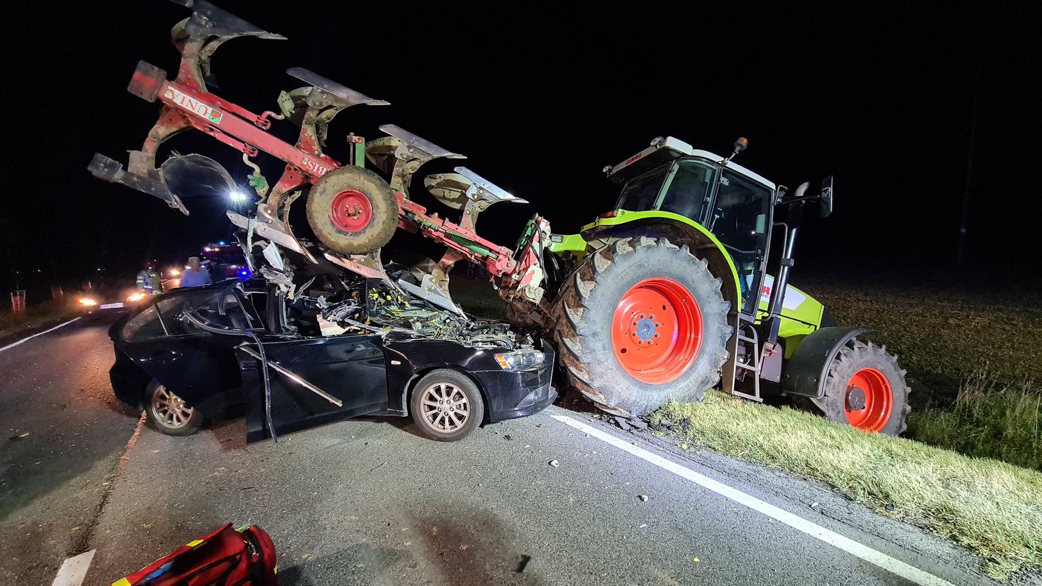 Na miejscu w wyniku przeprowadzonego rozpoznania Kierujący Działaniem Ratowniczym ustalił, że samochód osobowy najechał na tył ciągnika rolniczego i znalazł się pod podczepionym pługiem rolniczym, drugi pojazd osobowy znajdował się poza drogą w rowie. Pojazdami podróżowały łącznie cztery osoby. Strażacy zabezpieczyli i oświetlili miejsce zdarzenia następnie przystąpili do udzielania kwalifikowanej pierwszej pomocy uczestnikom zdarzenia do czasu przybycia Zespołu Ratownictwa Medycznego. Po przybyciu karetki pogotowia personel medyczny przejął opiekę nad poszkodowanymi. Spośród wszystkich uczestników zdarzenia jedna osoba została przewieziona do Szpitala. W dalszej części działań strażacy w rozbitych pojazdach odłączyli akumulatory i zabezpieczyli wycieki płynów technicznych. Ruch na drodze na czas prowadzonych działań był całkowicie zablokowany, Policja zorganizował objazdy. Po zakończonych czynnościach dochodzeniowych Policji pomoc drogowa odholowała uszkodzone pojazdy. Z jezdni zostały usunięte zalegające elementy karoserii oraz wyciek płynów eksploatacyjnych. Na tym działania zakończono, zastępy powróciły do miejsc stacjonowania. Działania straży pożarnej trwały 4 godziny i 40 minut.