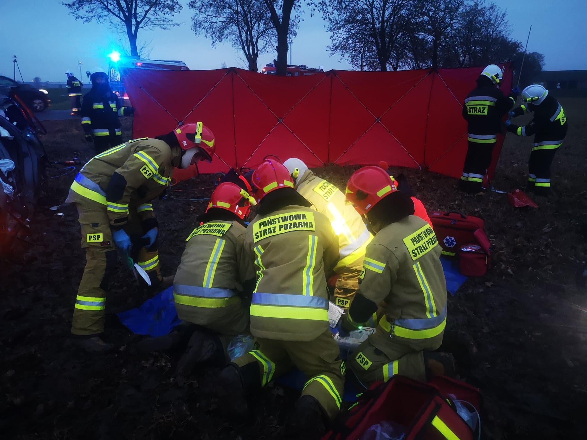 w zdeformowanym pojeździe. Z uwagi na stwierdzony brak czynności życiowych u młodego mężczyzny strażacy rozpoczęli walkę o ludzkie życie, wykonując natychmiastowy dostęp do kierowcy za pomocą narzędzi hydraulicznych, celem jego pilnej ewakuacji. Podjęte czynności umożliwiły rozpoczęcie skutecznej resuscytacji krążeniowo - oddechowej z użyciem automatycznego defibrylatora oraz sprzętu do tlenoterapii czynnej. Po otrzymaniu informacji o dyspozycji na miejsce Lotniczego Pogotowia Ratunkowego decyzją Kierującego Działaniami Ratowniczymi wyznaczono lądowisko na pobliskim polu uprawnym, prowadząc nasłuch na kanale współdziałania ze statkami powietrznymi. W momencie przybycia na miejsce karetki pogotowia uczestnika zdarzenia przekazano pod opiekę ratownika medycznego, kontynuując czynności ratunkowe. Po wylądowaniu śmigłowca koordynacje działań medycznych na miejscu wypadku przejął lekarz lotniczego pogotowia ratunkowego, który po upływie 34 minut resuscytacji stwierdził zgon młodego mężczyzny. Dalsze działania jednostek ochrony przeciwpożarowej na miejscu zdarzenia polegały na oświetleniu terenu akcji, oraz usunięciu elementów karoserii samochodowej z jezdni oraz pobliskiego pola. Po zakończonych czynnościach realizowanych przez prokuratora oraz funkcjonariuszy Policji działania zakończono i zastępy powróciły do miejsca stacjonowania. Interwencja straży pożarnej trwała łącznie 03 godziny i 36 minut.