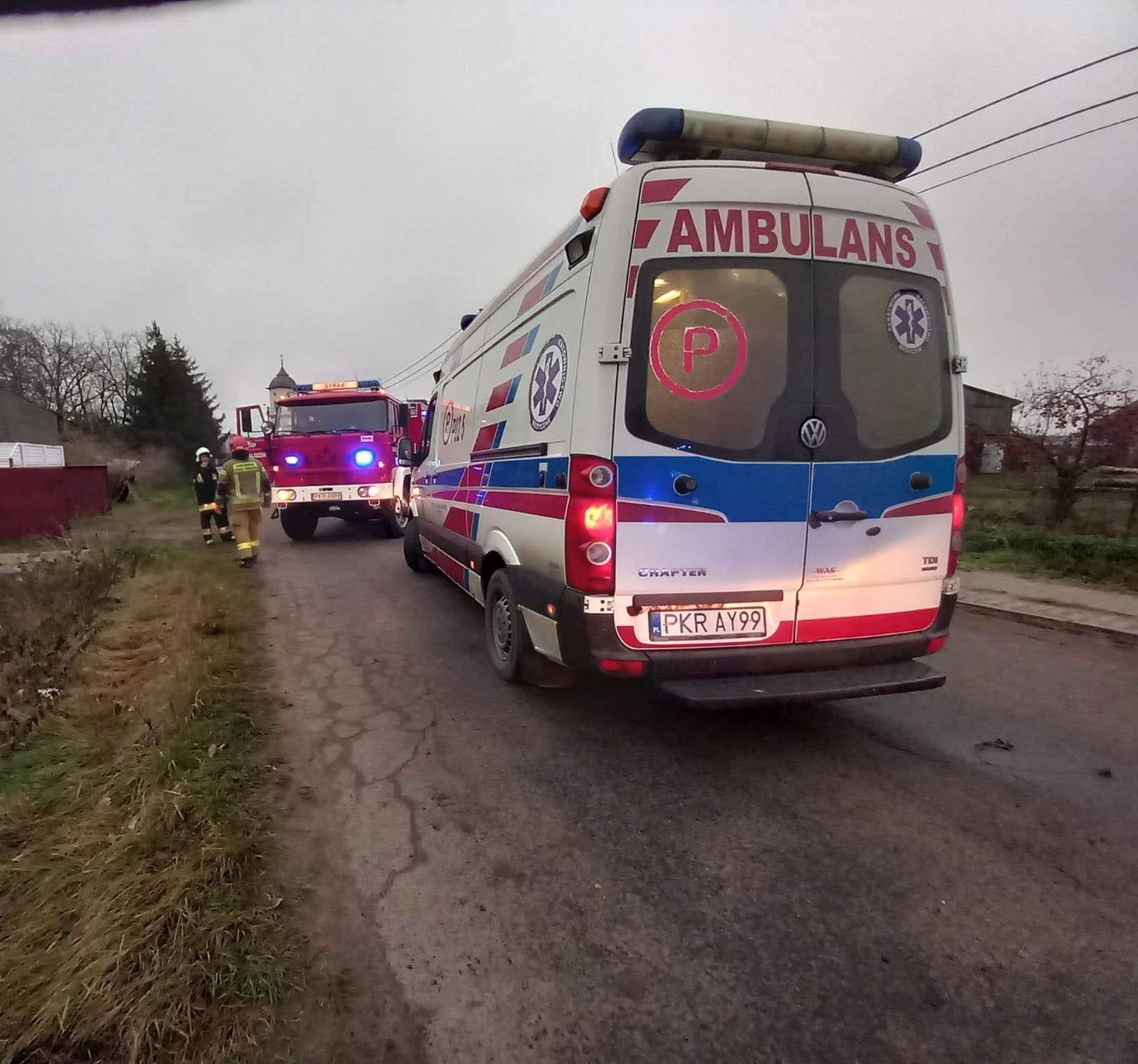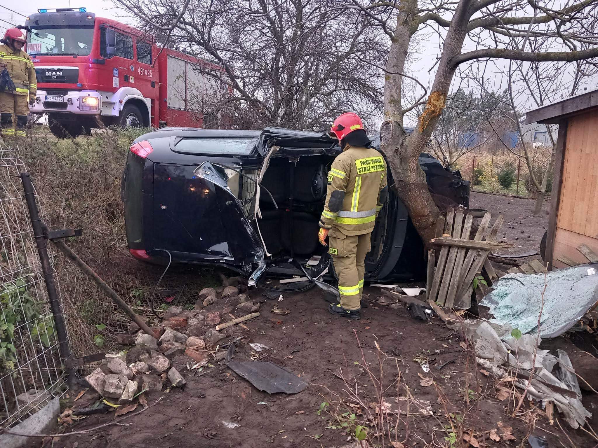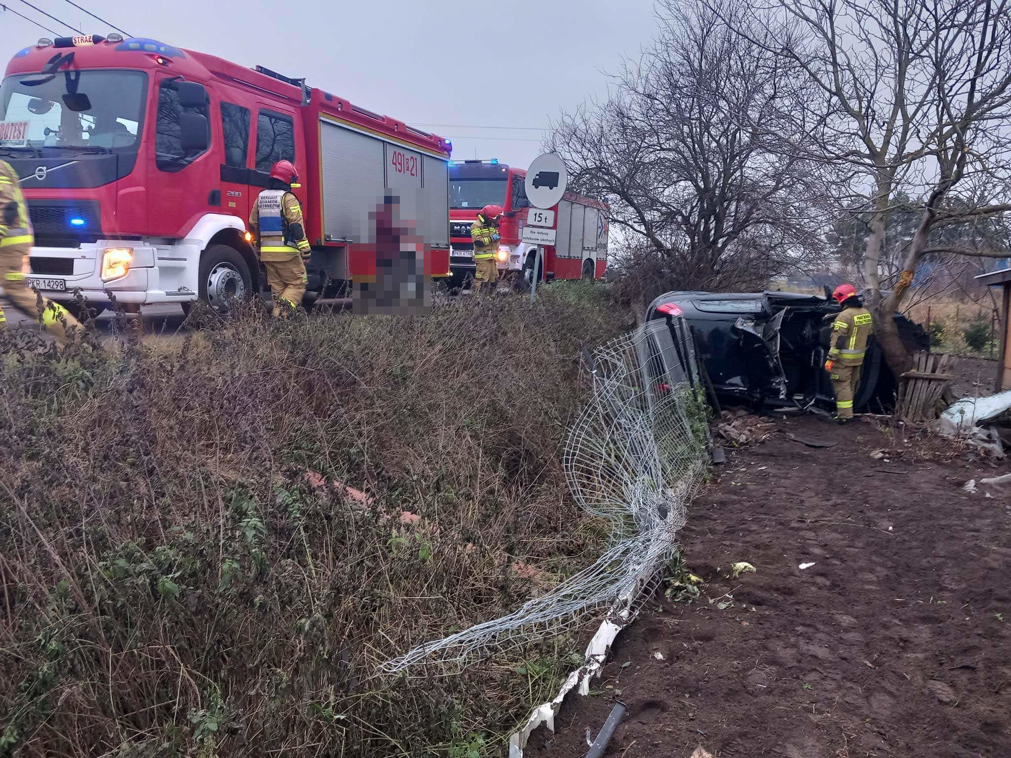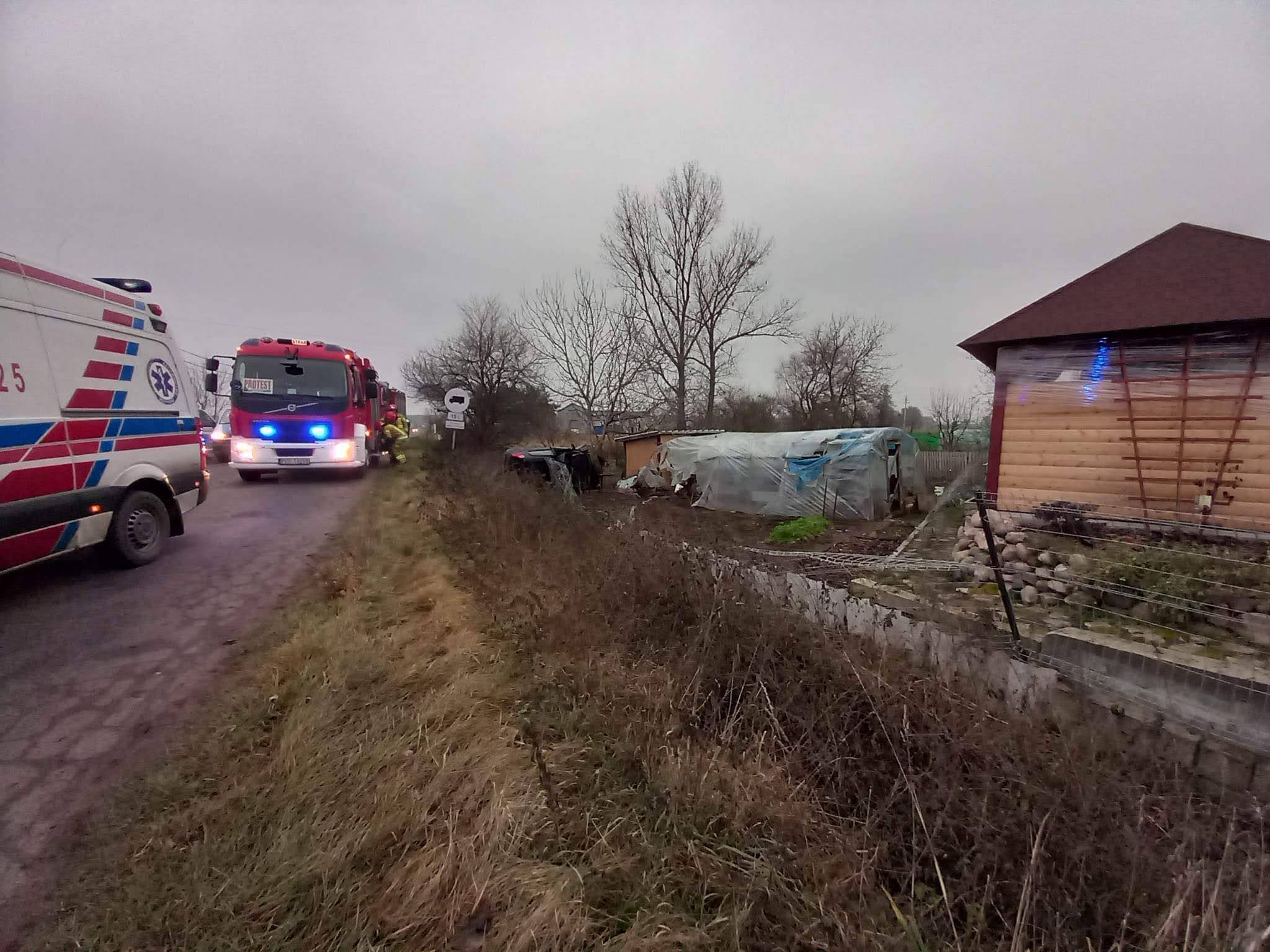 Po dojeździe straży pożarnej na miejsce wypadku w wyniku przeprowadzonego rozpoznania ustalono, że wewnątrz pojazdu leżącego na boku w przydomowym ogrodzie znajduje się przytomny kierowca. Deformacja bryły samochodu uniemożliwiała jego bezpieczną ewakuację ze strefy zagrożenia. Droga powiatowa została całkowicie zablokowana przez jednostki ochrony przeciwpożarowej.