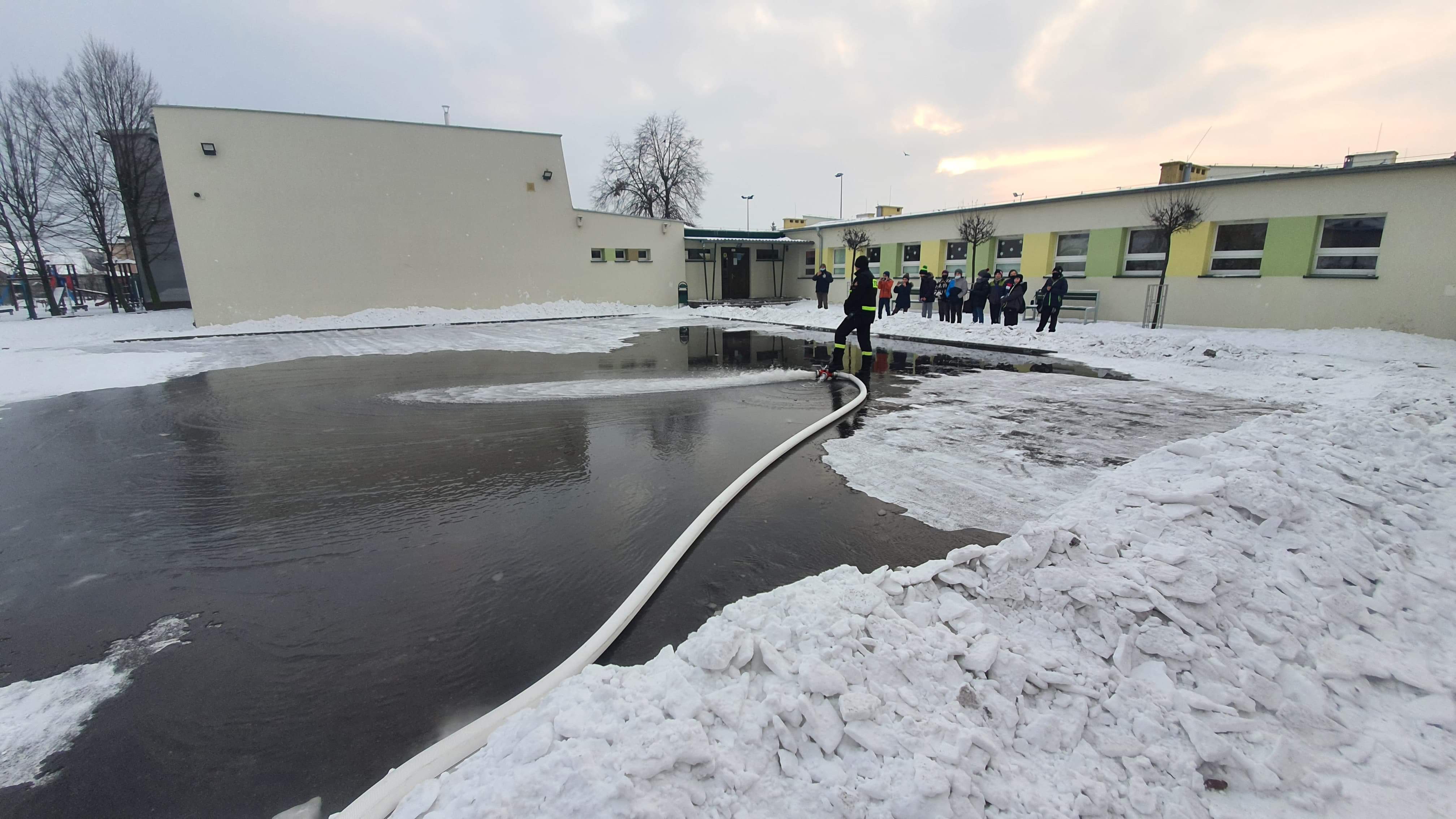 Strażacy wykonują zrzut wody na przygotowanym placu celem utworzenia bezpiecznego lodowiska. Lodowisko znajduje się na terenie szkoły podstawowej. Dzieci przyglądają się strażackiej akcji.