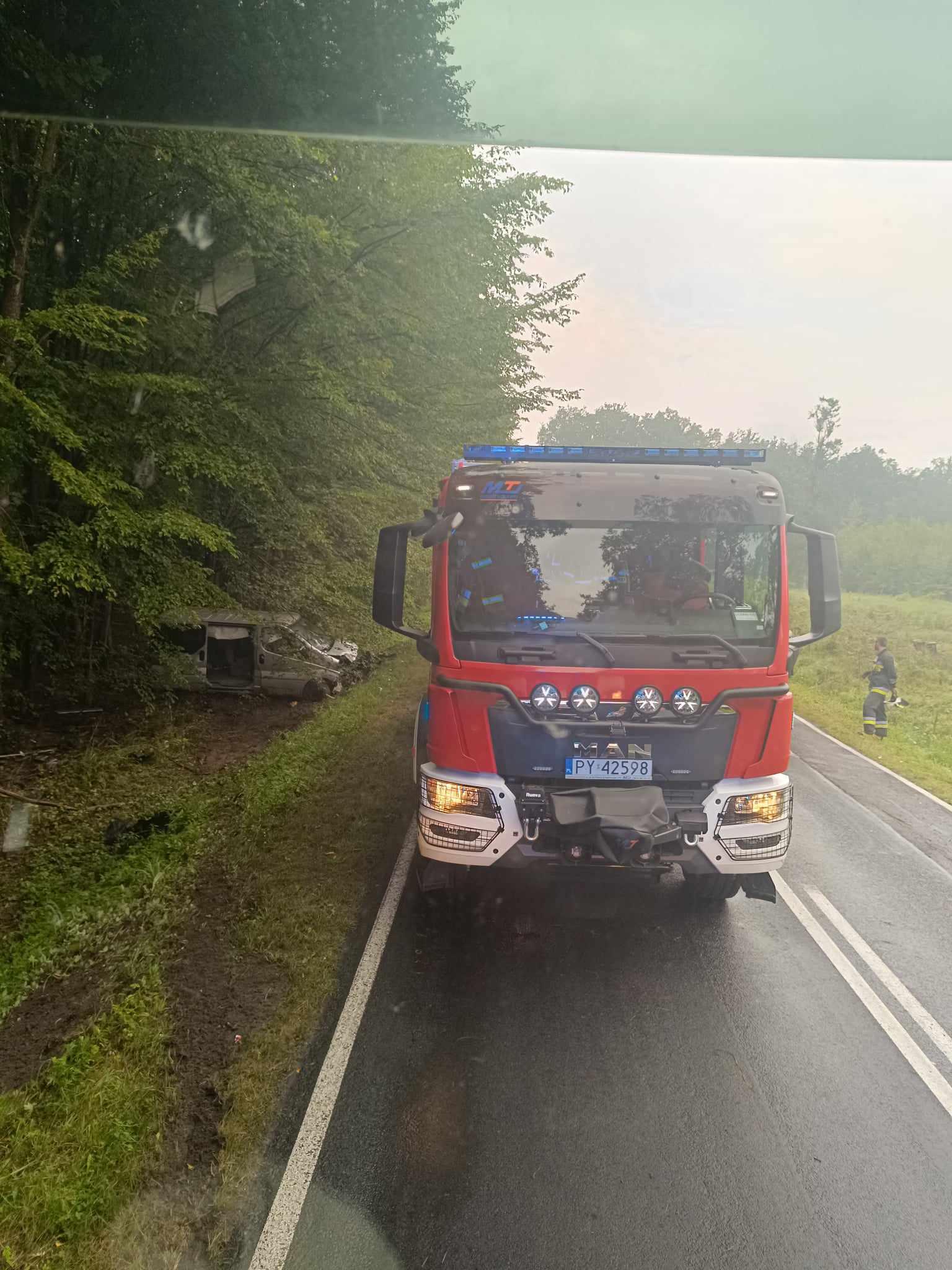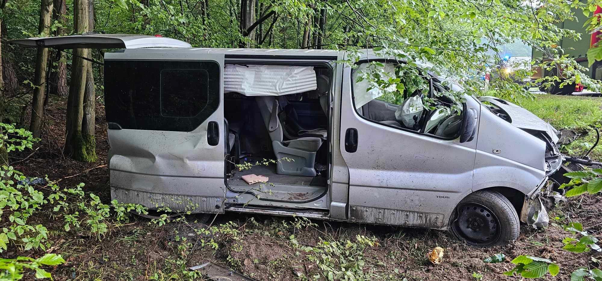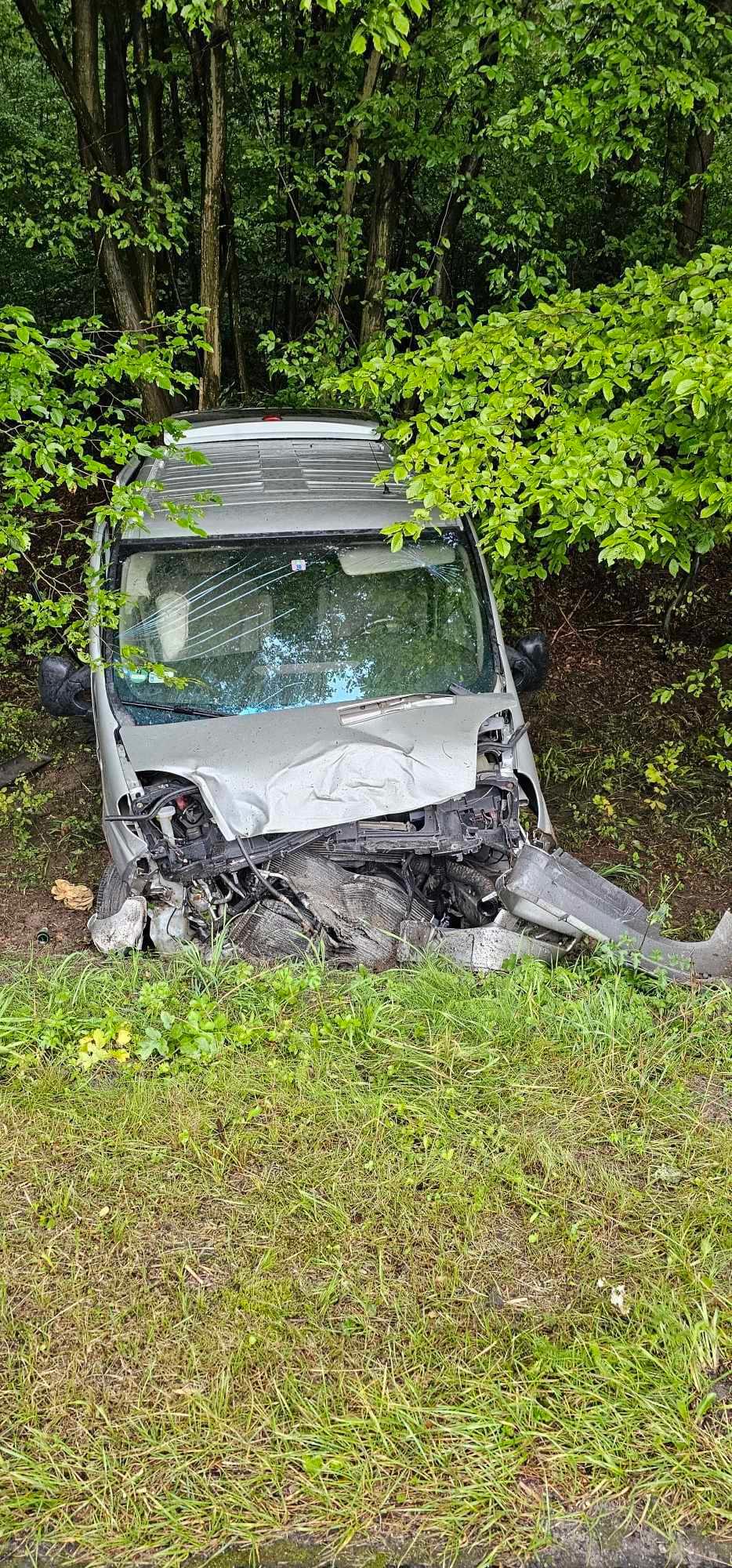 Podczas rozpoznania ustalono, że samochód typu bus na łuku drogi zjechał do rowu, uderzając w przydrożne drzewo. Wszystkie cztery osoby podróżujące pojazdem opuściły go o własnych siłach, uskarżając się na dolegliwości bólowe. Fragment drogi wojewódzkiej był całkowicie nieprzejezdny.