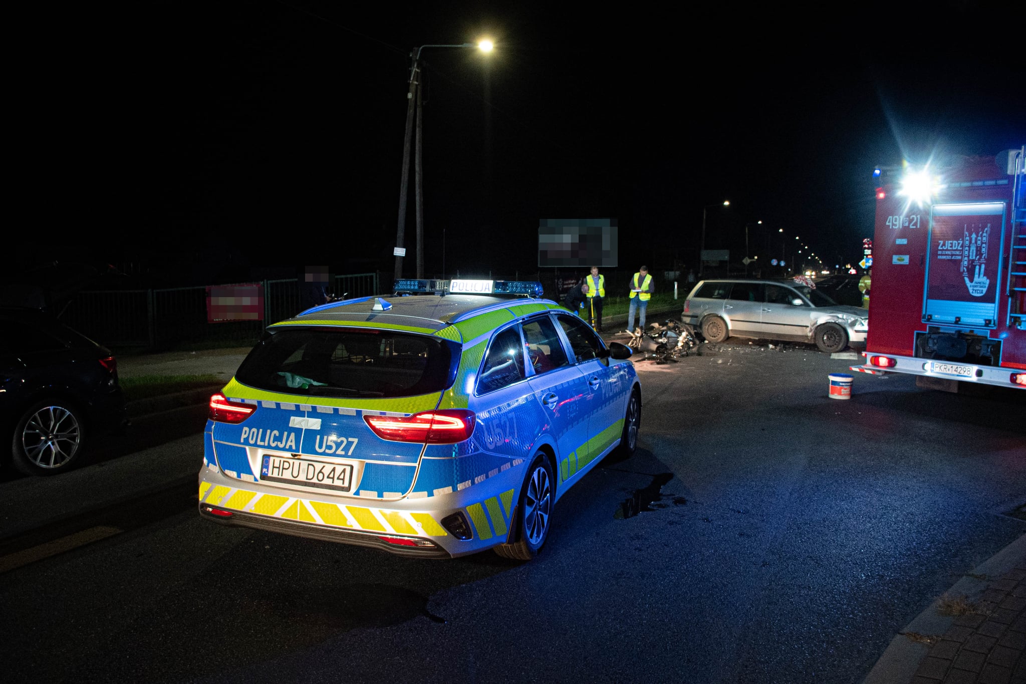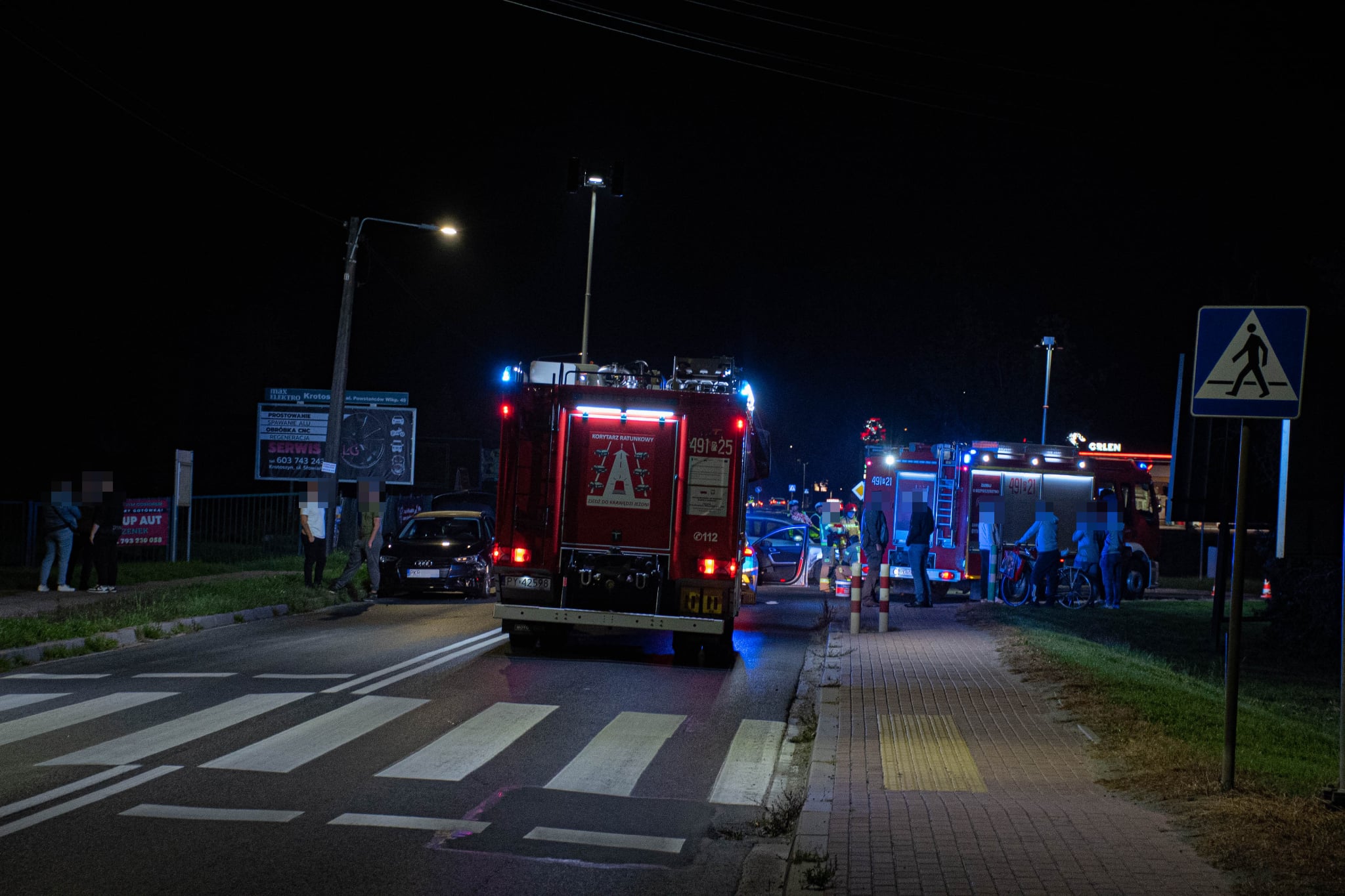Zgłoszenie do Stanowiska Kierowania Komendanta Powiatowego Państwowej Straży Pożarnej w Krotoszynie wpłynęło o godzinie 20:11. Po dotarciu na miejsce zastępów straży pożarnej Kierujący Działaniem Ratowniczym ustalił, że w zdarzeniu uczestniczyły 4 osoby. Kierowca jednośladu wymagał pomocy medycznej, pozostali uczestnicy nie odnieśli żadnych obrażeń. Działania straży pożarnej polegały na zabezpieczeniu i oświetleniu miejsca zdarzenia, następnie strażacy przystąpili do udzielania kwalifikowanej pierwszej pomocy osobie poszkodowanej, po dotarciu na miejsce zespołu ratownictwa medycznego poszkodowany został przetransportowany do karetki pogotowia następnie przewieziony do szpitala. Po zakończonych czynnościach realizowanych przez funkcjonariuszy Policji z drogi usunięto uszkodzone pojazdy oraz pozostałości po zdarzeniu drogowym. Na tym działania straży pożarnej zakończono i zastępy wróciły do miejsca stacjonowania. Działania straży pożarnej z udziałem dwóch zastępów z JRG Krotoszyn trwały 1 godzinę i 58 minut.