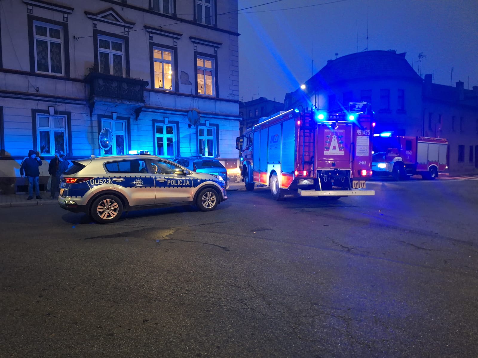 Po zabezpieczeniu terenu działań strażacy sprawdzili dwa lokale mieszkalne budynku wielorodzinnego w którym została uszkodzona elewacja. Po przeprowadzonej rewizji w mieszkaniach budynku nie stwierdzono uszkodzeń wewnątrz związanych ze zdarzeniem. Z uwagi na uszkodzenia elewacji w lokalu mieszkalnym, na miejsce zdarzenia wezwano przedstawiciela Nadzoru Budowlanego. W tym samym czasie strażacy odłączyli akumulator w samochodzie Volvo XC60. Po wykonaniu badania kierownik Zespołu Ratownictw Medycznego podjął decyzję o zabraniu poszkodowanej do szpitala w celu dalszej diagnostyki. Na miejsce zdarzenia dotarł Powiatowy Inspektor Nadzoru Budowlanego, który po weryfikacji uszkodzenia wyłączył z użytku pomieszczenie w którym została uszkodzona ściana. Teren wokół uszkodzonego muru został wygrodzony przed osobami postronnymi. Po zabraniu pojazdów z jezdni usunięto pozostałości karoserii oraz płyny eksploatacyjne przy pomocy podręcznego sprzętu burzącego oraz sorbentu. Podczas działań ruch na drodze krajowej odbywał się wahadłowo.