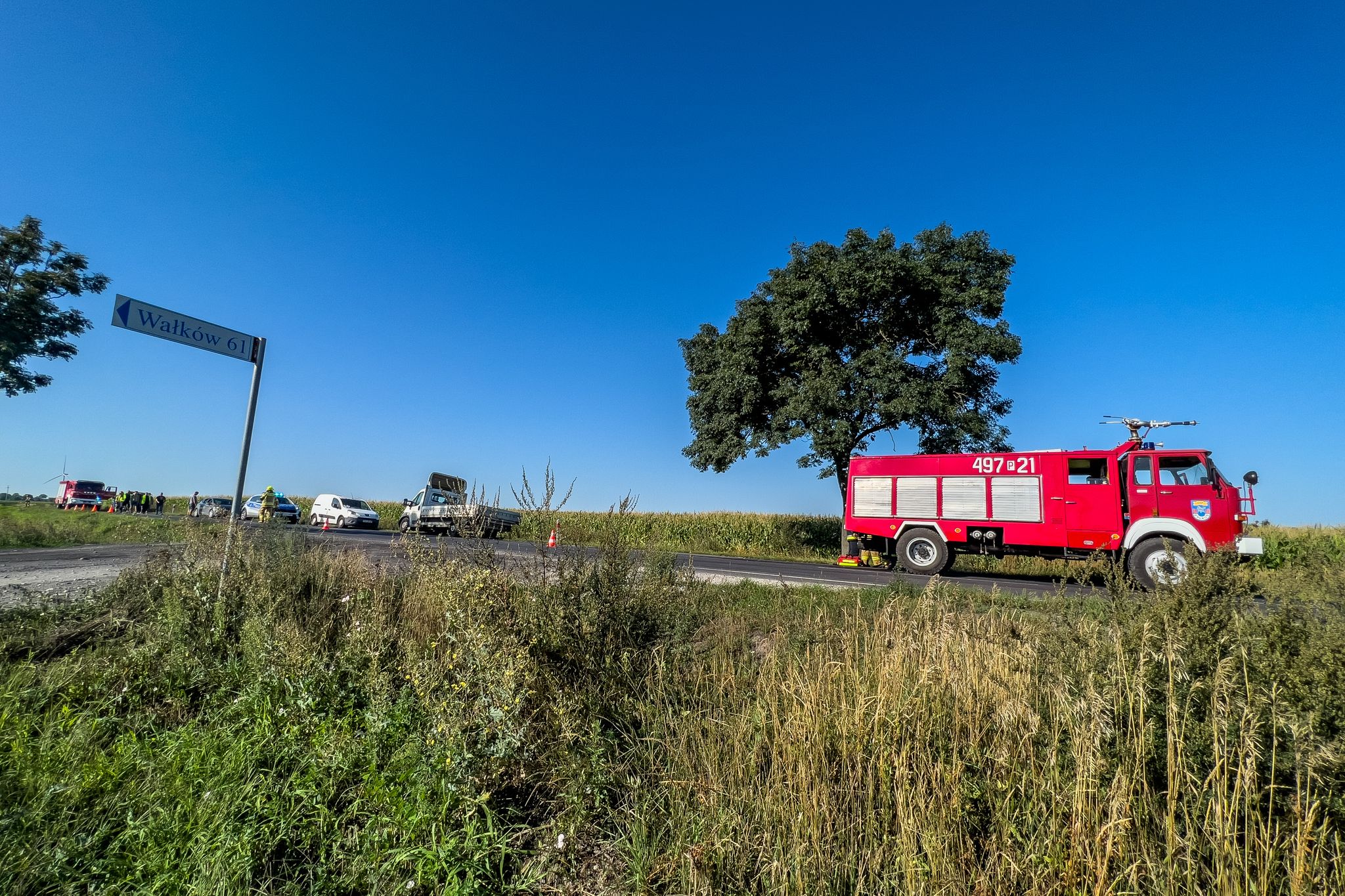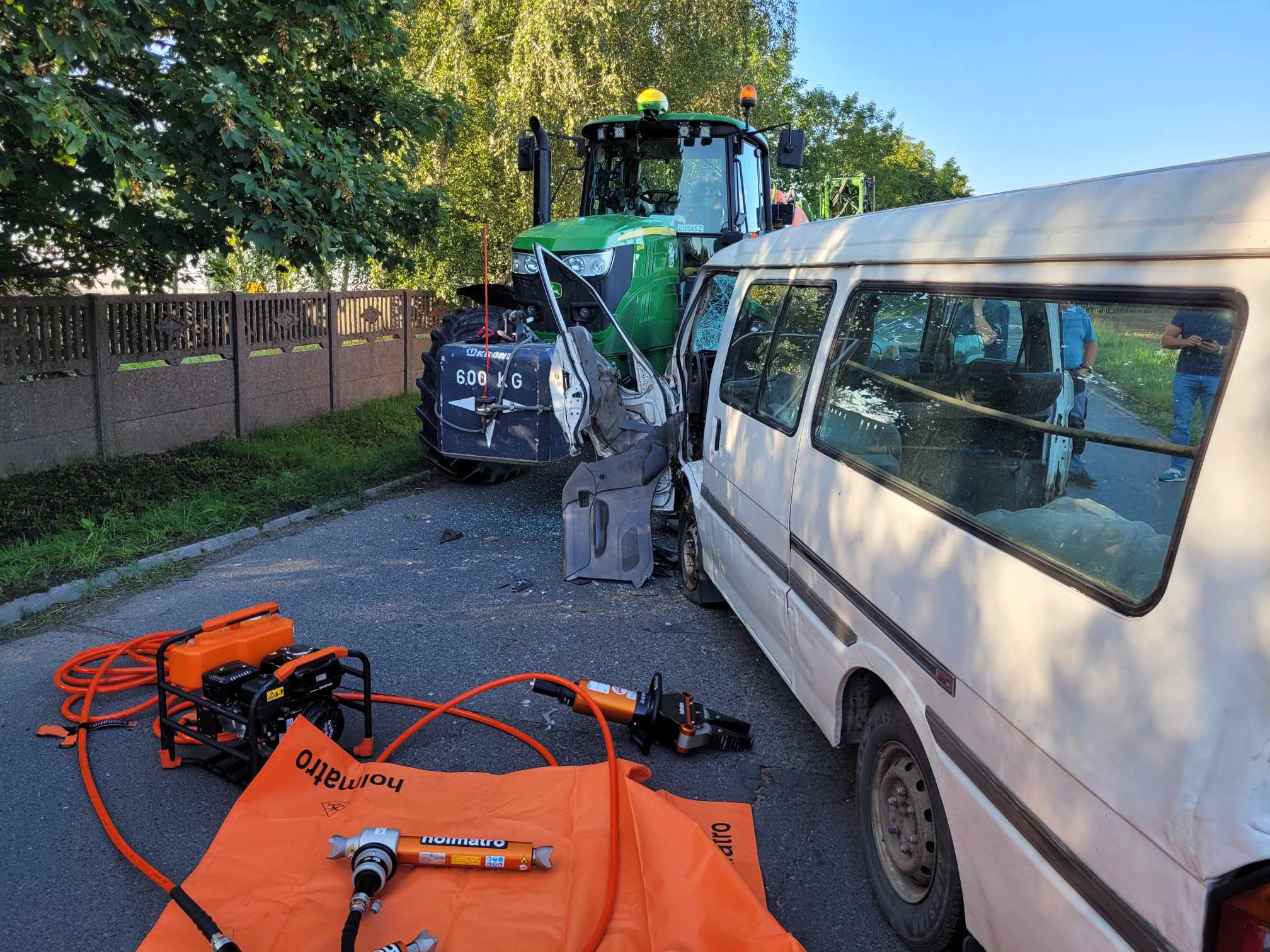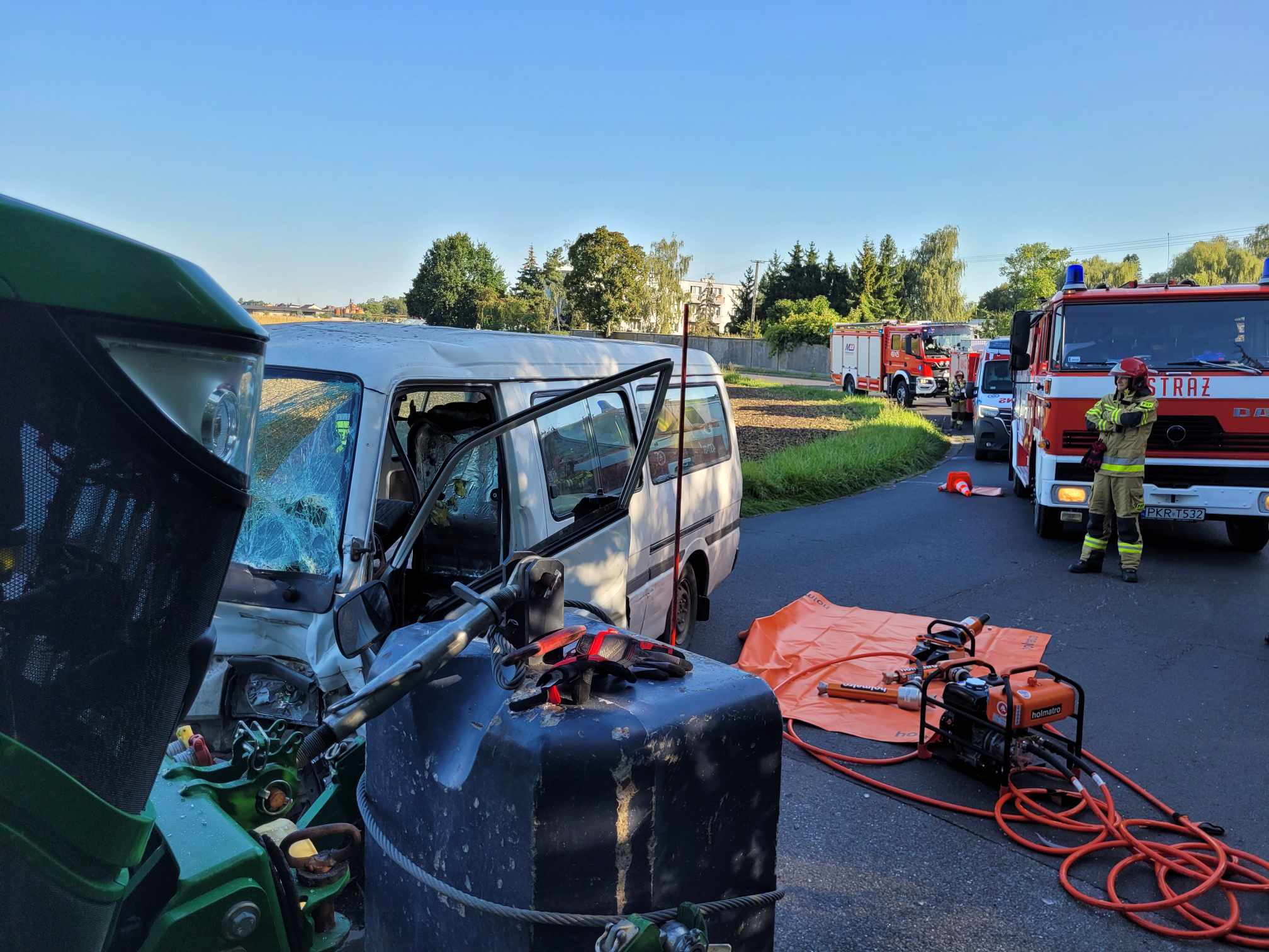 O godzinie 07:42 w miejscowości Smolice (gm. Kobylin) doszło do zderzenia samochodu osobowego z ciągnikiem rolniczym. Z uwagi na silną deformację bryły pojazdu dostęp do jednego z uczestników zdarzenia był utrudniony. Droga powiatowa w miejscu wypadku została całkowicie zablokowana. Strażacy po przybyciu na miejsce zdarzenia i zabezpieczeniu terenu działań wykonali dostęp do osoby poszkodowanej pozostającej w pojeździe osobowym przy użyciu narzędzi hydraulicznych. W momencie uzyskania możliwości bezpiecznej ewakuacji mężczyzny, ratownicy na noszach typu deska przetransportowali uczestnika zdarzenia do karetki pogotowia. Decyzją kierownika zespołu osoba poszkodowana została przewieziona do placówki medycznej celem szerszej diagnostyki. Po zakończeniu czynności realizowanych przez funkcjonariuszy Policji z jezdni usunięto uszkodzone środki transportu oraz materiały stwarzające zagrożenie dla pojazdów kołowych. Czynności te zrealizowano przy pomocy sorbentu oraz podręcznego sprzętu burzącego. W działaniach trwających łącznie 03 godziny i 47 minut uczestniczyły dwa zastępy z Jednostki Ratowniczo – Gaśniczej PSP w Krotoszynie oraz jednostki OSP Kobylin i OSP Smolice. Dysponowany do zdarzenia w gminie Kobylin średni samochód gaśniczy z krotoszyńskiej jednostki został zawrócony i skierowany do drugiego wypadku komunikacyjnego w miejscowości Wałków. Tuż po godzinie 8:00 na drodze krajowej doszło do zderzenia dwóch samochodów osobowych. W zdarzeniu tym uczestniczyły łącznie trzy osoby, które opuściły uszkodzone środki transportu o własnych siłach. Do czasu przybycia służb medycznych ratownicy udzielili uczestnikom zdarzenia kwalifikowanej pierwszej pomocy adekwatnej do poniesionych obrażeń. W momencie dotarcia zespołu ratownictwa medycznego trzech mężczyzn trafiło do karetki pogotowia celem dalszej diagnostyki. Kierownik zespołu nie stwierdził podstaw do hospitalizacji pozostawiając uczestników zdarzenia na miejscu wypadku. Z uwagi na powstałe utrudnienia na drodze krajowej ratownicy wspierali działania funkcjonariuszy Policji w zakresie koordynacji ruchu wahadłowego. Po zabraniu uszkodzonych środków transportu z jezdni usunięto pozostałości po zdarzeniu drogowym. W działaniach uczestniczył jeden zastęp z jednostki ratowniczo -gaśniczej PSP w Krotoszynie oraz jednostki OSP Koźmin Wielkopolski i OSP Wałków, a także zastęp OSP Golina z terenu powiatu jarocińskiego.