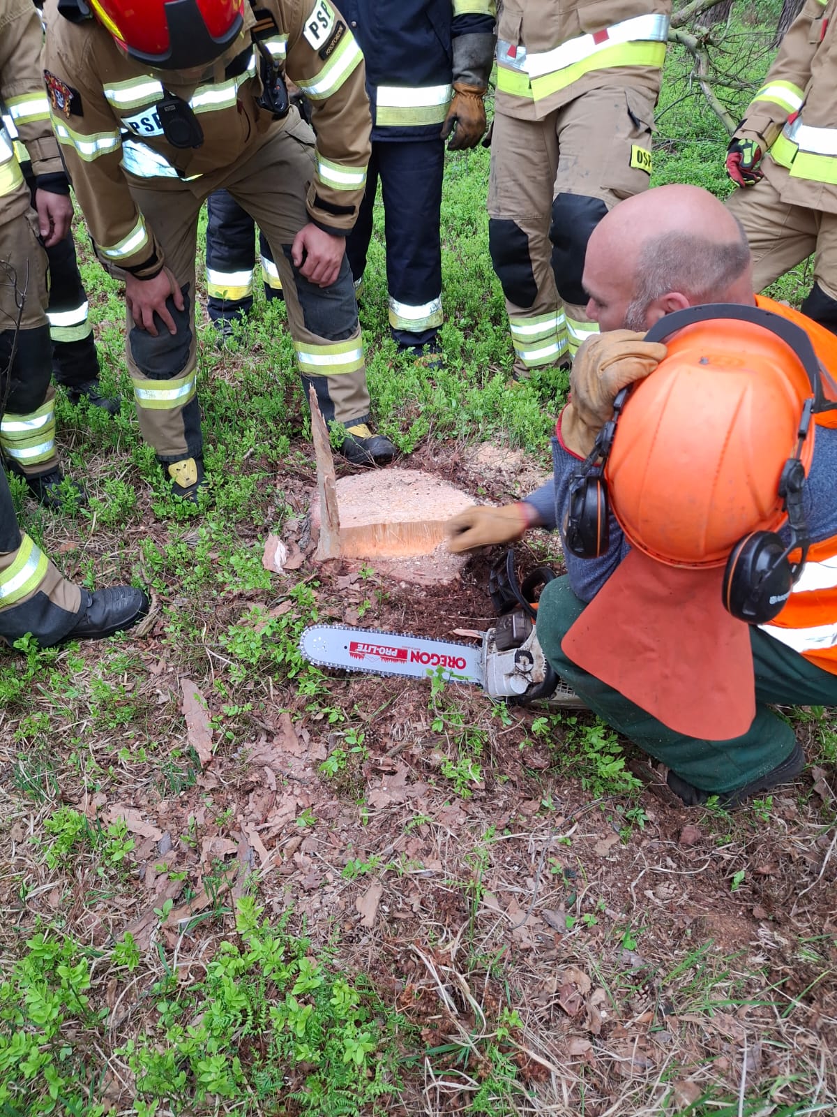 Zajęcia praktyczne dzięki bardzo dobrej współpracy z Nadleśnictwem Krotoszyn przeprowadzili doświadczeni pilarze Zakładu Usług Leśnych, którzy na co dzień zajmują się pozyskiwaniem i obróbką drewna w trudnych warunkach terenowych. Instruktorzy z Zakładu Usług Leśnych szczególną uwagę zwracali na techniki ciecia drzew pod naprężeniami oraz sposoby zapobiegania odbicia pnia, czyli jedną z najczęstszych i najgroźniejszych sytuacji przy tego typu działaniach. Wiedza i doświadczenie instruktorów były nieocenionym wsparciem dla strażaków pracujących z pilarką w sytuacjach zagrożenia.