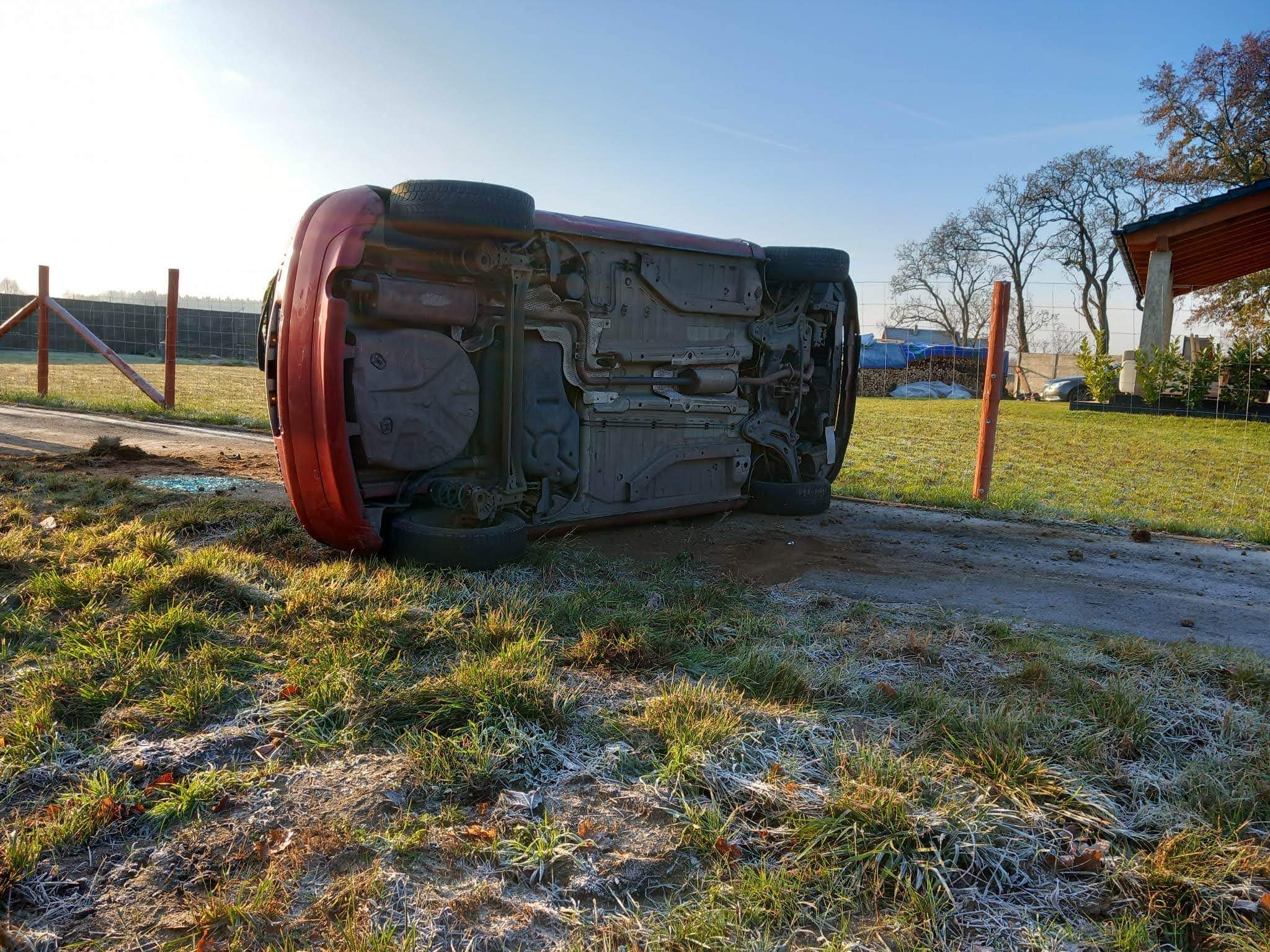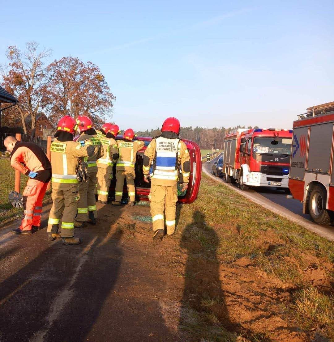 Strażacy po zabezpieczeniu terenu działań przystąpili do udzielania kwalifikowanej pierwszej pomocy jedynej uczestniczce zdarzenia, wykonując czynności adekwatne do poniesionych obrażeń. Po przybyciu służb medycznych i wykonaniu diagnostyki w karetce pogotowia, kierownik zespołu podjął decyzję o hospitalizacji kobiety. W dalszej części działań strażacy odłączyli akumulator w uszkodzonym pojeździe oraz zabezpieczyli wycieki płynów technicznych. Celem zabezpieczenia odcinka drogi objętego działaniami, na miesjcu wypadku wprowadzono ruch wahadłowy. Po zakończonych czynnościach dochodzeniowych realizowanych przez funkcjonariuszy Policji uszkodzony pojazd postawiono na koła i przemieszczono w miejsce niestwarzające zagrożeń. Z nawierzchni ścieżki komunikacyjnej przebiegającej wzdłuż jezdni usunięto zalegające elementy karoserii, ziemię oraz wyciek płynów eksploatacyjnych. Na tym działania zakończono i zastępy powróciły do miejsc stacjonowania. Działania straży pożarnej trwały ponad godzinę.