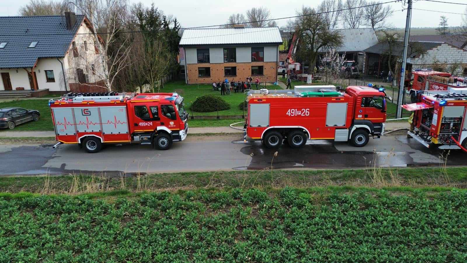 Po dotarciu na miejsce zdarzenia zastępów straży pożarnej kierujący działaniem ratowniczym ustalił, że pali się poddasze, na którym znajdowała się słoma, ogień przepalił poszycie dachu. W budynku na parterze znajdowały się króliki.