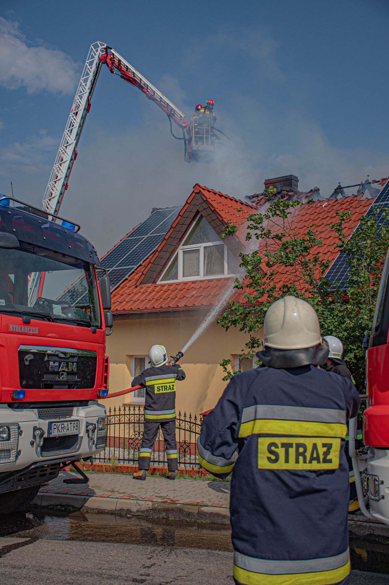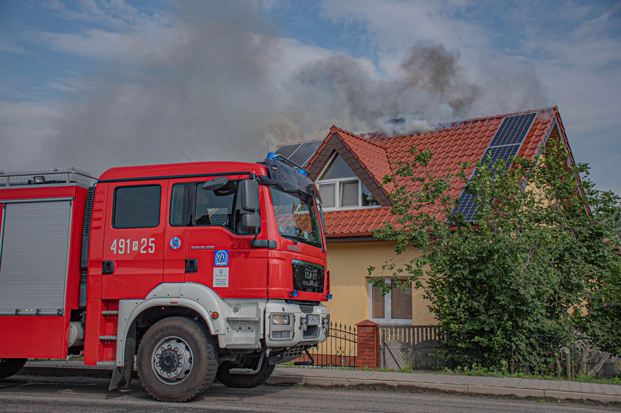 Po dotarciu na miejsce Jednostek Ochrony Przeciwpożarowej w wyniku przeprowadzonego rozpoznania ustalono, że pożarem objęte są pomieszczenia na poddaszu budynku, a ogień przepala konstrukcję dachową. Na jednej połaci dachowej zamontowana jest instalacja fotowoltaiczna, która narażona jest na oddziaływanie pożaru. Mieszkańcy opuścili budynek samodzielnie i nie uskarżali się na żadne dolegliwości.